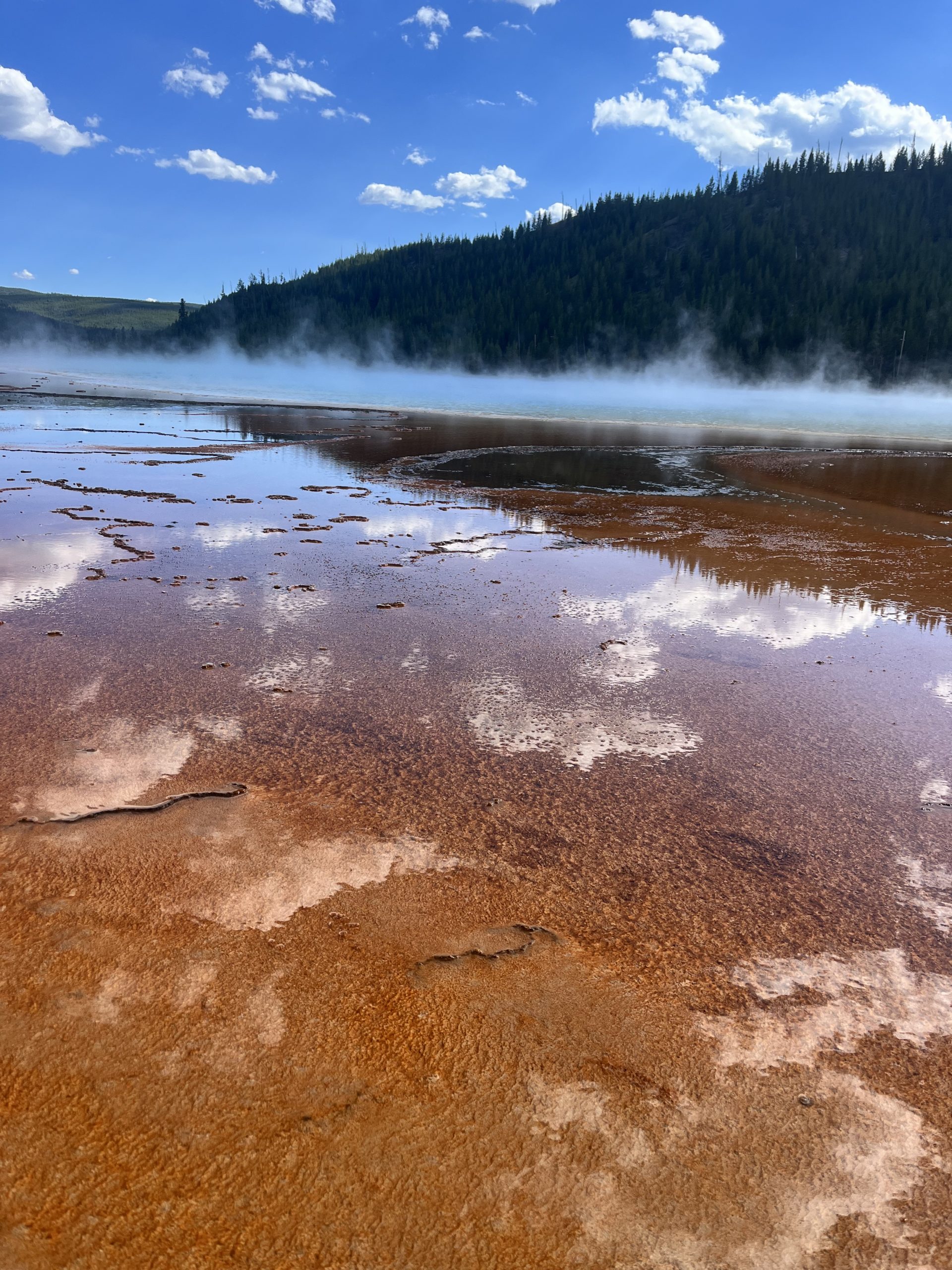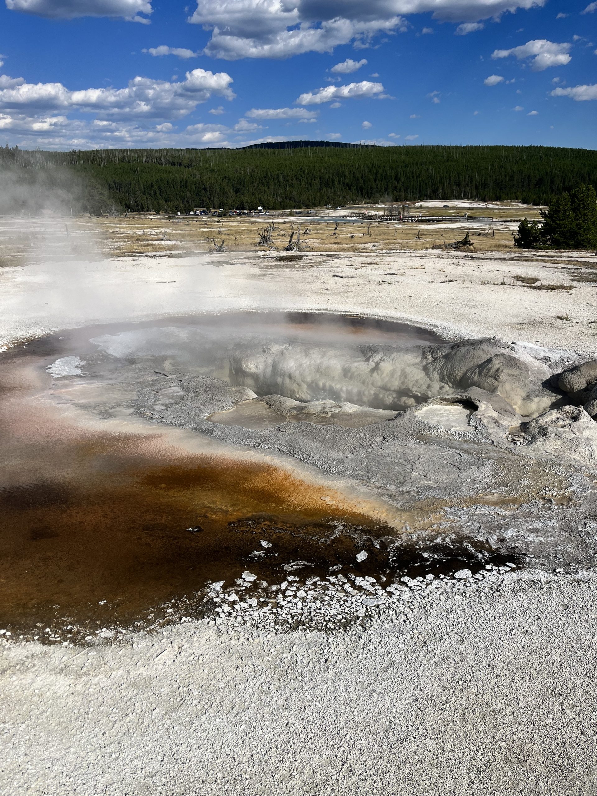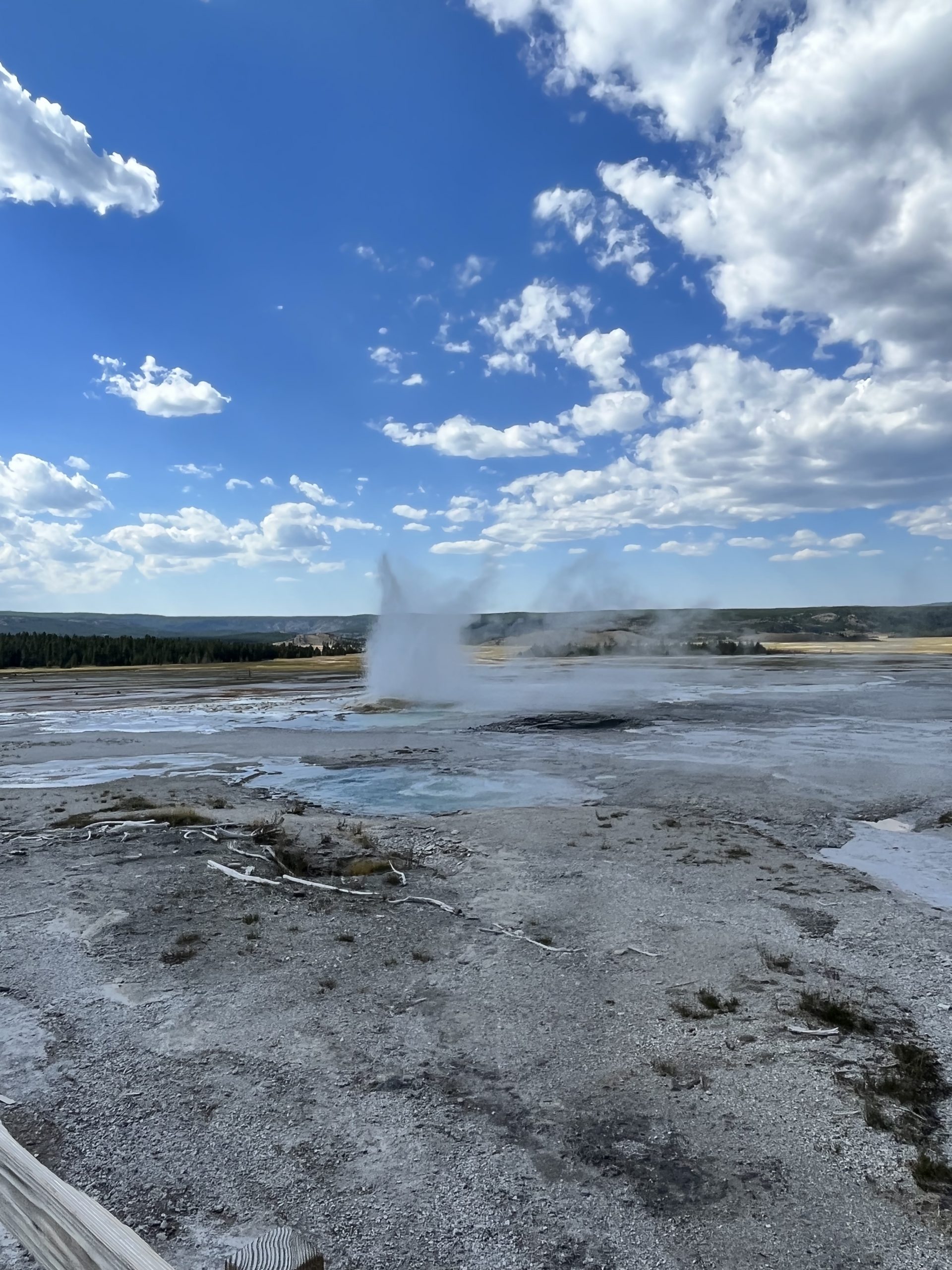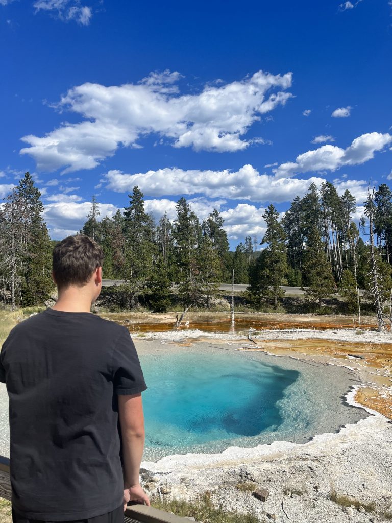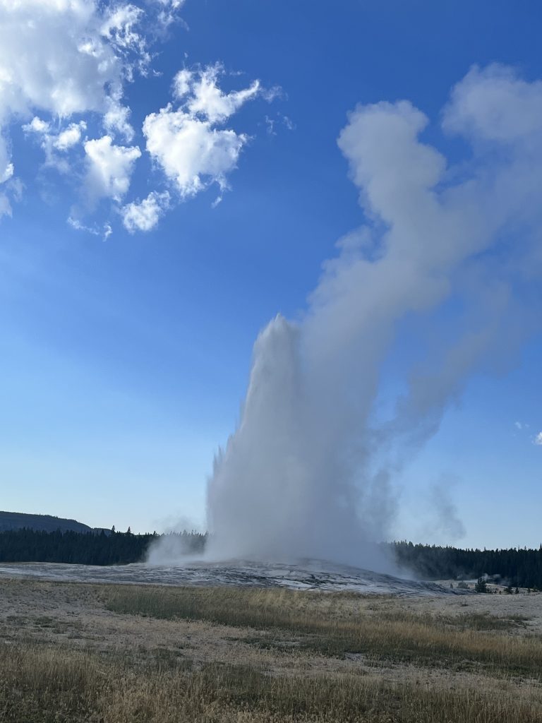In den nächsten Stunden, hielten wir immer wieder an, da es entweder heiße Quellen oder dampfende Erdlöcher gab. Irgendwann kamen wir zum „Old Faithful“ ein Geysir, der aller 90 min ausbricht, was sehr untypisch für Geysire ist. Dort warteten wir eine halbe Stunde und schauten uns das Natur-Schauspiel an. Es war echt beeindruckend, wie heißes Wasser einige Meter in die Luft geschleudert wird.