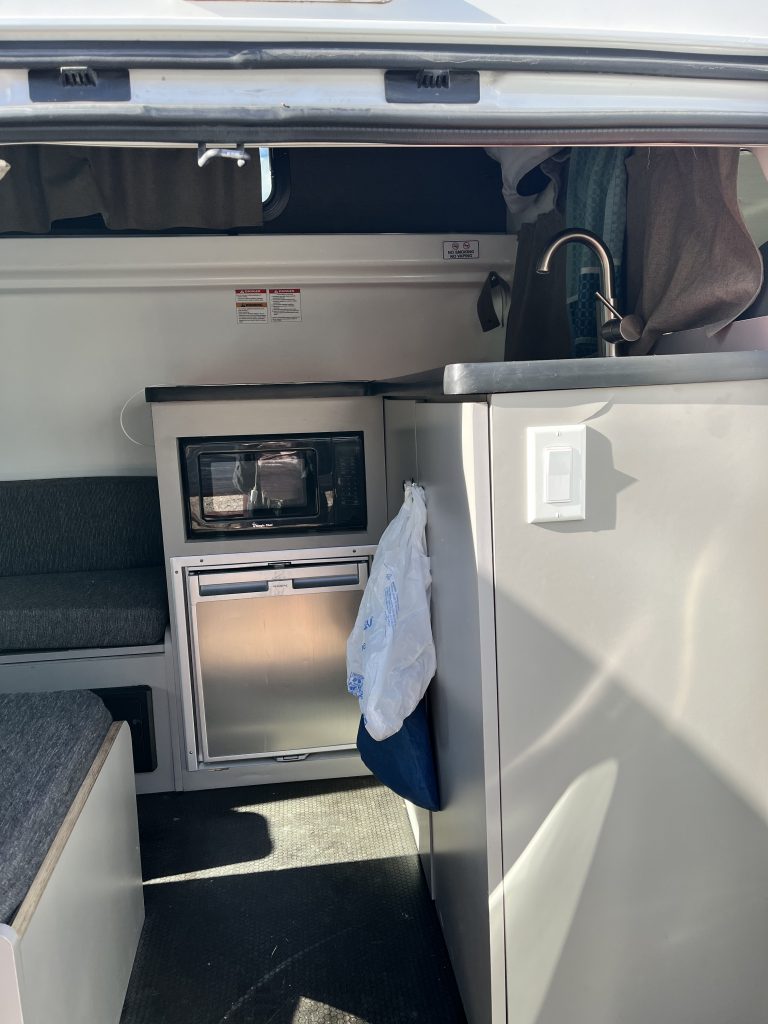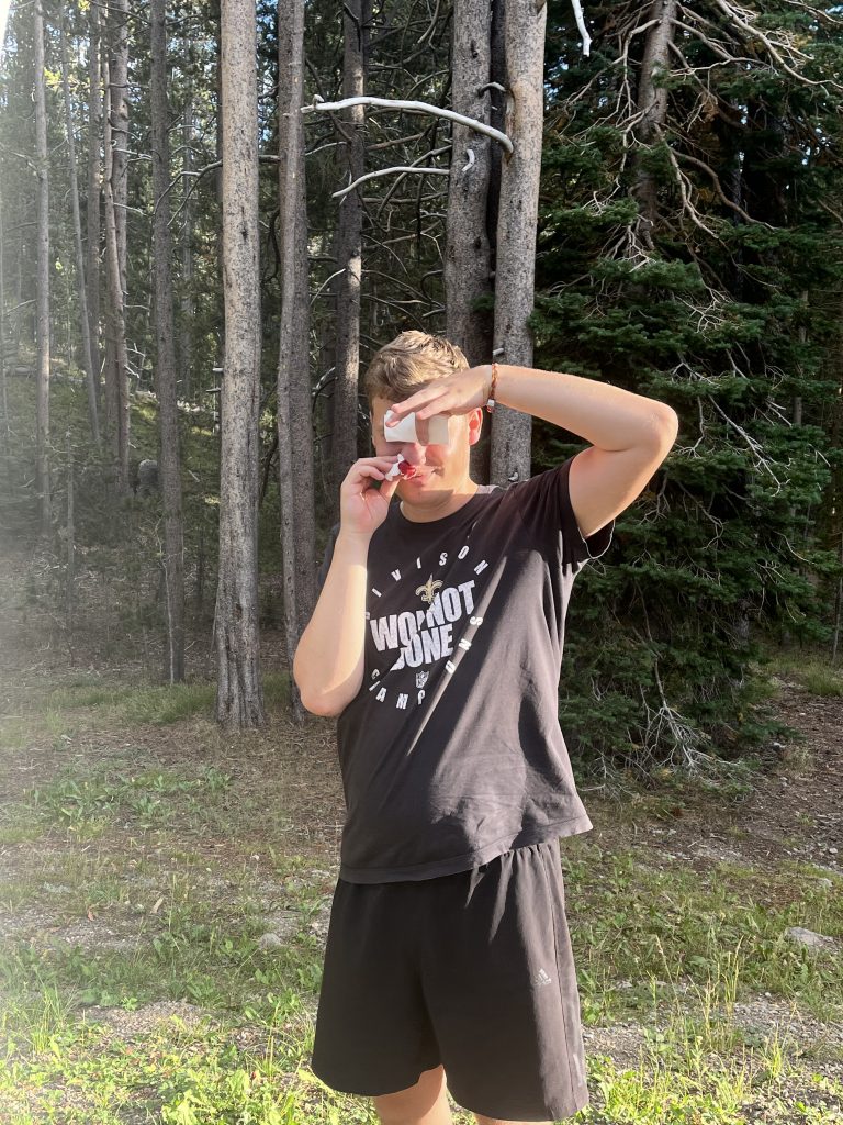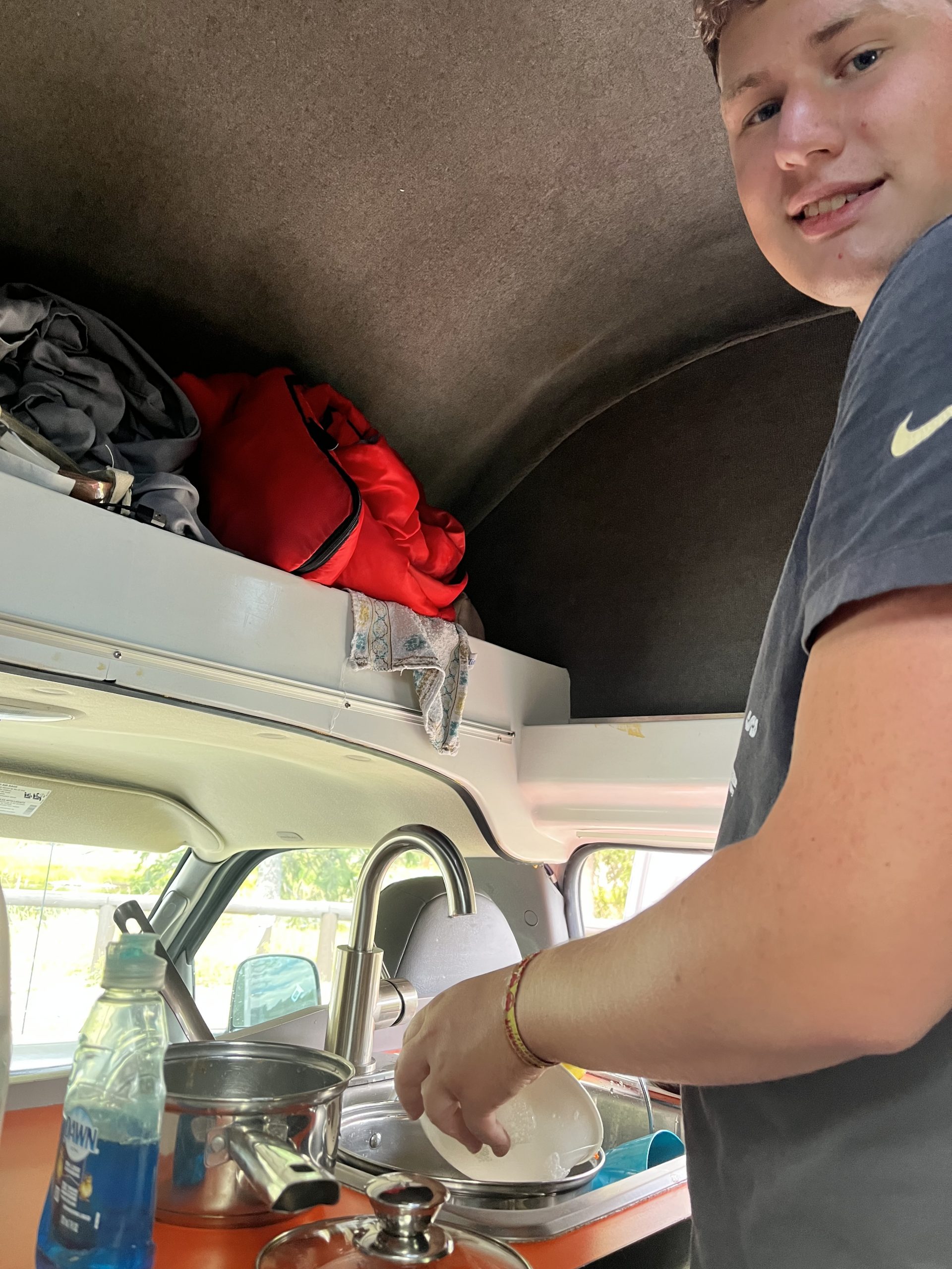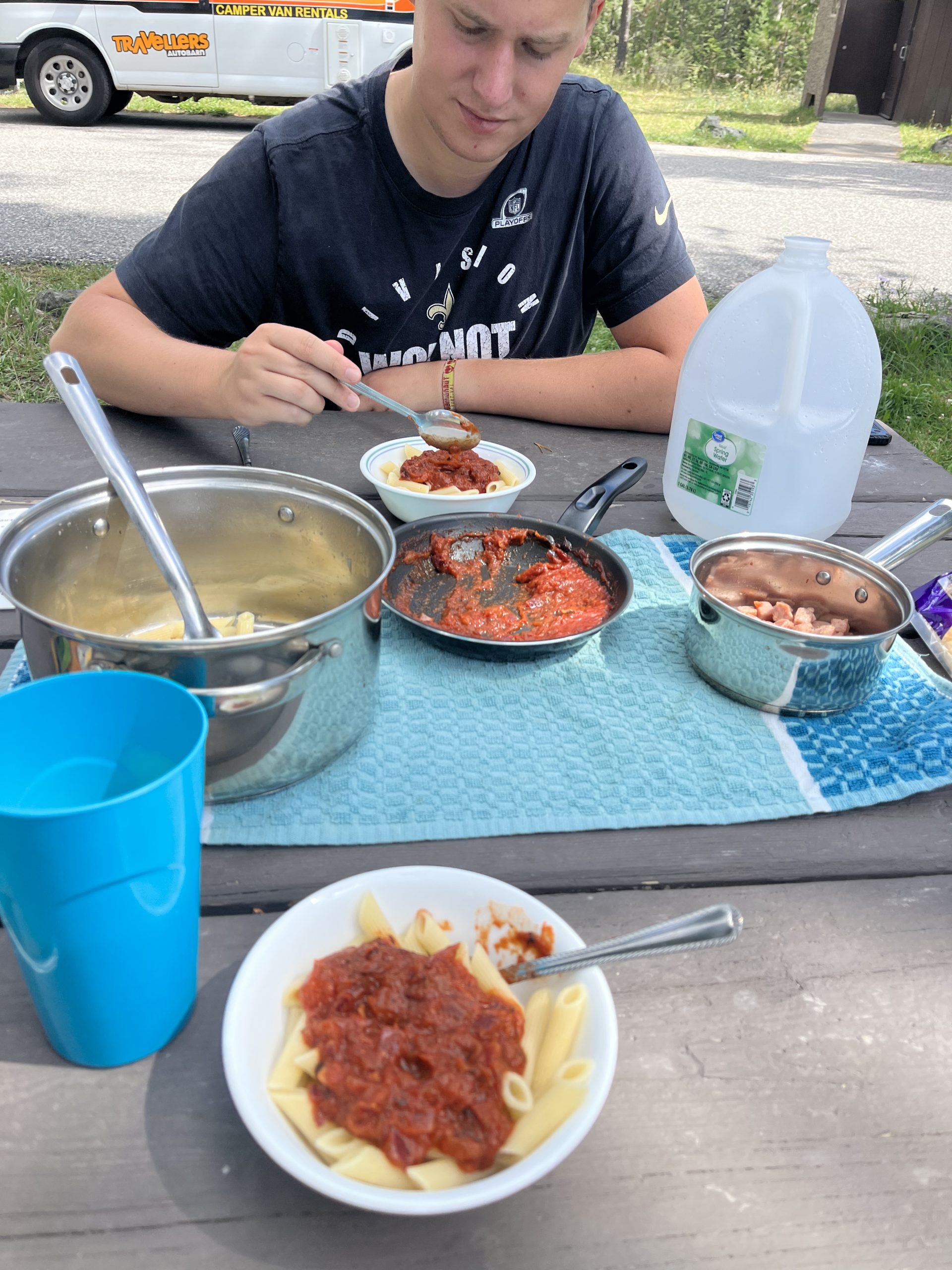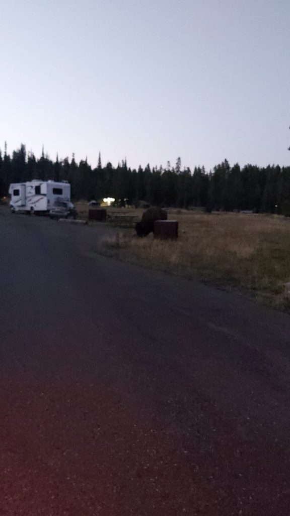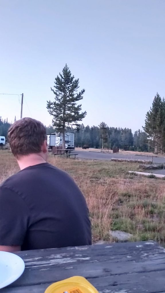 Als wir unseren Platz bezogen hatten, setzten wir uns auf die Bank und machten Abendbrot. Heute gab es Toast mit Aufstrich. Ich ließ meinen Blick schweifen und er blieb an einem braunen Etwas hängen. „Ist das ein Bison?“ fragte ich Ben, doch dieser verneinte, da der braune Fleck sich angeblich nicht bewegte. Doch als ich genauer hin sah fiel mir auf, dass es wirklich ein Bison ist, was auf der Wiese mitten auf dem Campingplatz zwischen den Campern graste. Nichts wie hin! Wir gingen bis auf einige Meter ran und bewunderten das große Tier, welches einfach so ohne Zaun auf dem Campingplatz stand und genüsslich fraß. Als wir uns satt gesehen hatten, gingen wir zurück zum Camper Van, spielten noch ein paar Runden bis 10.000 und gingen anschließend schlafen.