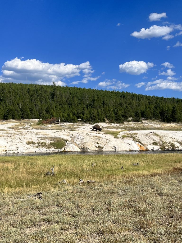 Anschließend fuhren wir weiter durch den Park. Auf einmal standen viele Autos an der Straße und Menschen die Fotos machten. „Da muss was spannendes sein!“ sagte Ben und so drehten wir kurzerhand um und tatsächlich, es stand ein Bison an der Straße, welches genüsslich sein Gras fraß. Nachdem wir Bilder gemacht hatten, fuhren wir weiter.