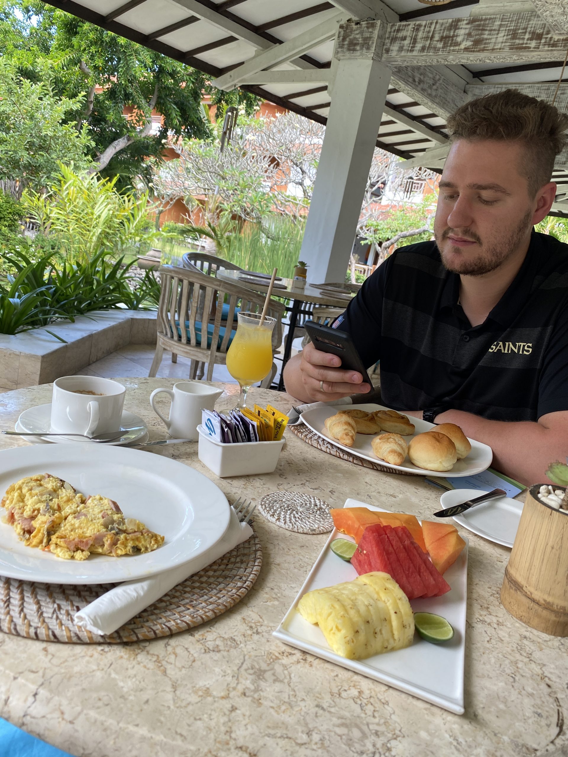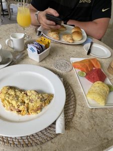 Nach dem Treffen mit dem Reisebegleiter, war das Frühstück schon geschlossen. Da es in diesem Restaurant 24/7 Essen a la card gibt, haben wir es trotzdem versucht. Nach einem kurzen Hin und Her kam eine Bedienung zu uns und bot uns an, nochmal richtiges Frühstück zu servieren. So bekam ich ein Omelett und Tim Brötchen und Croissant.