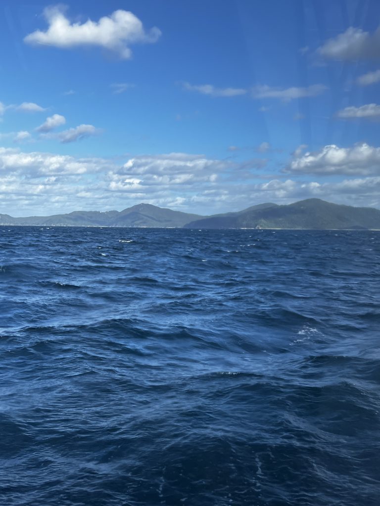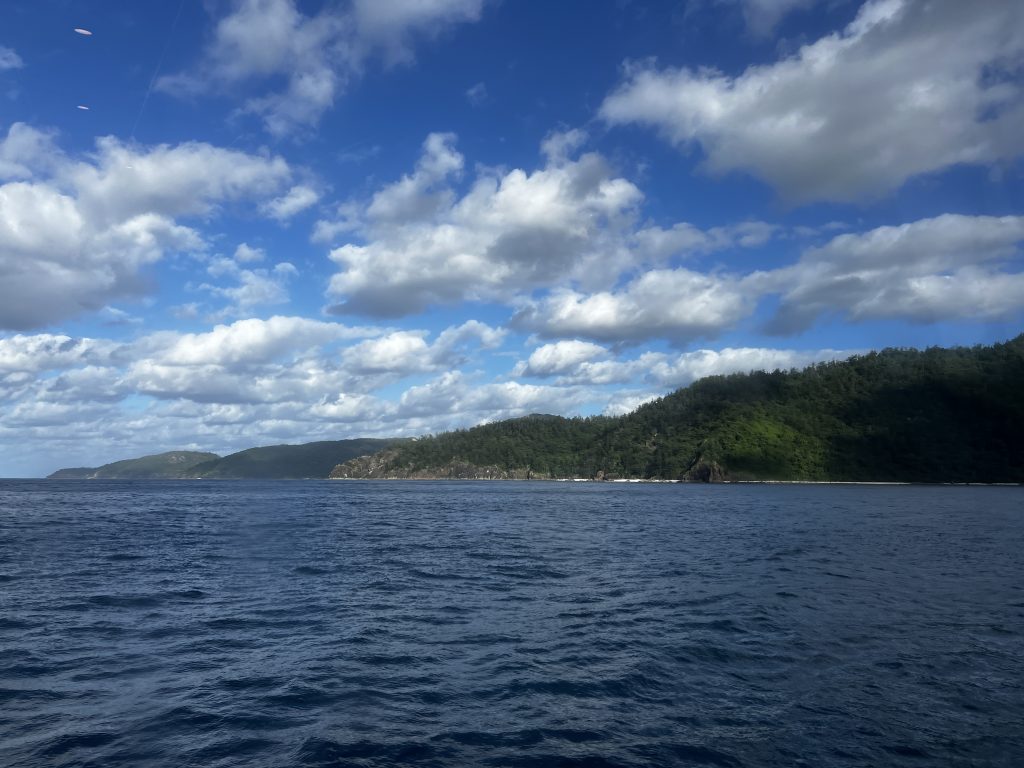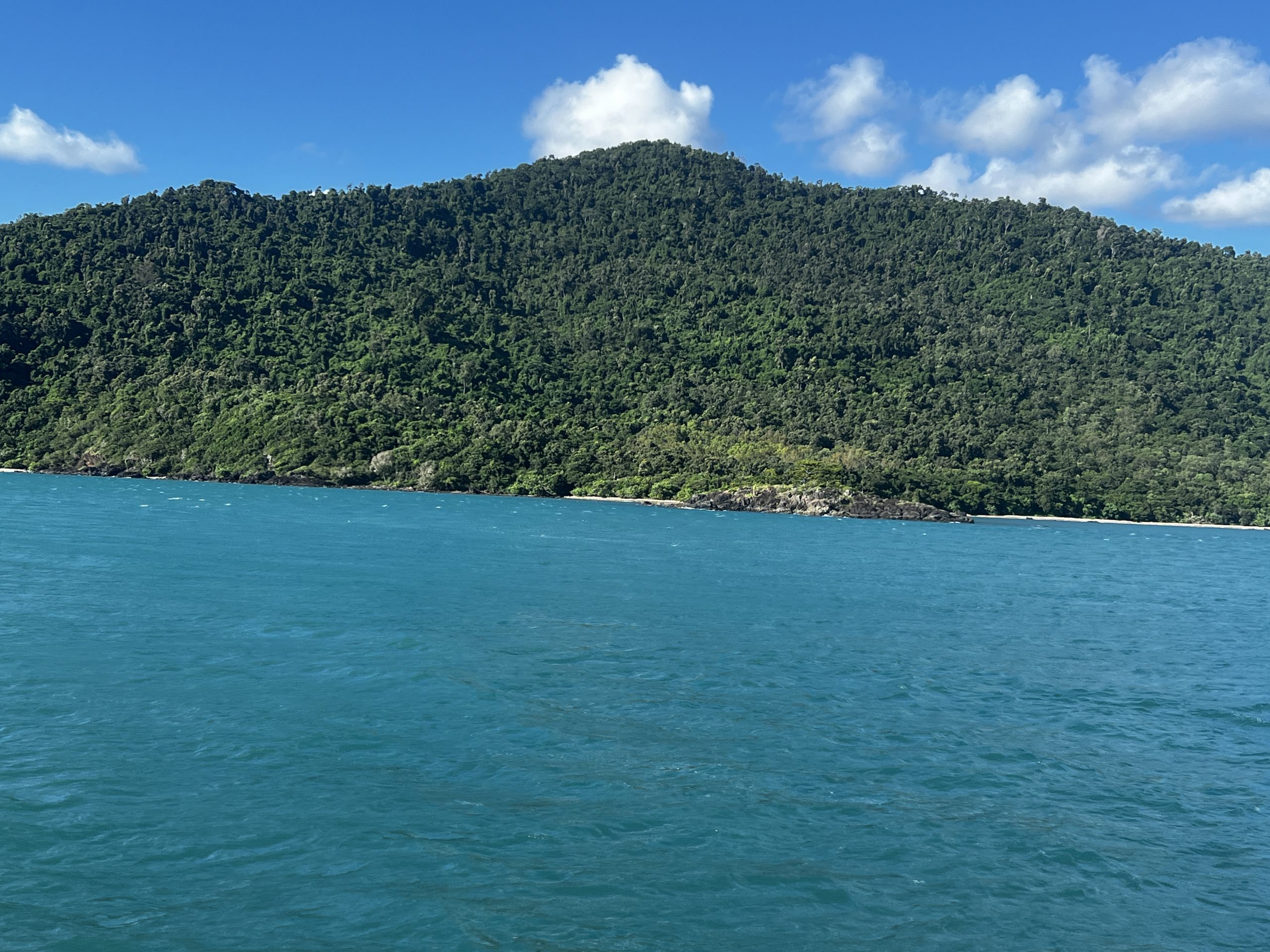 Dann läuft alles locker fluffig. Und 08:00 Uhr ungefähr legen wir ab. Nach einer Stunde ist Zwischenstopp in Hamilton Island und dann geht’s hinaus aufs Meer. Wir werden vor rauer See gewarnt und sollen bitte sitzen bleiben. Ist ja wie im Flugzeug. Nicht alle behalten ihr Frühstück bei sich, aber die Crew ist extrem hilfsbereit. Jan und ich vertragen die Fahrt gut. Wir denken, wir hatten da schon Schlimmeres.