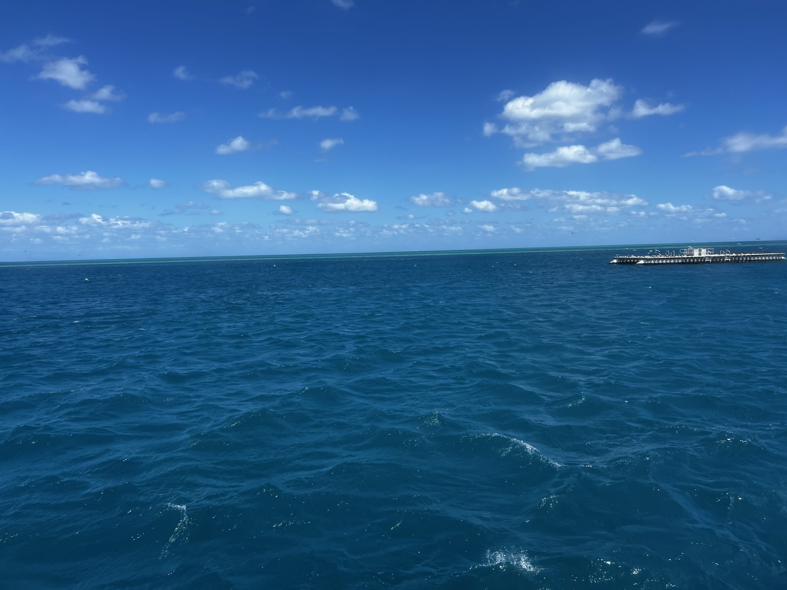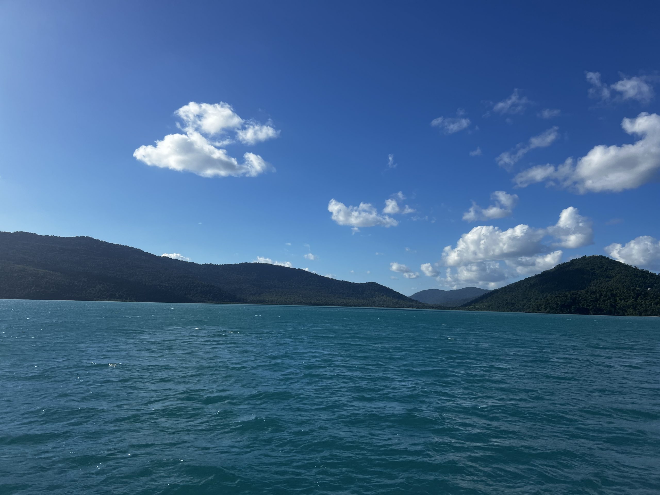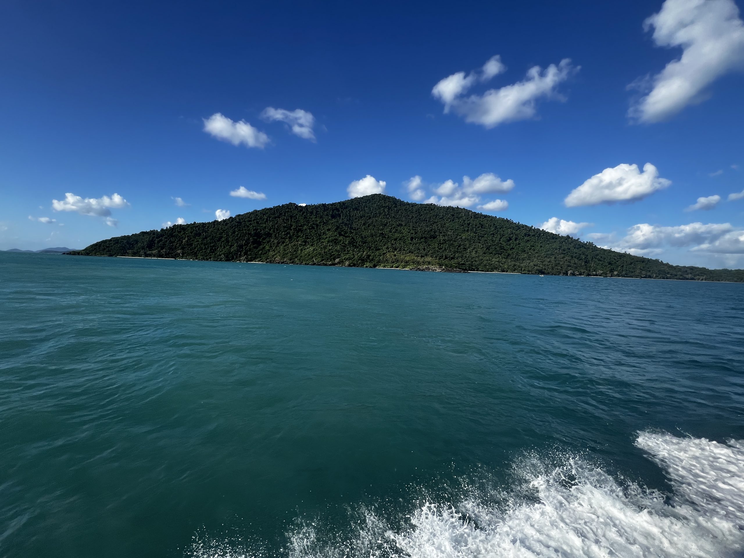 Dann läuft alles locker fluffig. Und 08:00 Uhr ungefähr legen wir ab. Nach einer Stunde ist Zwischenstopp in Hamilton Island und dann geht’s hinaus aufs Meer. Wir werden vor rauer See gewarnt und sollen bitte sitzen bleiben. Ist ja wie im Flugzeug. Nicht alle behalten ihr Frühstück bei sich, aber die Crew ist extrem hilfsbereit. Jan und ich vertragen die Fahrt gut. Wir denken, wir hatten da schon Schlimmeres.