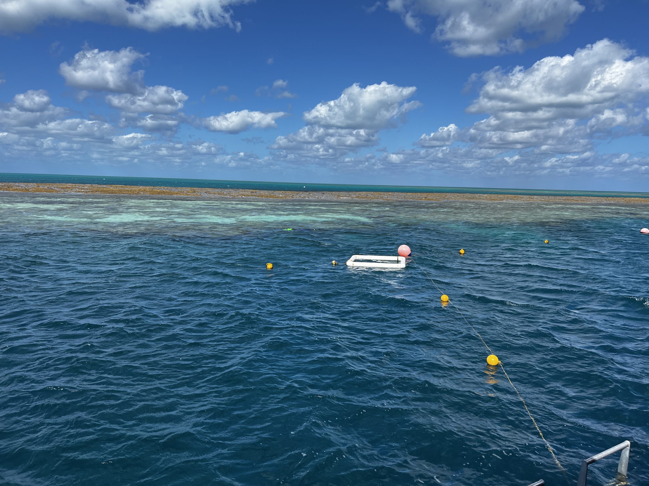 Dann sind wir am Riff. Es gibt ein paar Bootsanlehestellen, einen Hubschrauber Landeplatz und ein Glasbodenboot. Also alles womit man Touristen Geld abknöpfen kann.