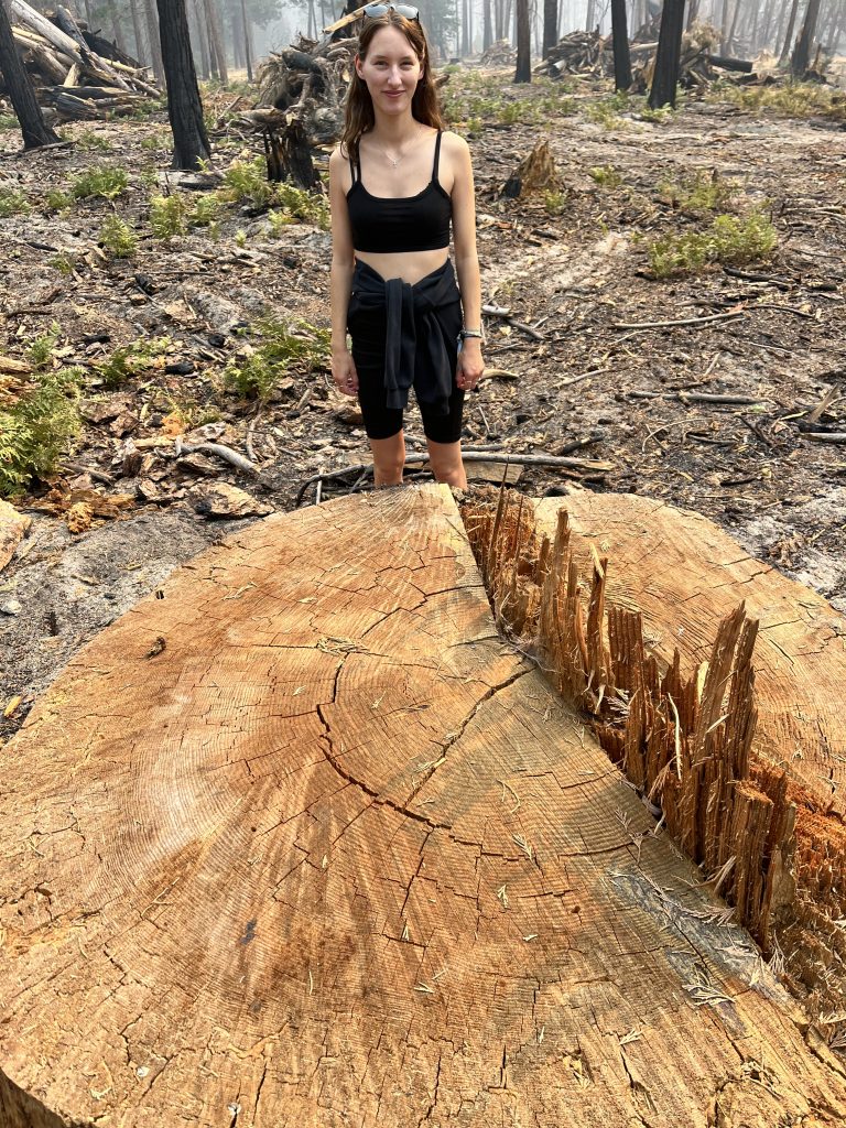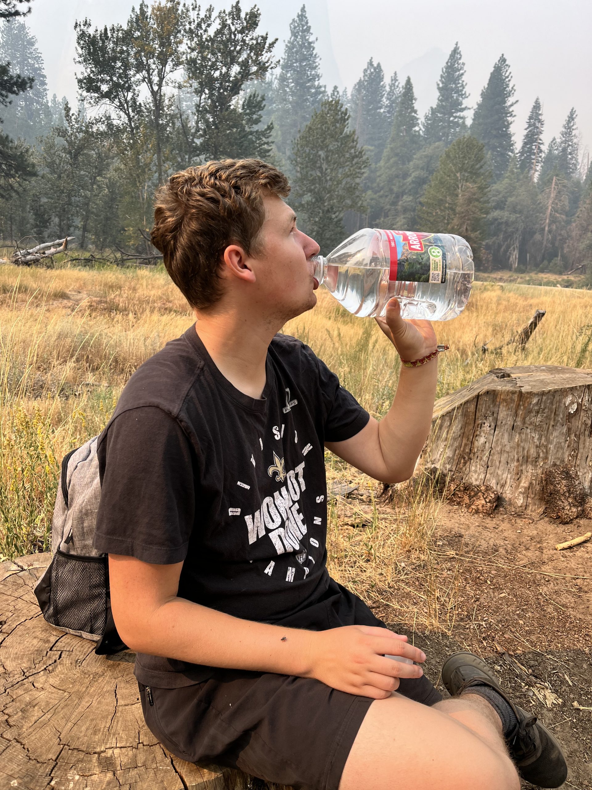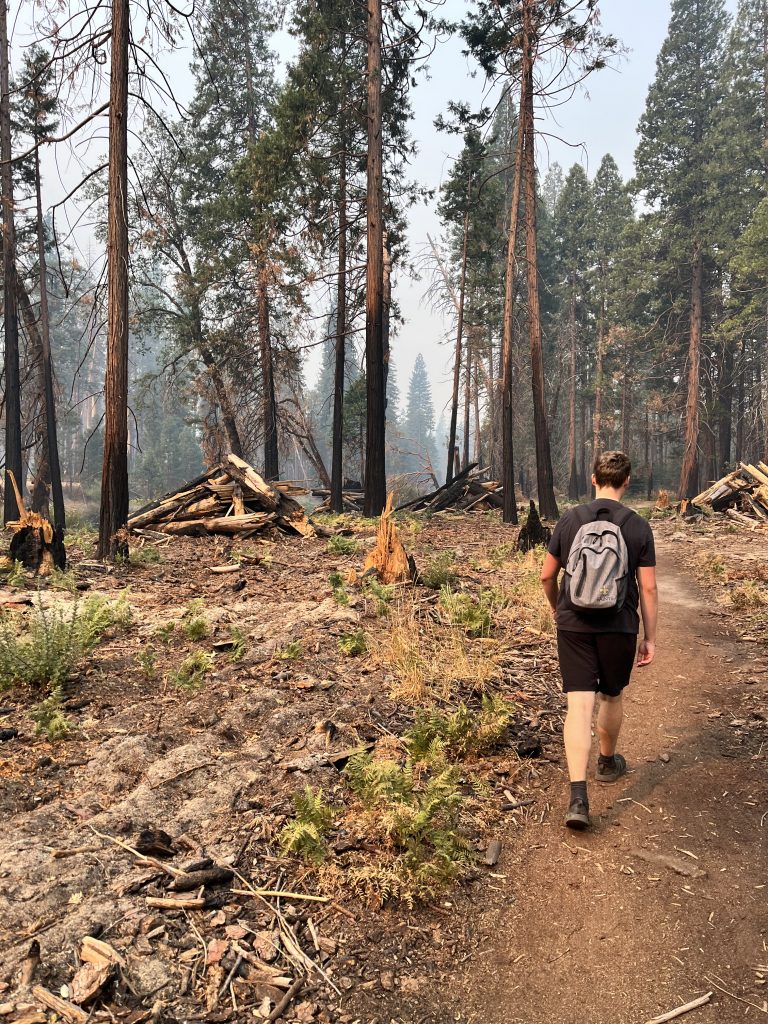 Wir liefen los und um uns herum war nichts außer Natur und sehr nervige kleine Fliegen die einem ständig ins Gesicht flogen. Doch sie waren nur phasenweise da uns wir konnten die Wanderung genießen. Der Weg führte uns am Fluss entlang über Wiesen und durch Wälder. Wir sahen viele Eichhörnchen, die die Bäume hoch und runter kletterten. Als uns die Route durch die Wälder schickte, waren viele Bäume am Stamm schwarz von dem Feuer, was es gegeben hatte. Später stellten wir fest, dass das Feuer hier absichtlich gelegt wurde, um die Bäume auf größere Waldbrände vorzubereiten.