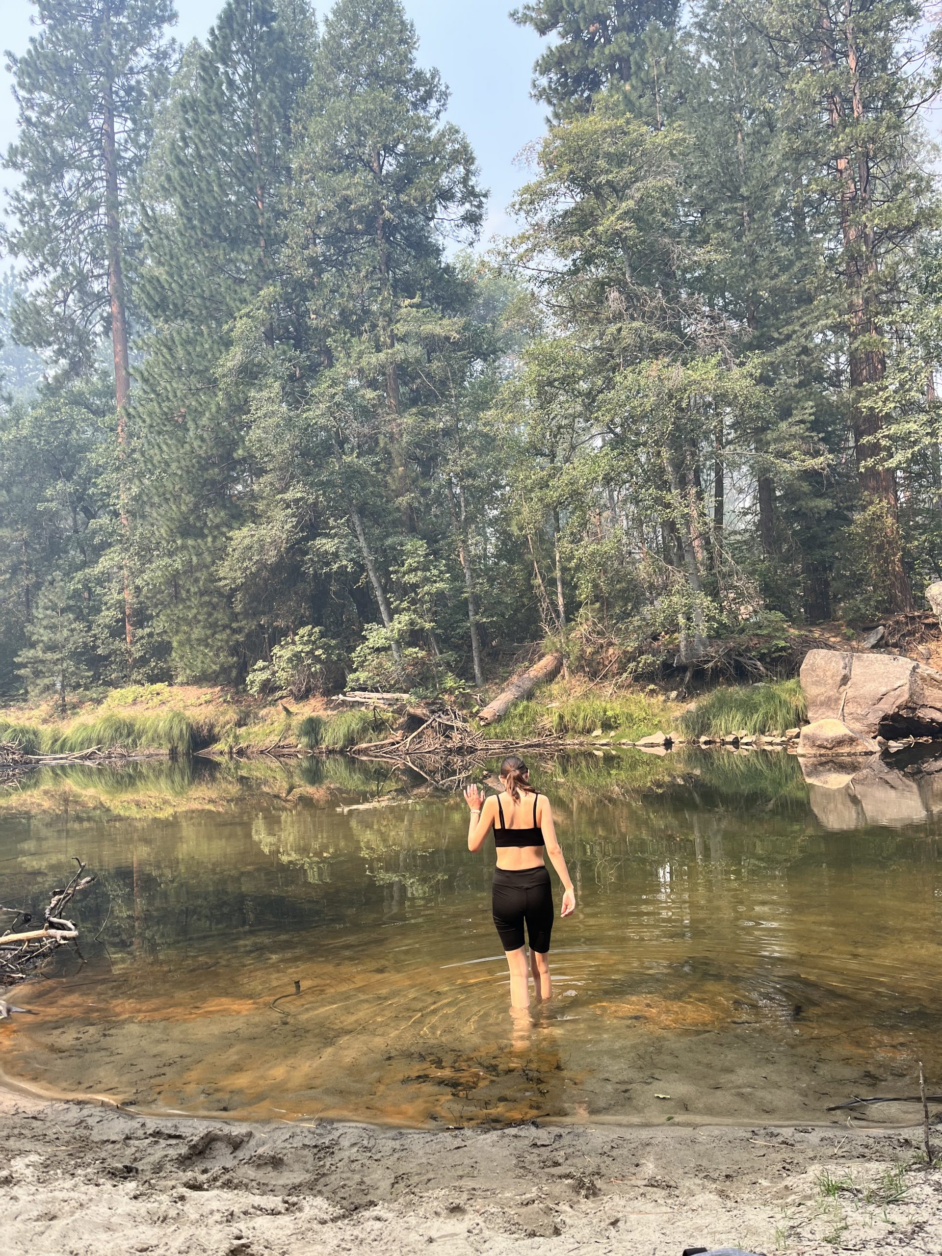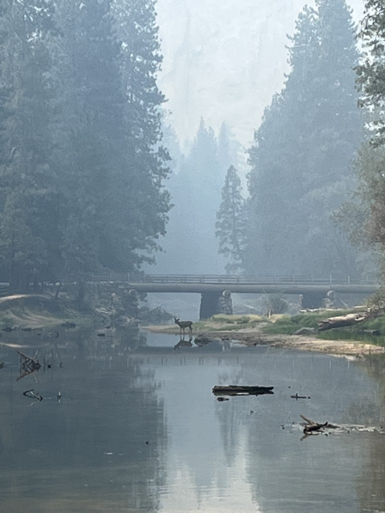 Nach ungefähr der Hälfte kamen wir bei der El Capitan Brücke an. Dort machten wir ein paar Bilder. Da es von dort auf der anderen Seite des Flusses wieder zurück ging, überquerten wir die Brücke und gingen am Fluss weiter entlang. Dort sahen wir fünf Rehe und ein Rehkitz, die am Wasser grasten. Im Fluss kühlte ich mich ab und anschließend stellten wir fest, dass wir uns auf dem falschen Weg befanden. Also gingen wir zu der Brücke zurück und nahmen dann die richtige Abbiegung.