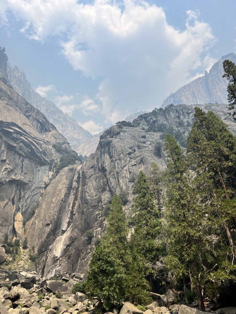 Immer wenn wir unseren Blick nach oben schweifen ließen, sahen wir die hohen Felswände, die das Tal umsäumten. Sie sahen aus, wie auf einer Leinwand, da sie noch leicht im Nebel verhüllt waren.