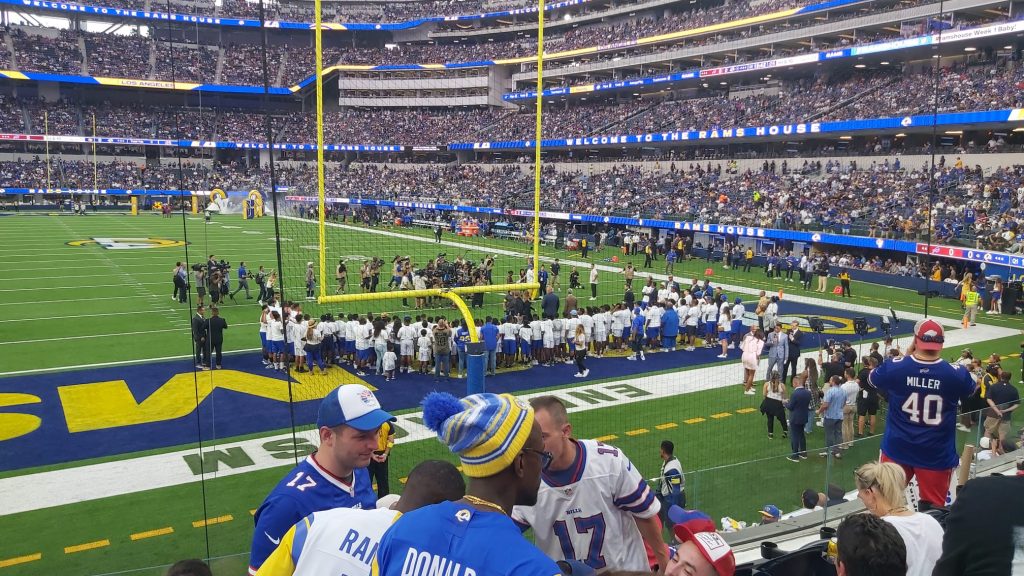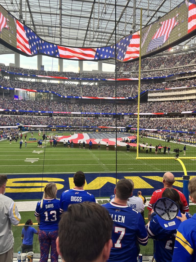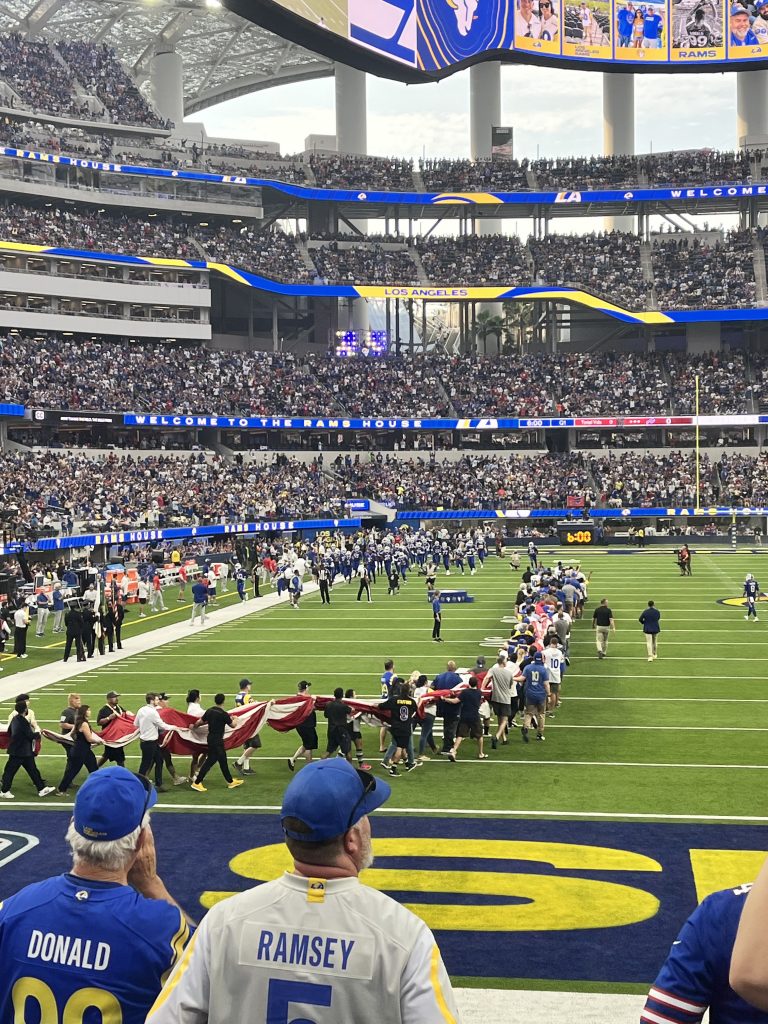 Anschließend wurde eine riesige USA-Flagge (natürlich in Form der USA) aufs Spielfeld getragen und eine Sängerin sang die National-Hymne. Dwayne „The Rock“ Johnson hielt noch eine motivierende Ansprache und dann kamen die Spieler der Los Angeles Rams und der Buffalo Bills aufs Spielfeld gerannt, jetzt konnte es losgehen.
