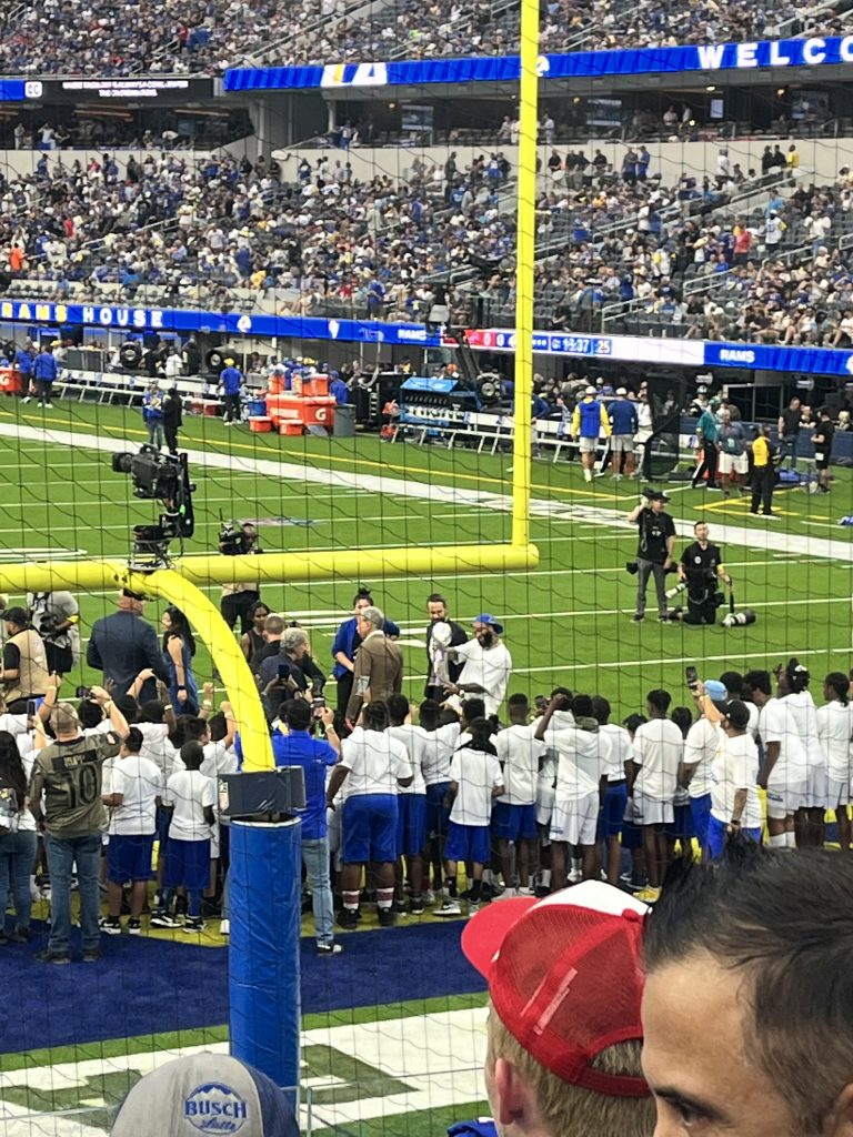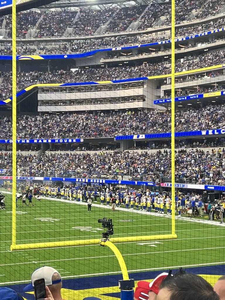Auf unseren Plätzen angekommen, warteten wir nicht lang, bis das Spektakel los ging. Zuerst kam Odell Beckham Junior ins Stadion, ein Spieler der Los Angeles Rams, dieser war leider verletzt, doch kam vor dem Spiel aufs Feld und begrüßte die Menschen mit der „Vince-Lombardi-Trophy“, die es als Belohnung für den Superbowl-Sieg im Februar gab.
