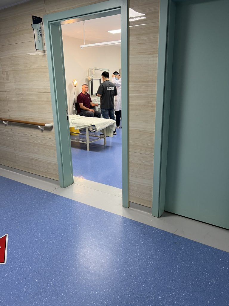 Da Karsten bereits seit gestern Probleme mit den Ohren hat, haben wir Chenggen um Rat gefragt. Ohne zu zögern, hat er uns alle mit ins Krankenhaus genommen. Da er selbst auch noch nicht dort war, war es eine kleine Odyssee bis wir den richtigen Fahrstuhl, die richtige Etage und das richtige Zimmer gefunden haben.