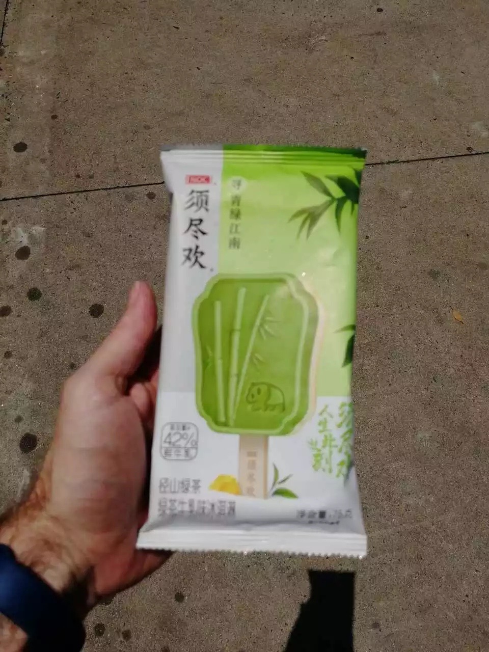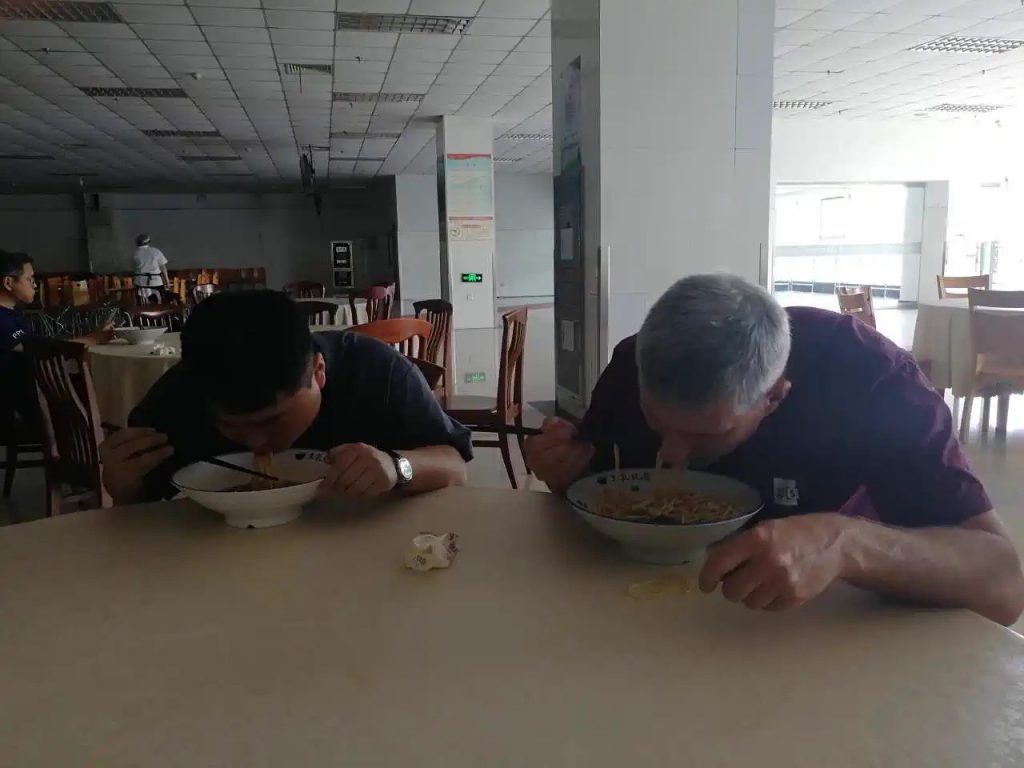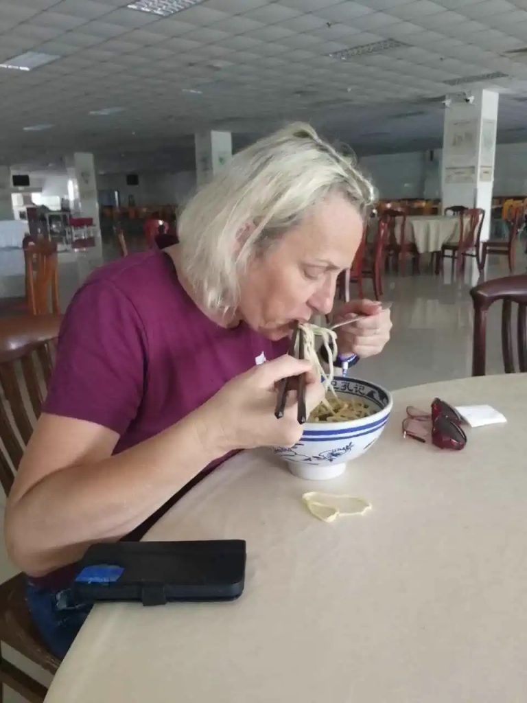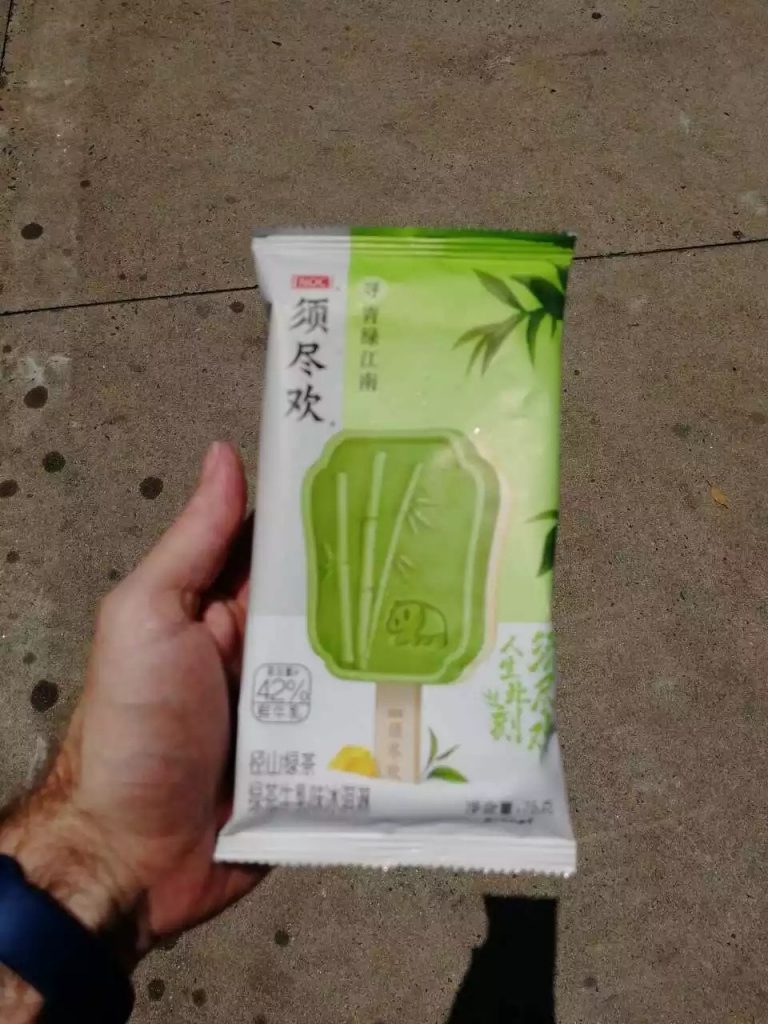 Zu Mittag wollte uns Chenggen eigentlich zum einem Gericht mit Reis bringen, aber es war schon fast alles alle – außer Nudeln. Somit gab es heute wieder leckere Nudeln – mit Stäbchen. Ich denke, wir werden schon besser beim Essen. Trotzdem sah mein T-Shirt immer noch reichlich bekleckert danach aus. Als Trost lud uns Chenggen auf ein Eis ein – wir wählten „Grünen Tee“.