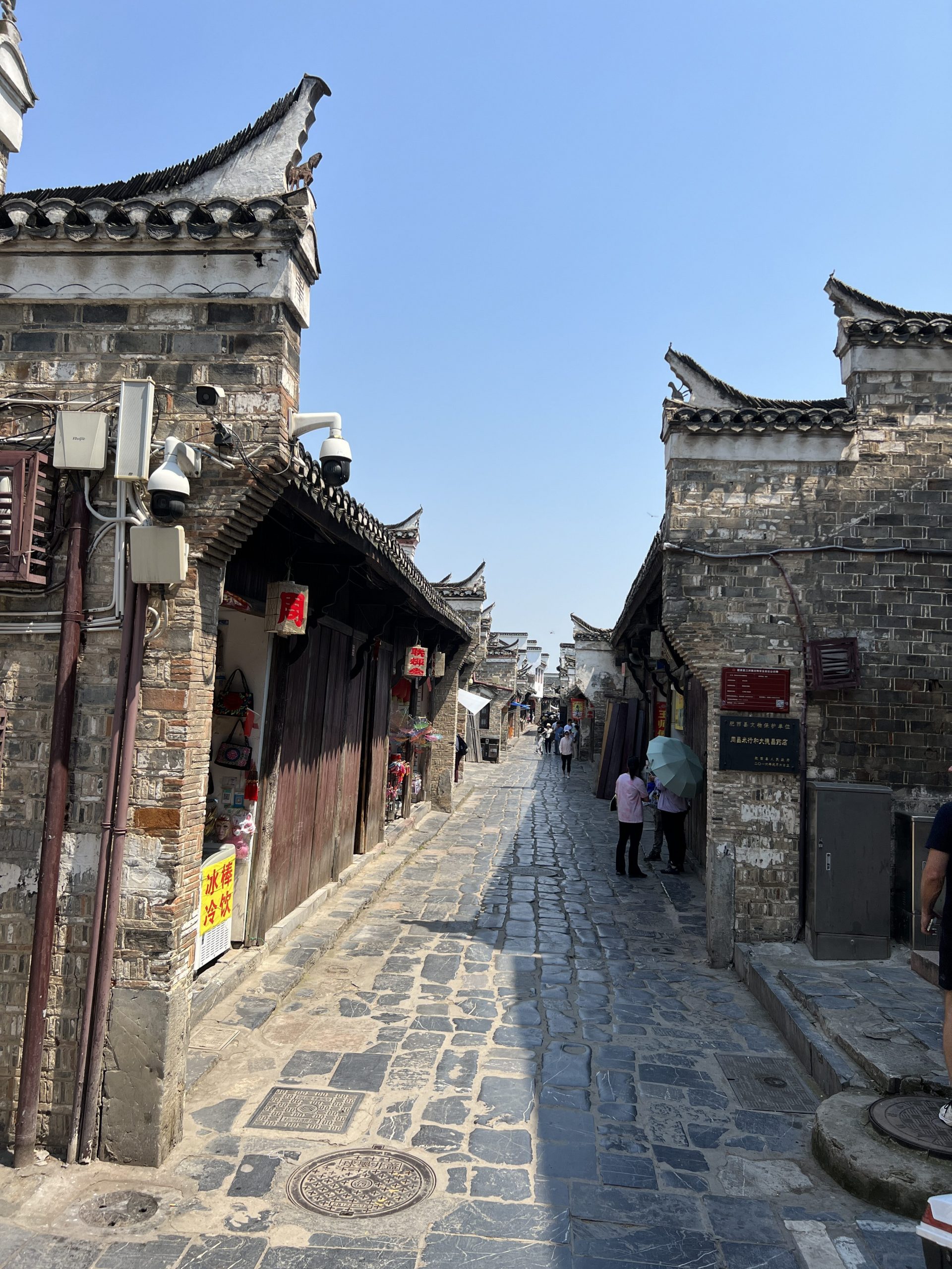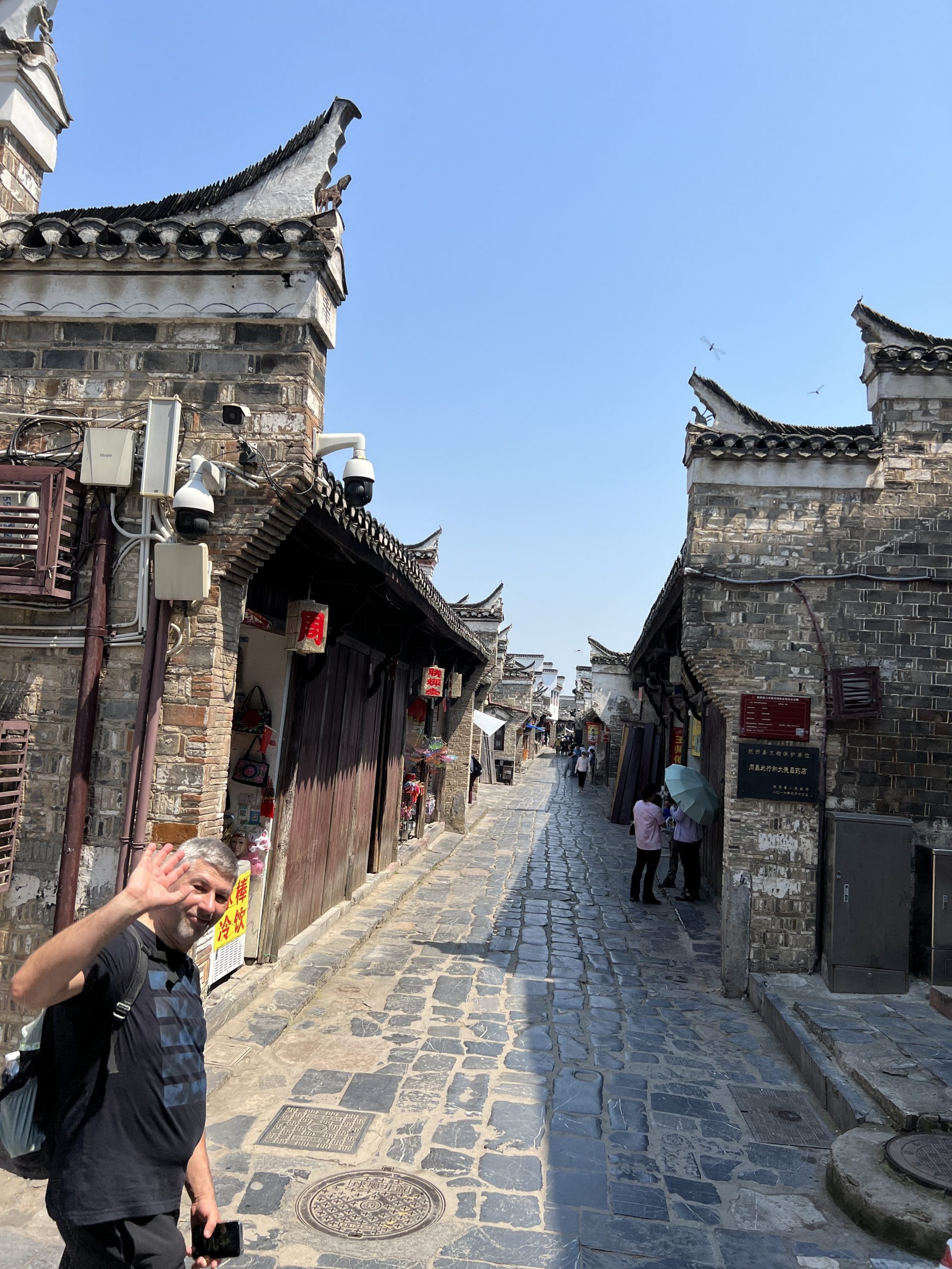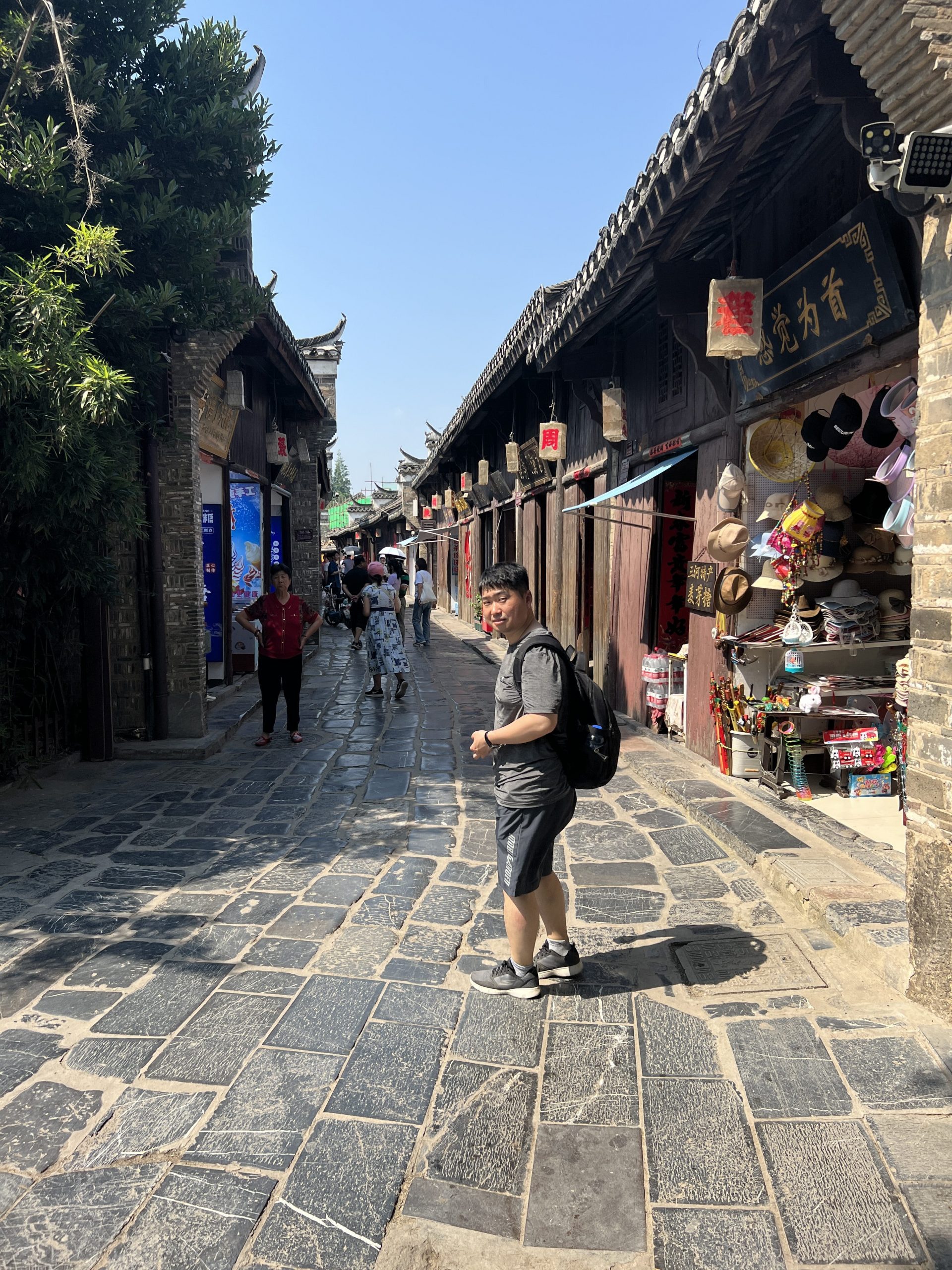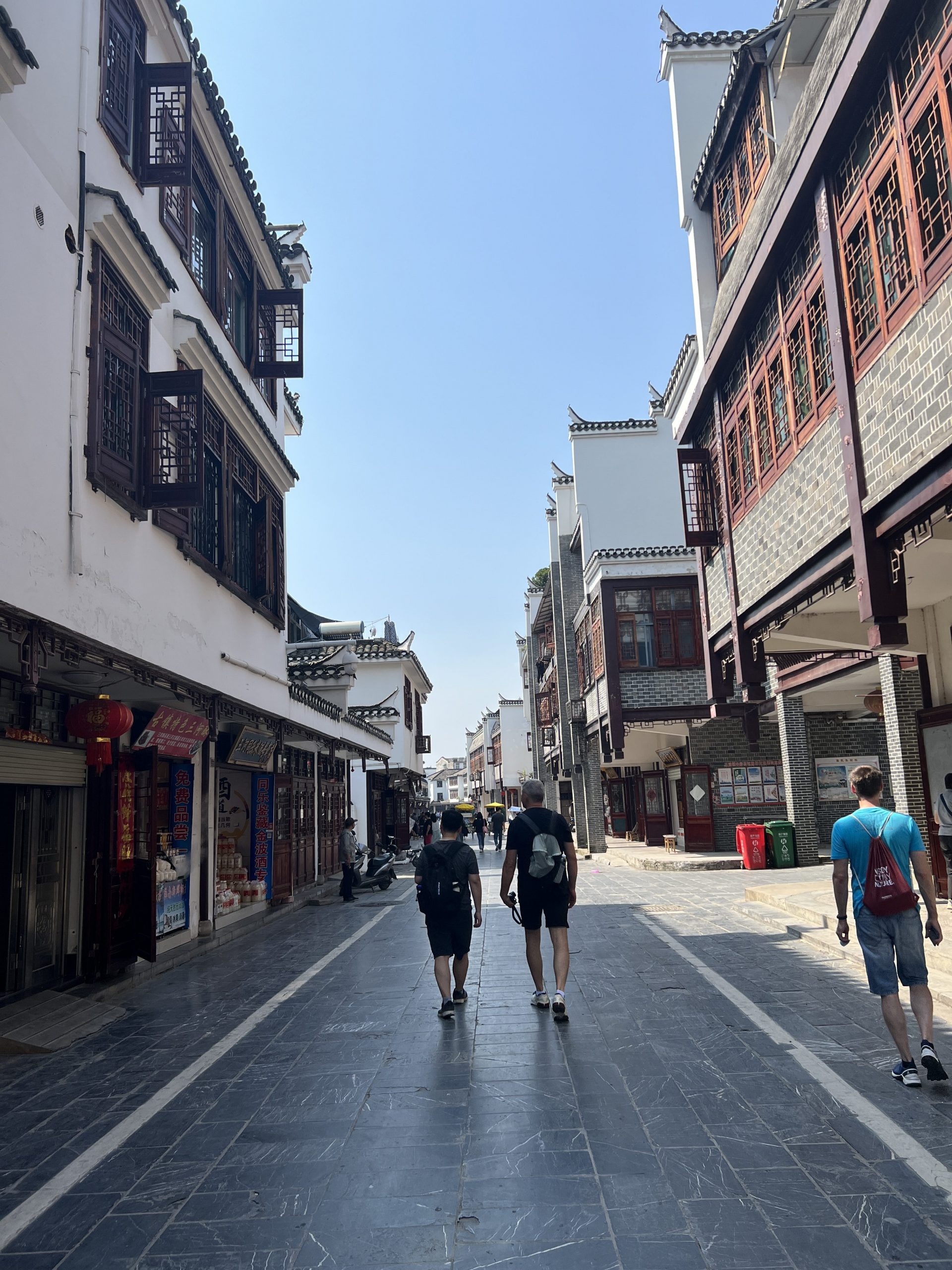 Auf dem Weg dorthin halten wir in Sanhe Ancient Town. Dieser Stadtteil hat eine 2500 jährige Geschichte und entstand am früheren Flusslauf des Yangtze River. Im chinesischen heißt die Stadt Three Rivers nach den Xiaonan, Hangfu und Fengle Flüssen, welche durch die Stadt flossen. Viele der Gebäude sind aus der Ming und Ding Dynastie. Es ist sehr beeindruckend, diese Gebäude zu sehen. In manchen befinden sich auch kleine Museen. In fast allen kann man Süßigkeiten, Souvenirs, Schildkröten, traditionelle Kleider usw. kaufen. Es macht richtig Spaß hier entlang zu laufen.