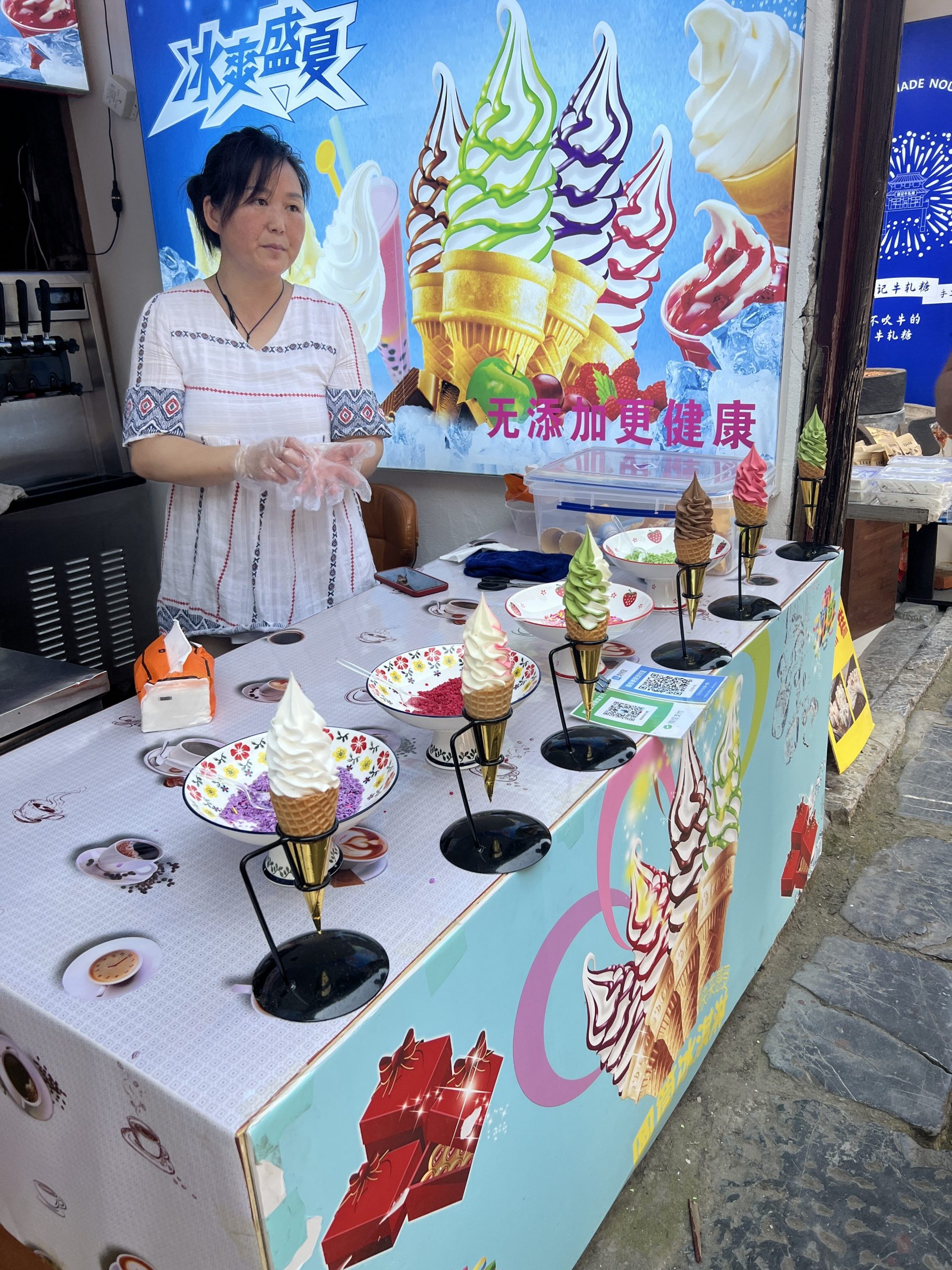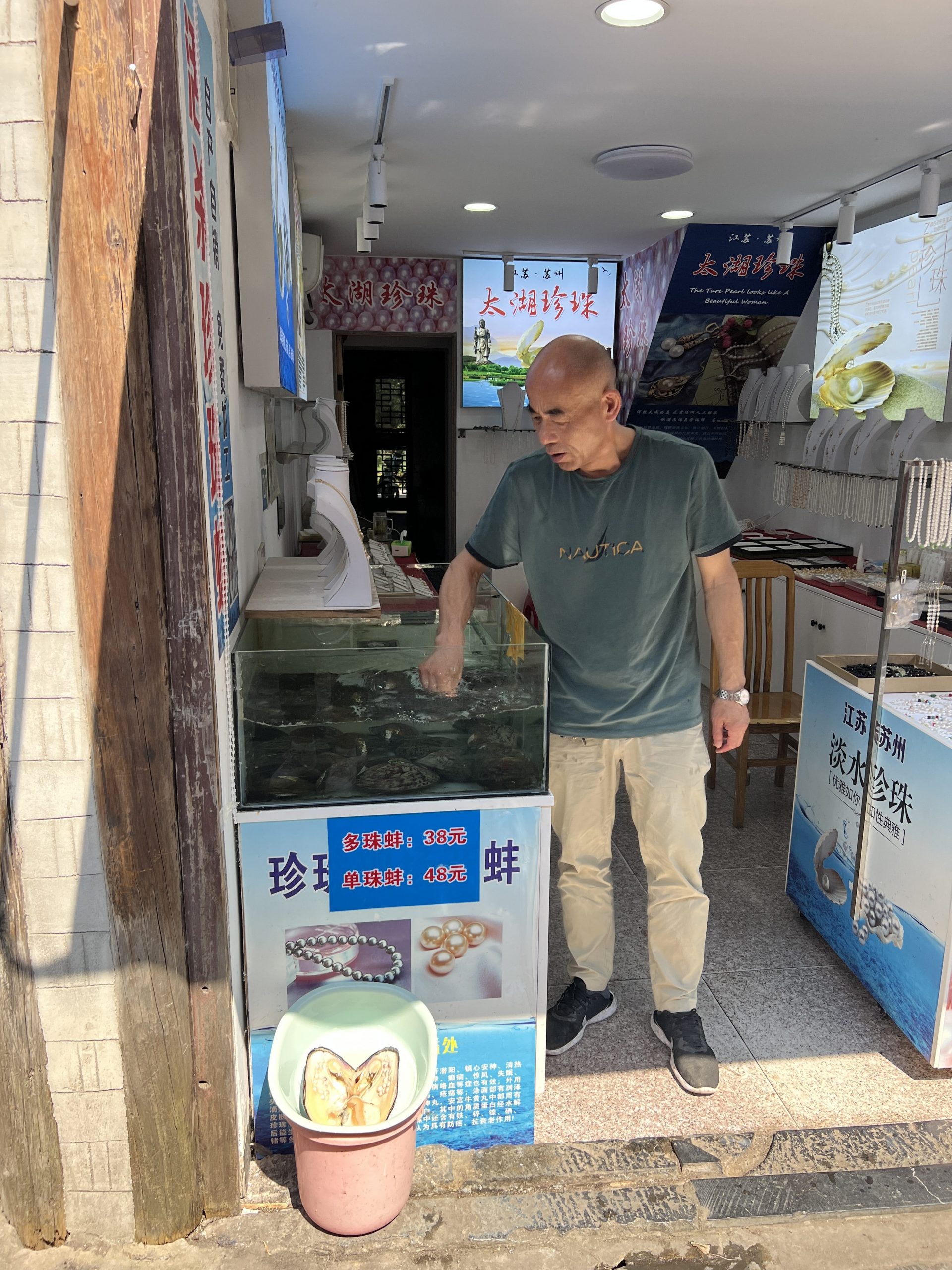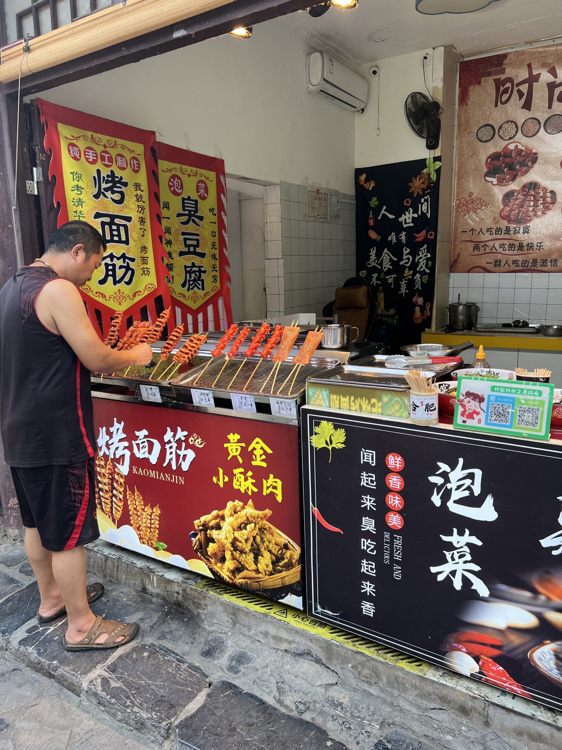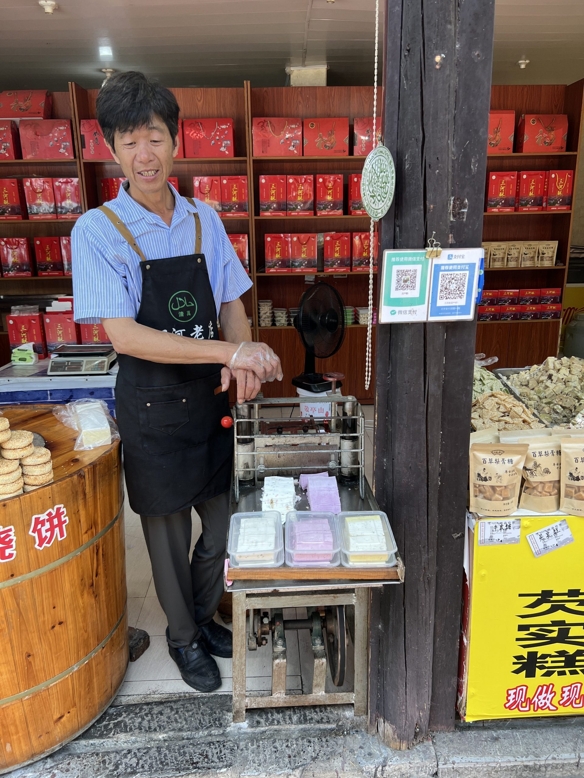 Auf dem Weg dorthin halten wir in Sanhe Ancient Town. Dieser Stadtteil hat eine 2500 jährige Geschichte und entstand am früheren Flusslauf des Yangtze River. Im chinesischen heißt die Stadt Three Rivers nach den Xiaonan, Hangfu und Fengle Flüssen, welche durch die Stadt flossen. Viele der Gebäude sind aus der Ming und Ding Dynastie. Es ist sehr beeindruckend, diese Gebäude zu sehen. In manchen befinden sich auch kleine Museen. In fast allen kann man Süßigkeiten, Souvenirs, Schildkröten, traditionelle Kleider usw. kaufen. Es macht richtig Spaß hier entlang zu laufen.