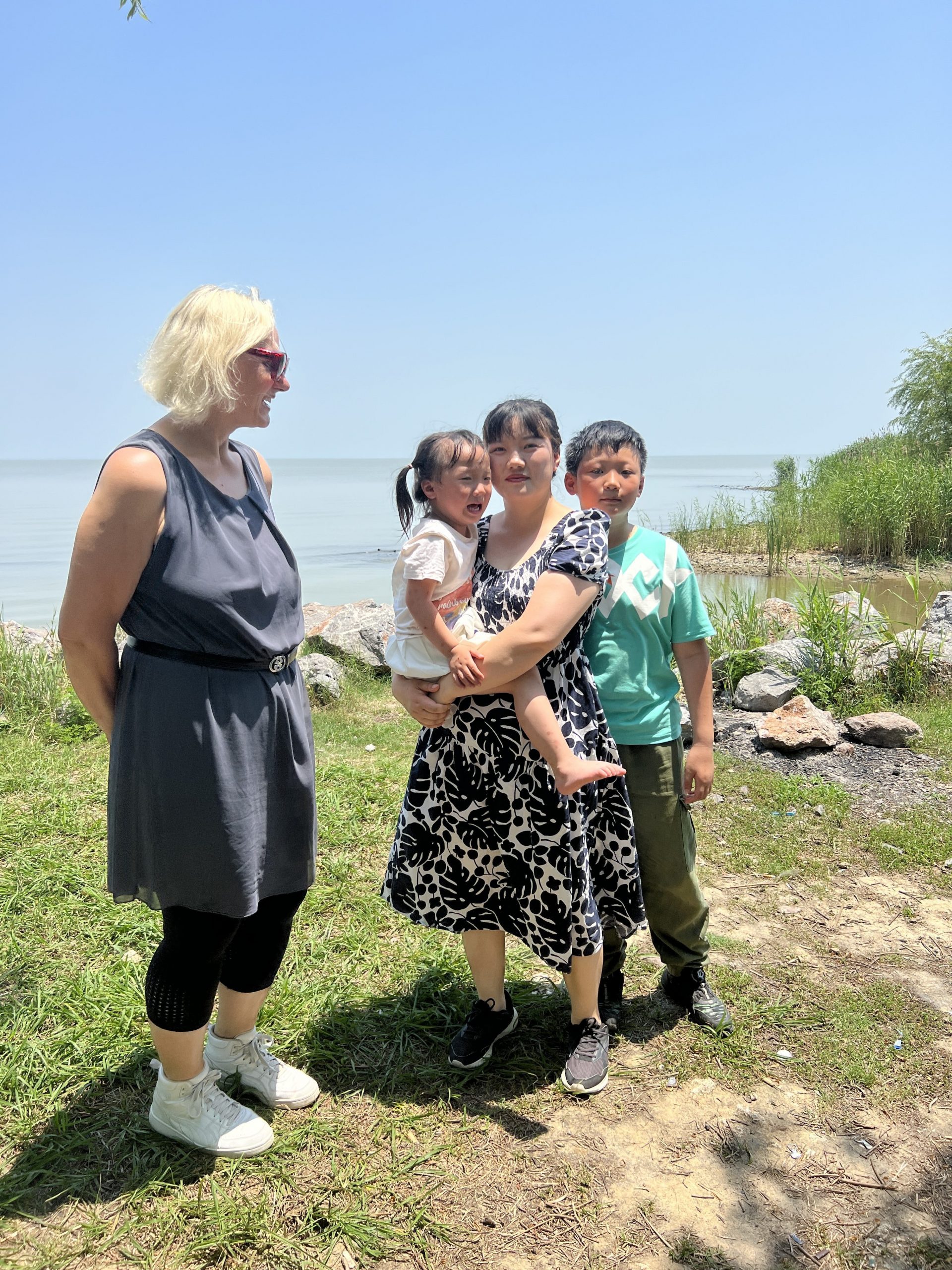 An einem Parkplatz machen wir halt. Es gibt einen Snack und wir laufen nach unten zum Wasser. Eine Familie mit zwei Kindern campt hier und möchte unbedingt ein Foto mit uns machen, auch wenn das Kind auf dem Arm der Mutter nur weint. Na, so schlimm sehen wir ja nun auch wieder nicht aus!