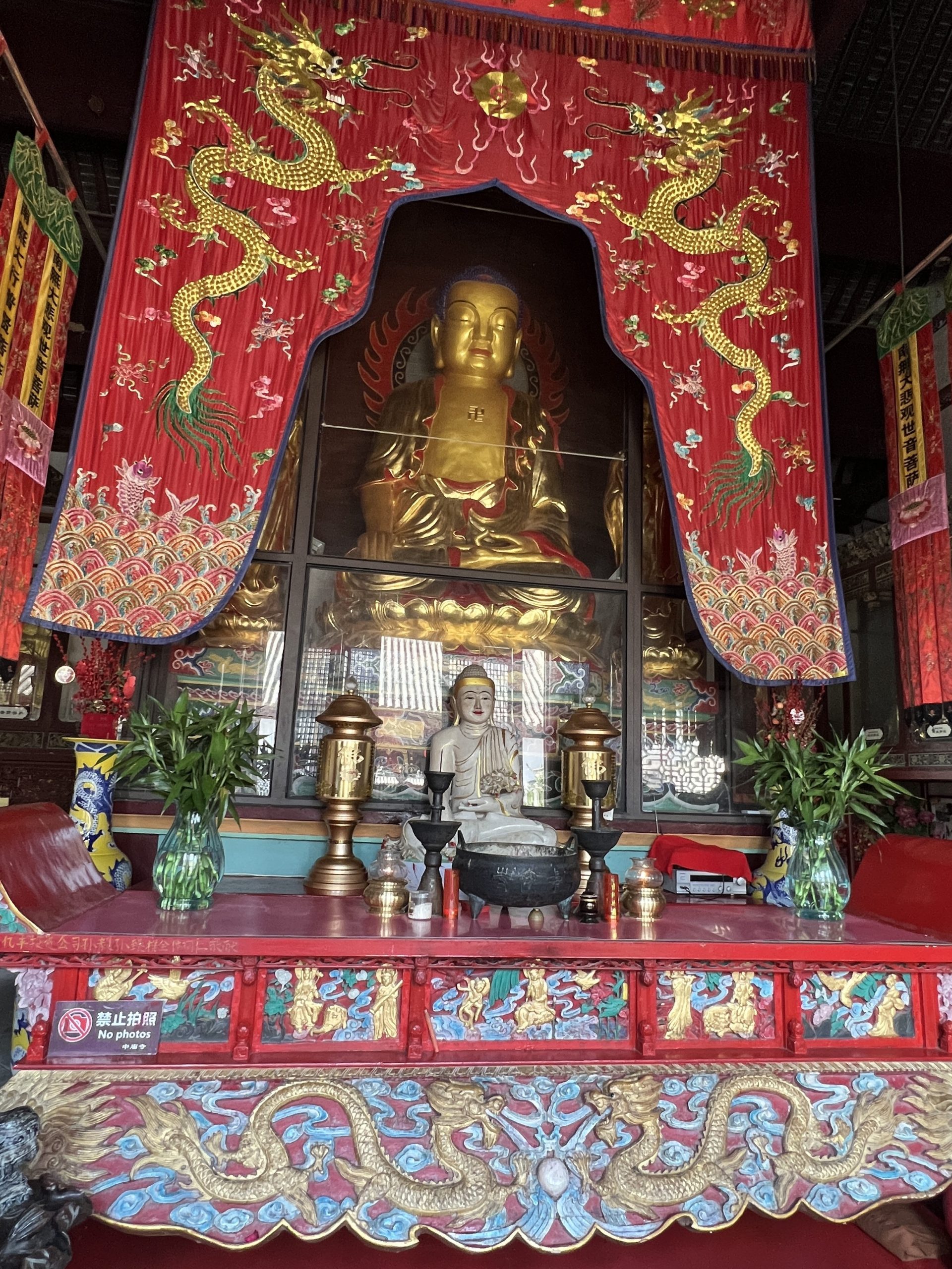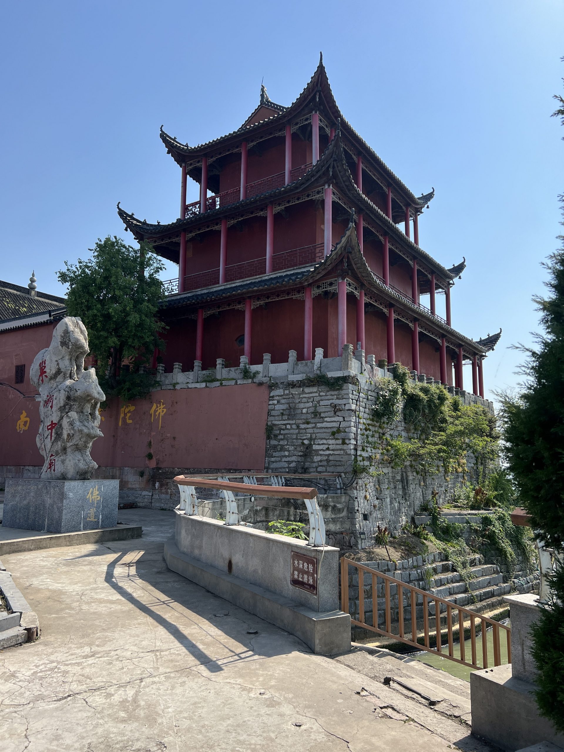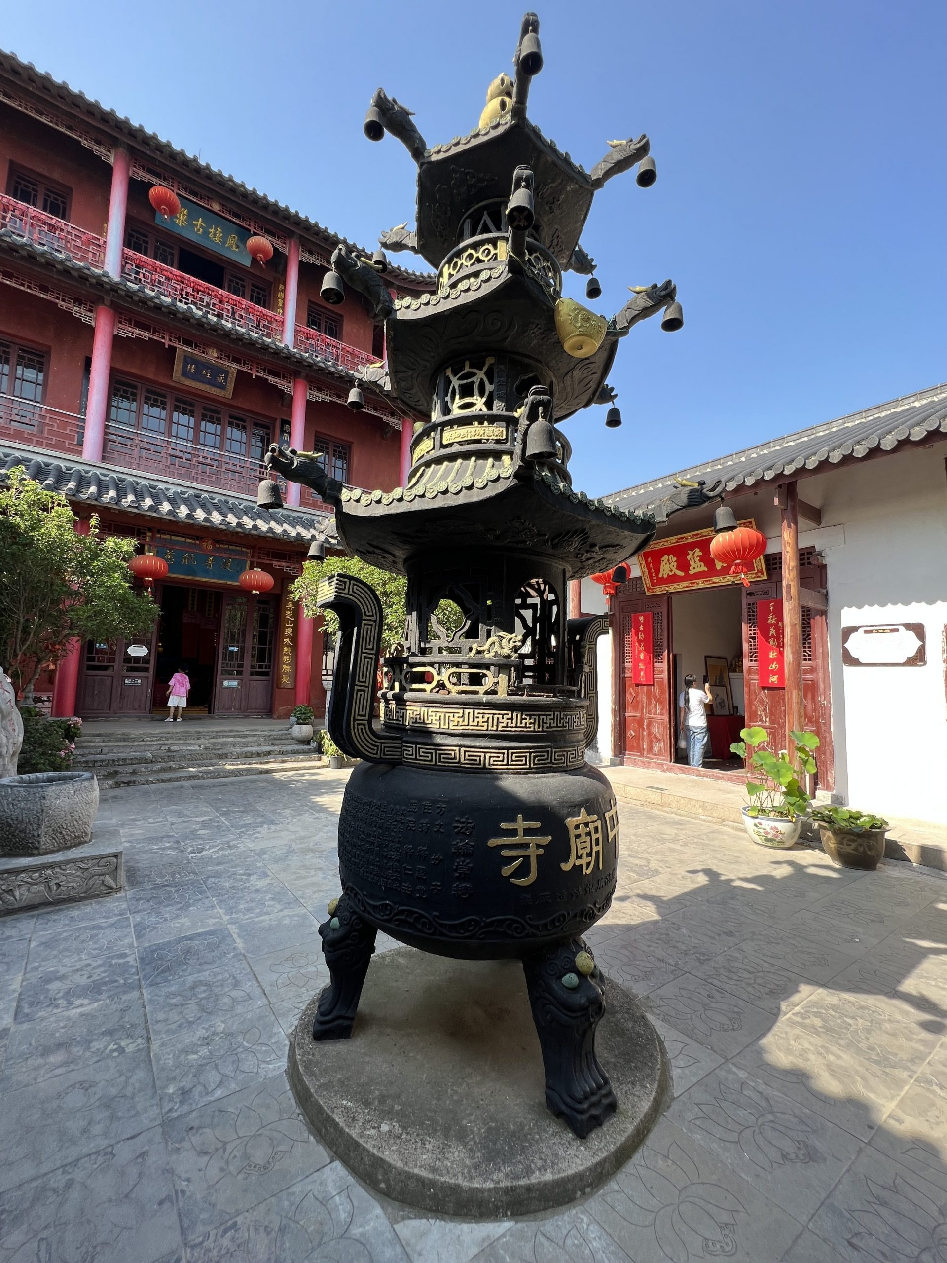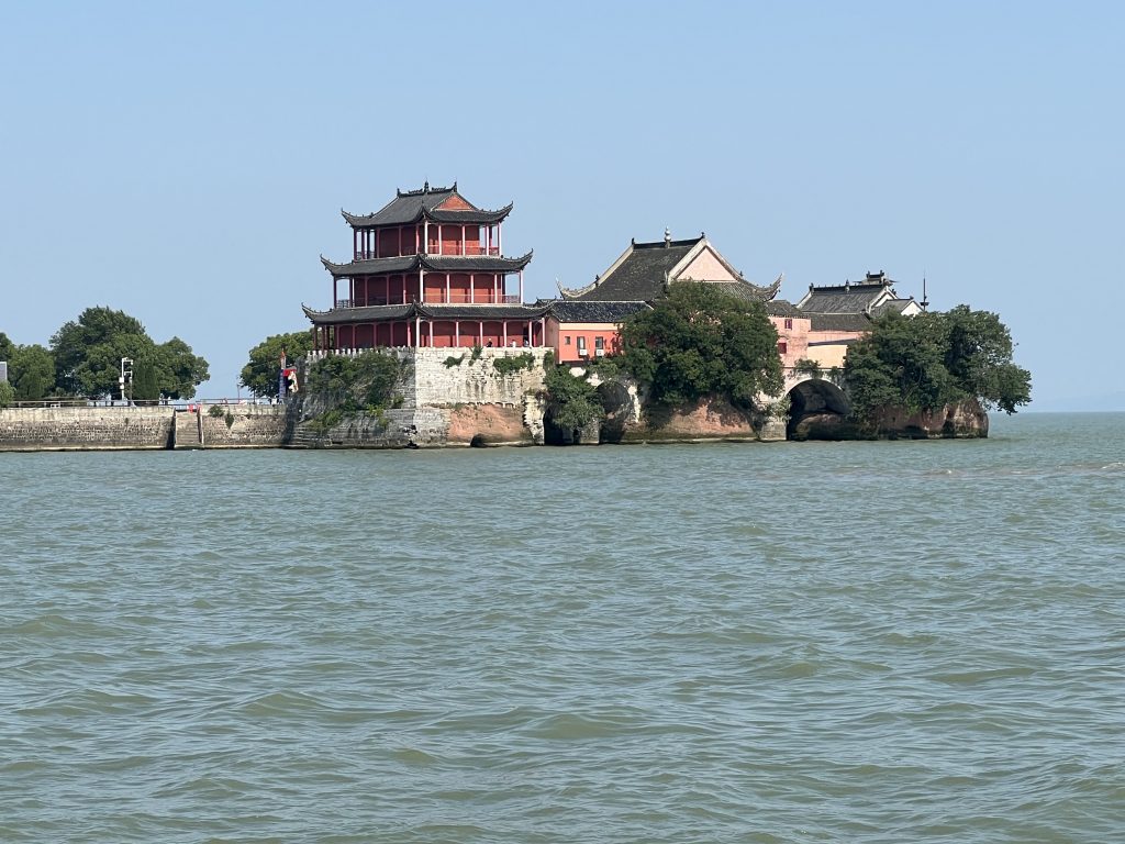 Unser nächster Halt ist der Zhongmiao Tempel. Er befindet sich am nördlichen Ende des Sees und wird während der Han Dynastie (202 v.Ch. – 220 n.Ch.) errichtet. Seitdem musste er allerdings mehrere Male rekonstruiert werden. Der Tempel steht auf einem Felsen direkt am Wasser. Er ist buddhistisch. Übrigens sind die meisten Chinesen heute ohne Religion.