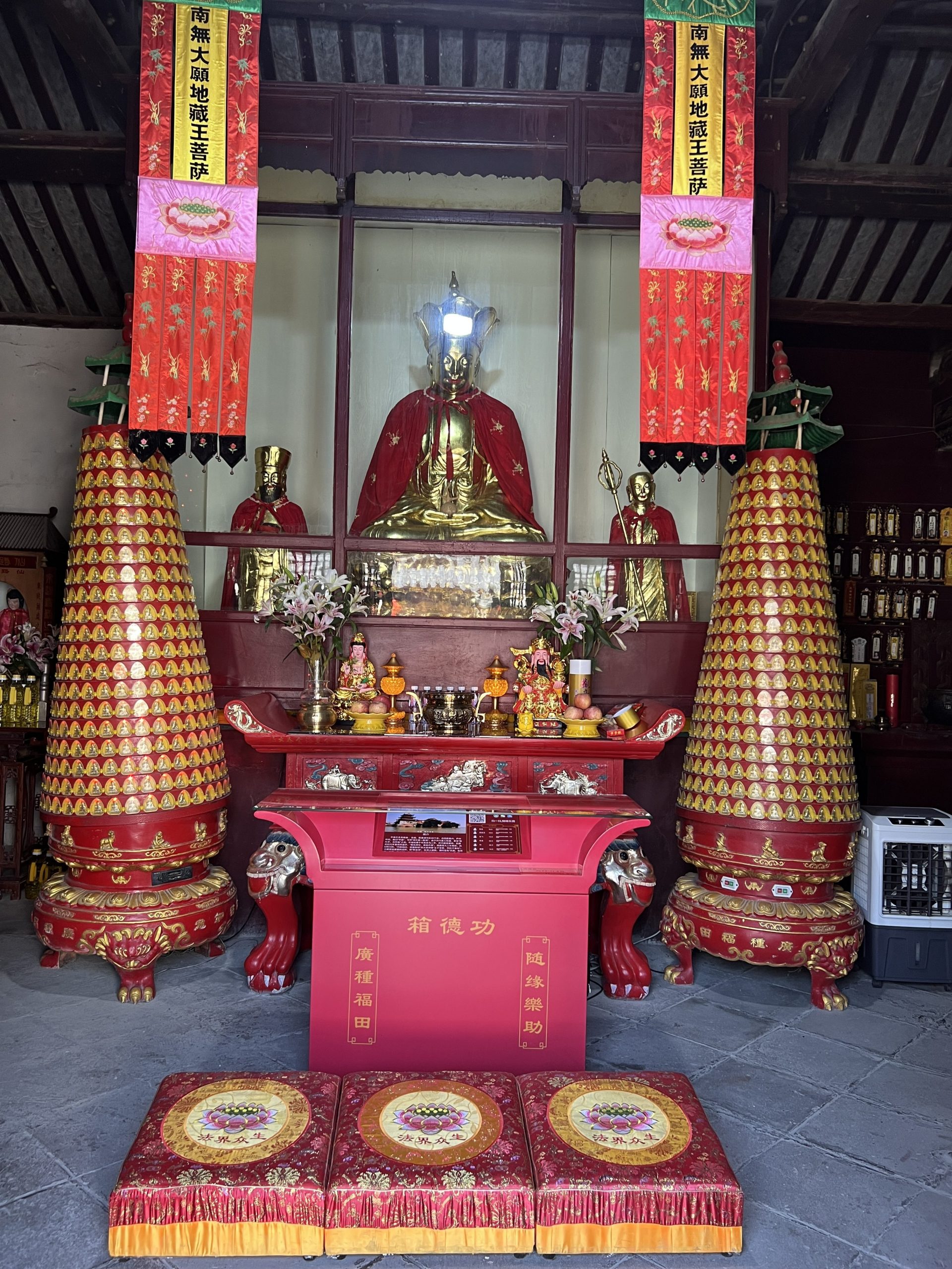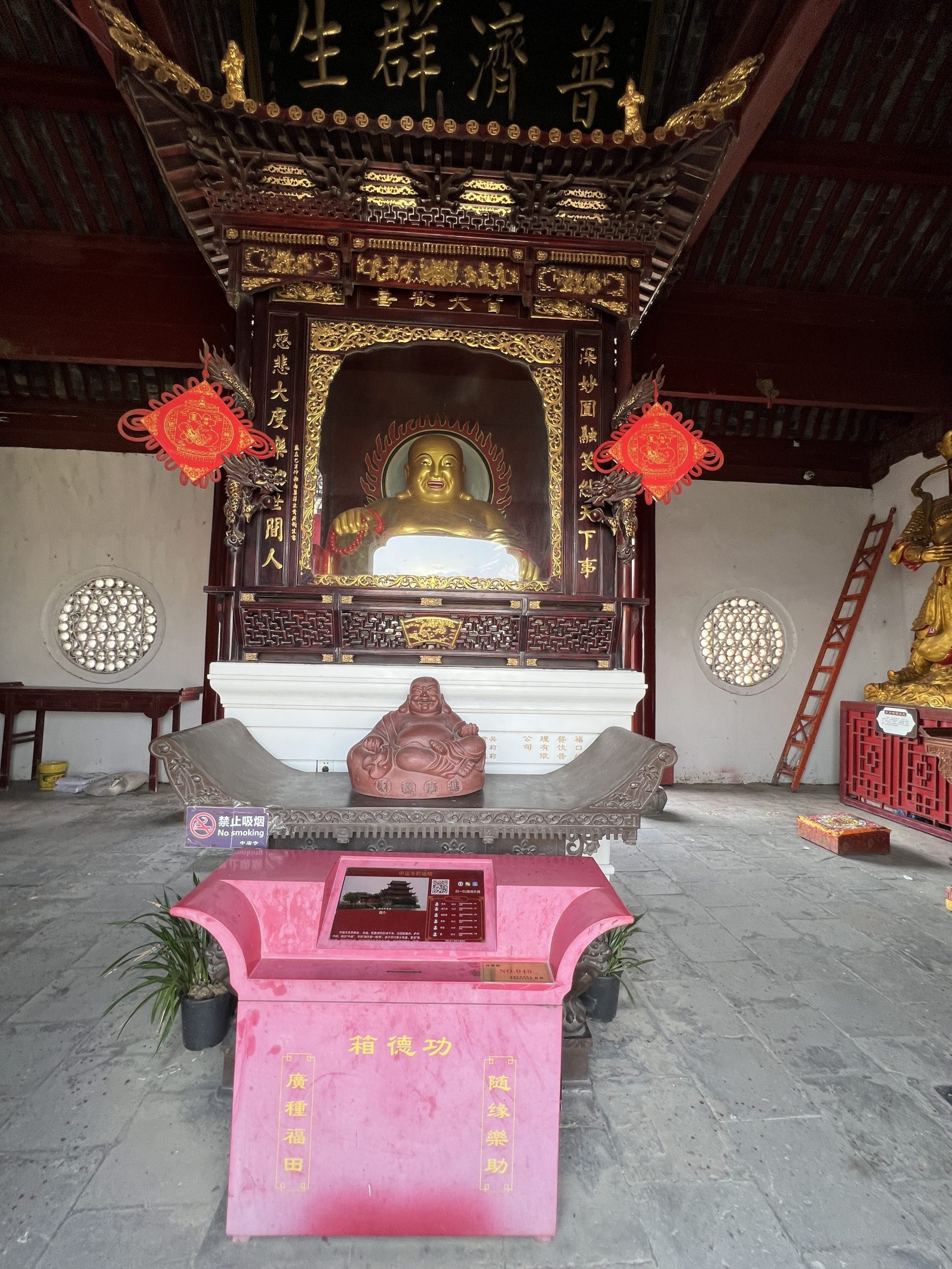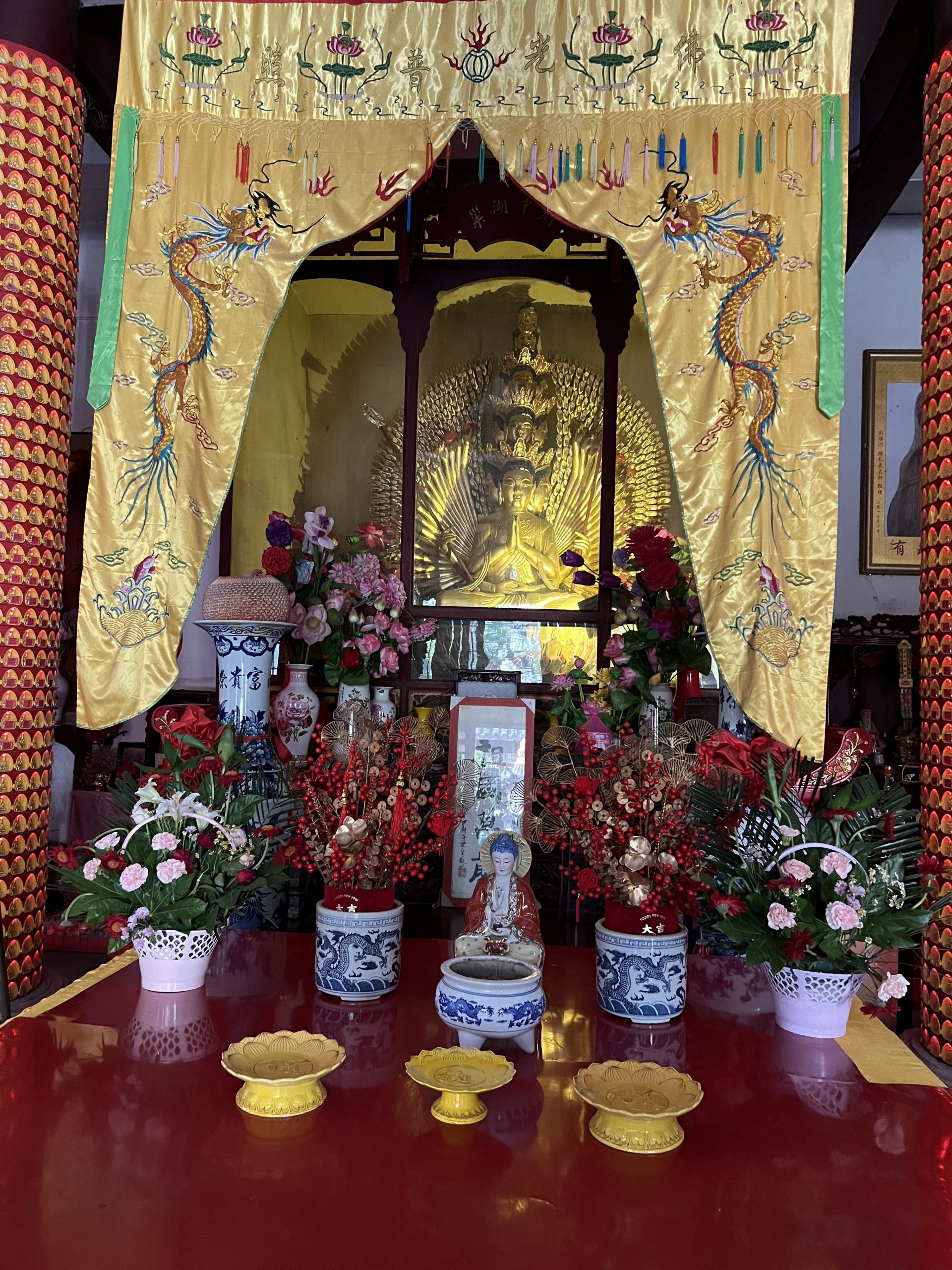 Unser nächster Halt ist der Zhongmiao Tempel. Er befindet sich am nördlichen Ende des Sees und wird während der Han Dynastie (202 v.Ch. – 220 n.Ch.) errichtet. Seitdem musste er allerdings mehrere Male rekonstruiert werden. Der Tempel steht auf einem Felsen direkt am Wasser. Er ist buddhistisch. Übrigens sind die meisten Chinesen heute ohne Religion.
