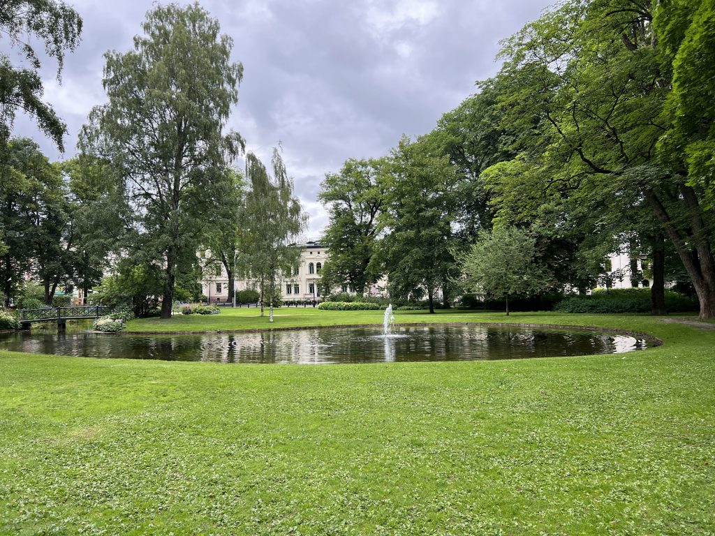 Unser Ziel ist der Skulpturenpark. Doch vorher kommen wir in einer schönen Einkaufsstraße vorbei. In der Mitte ist eine Grünanlage mit Wasser, alles sehr schön angelegt. So langsam haben wir auch ein kleines Hüngerchen. Eis, Haferkeks und für Celina ein Brötchen und Eiskaffee sind unser Mittag. Wir genießen es auf einer schattigen Parkbank.