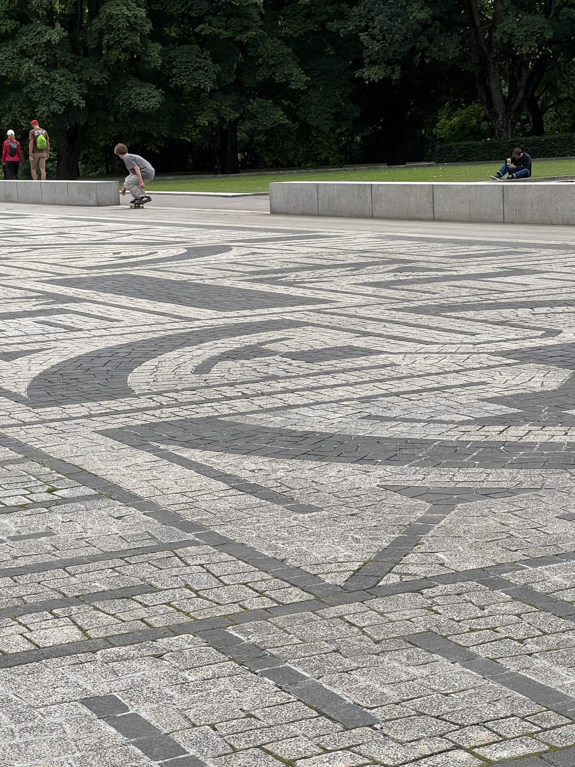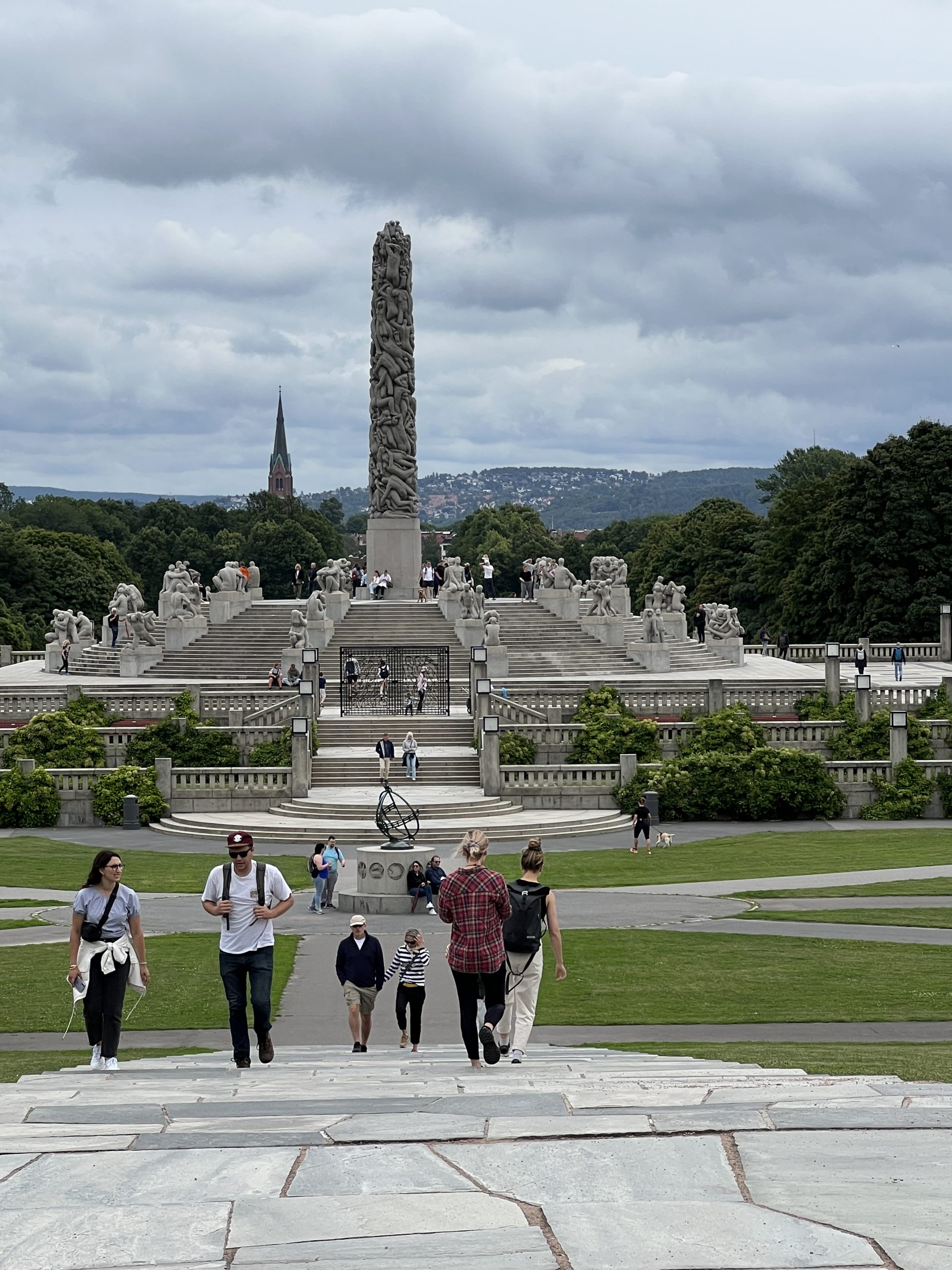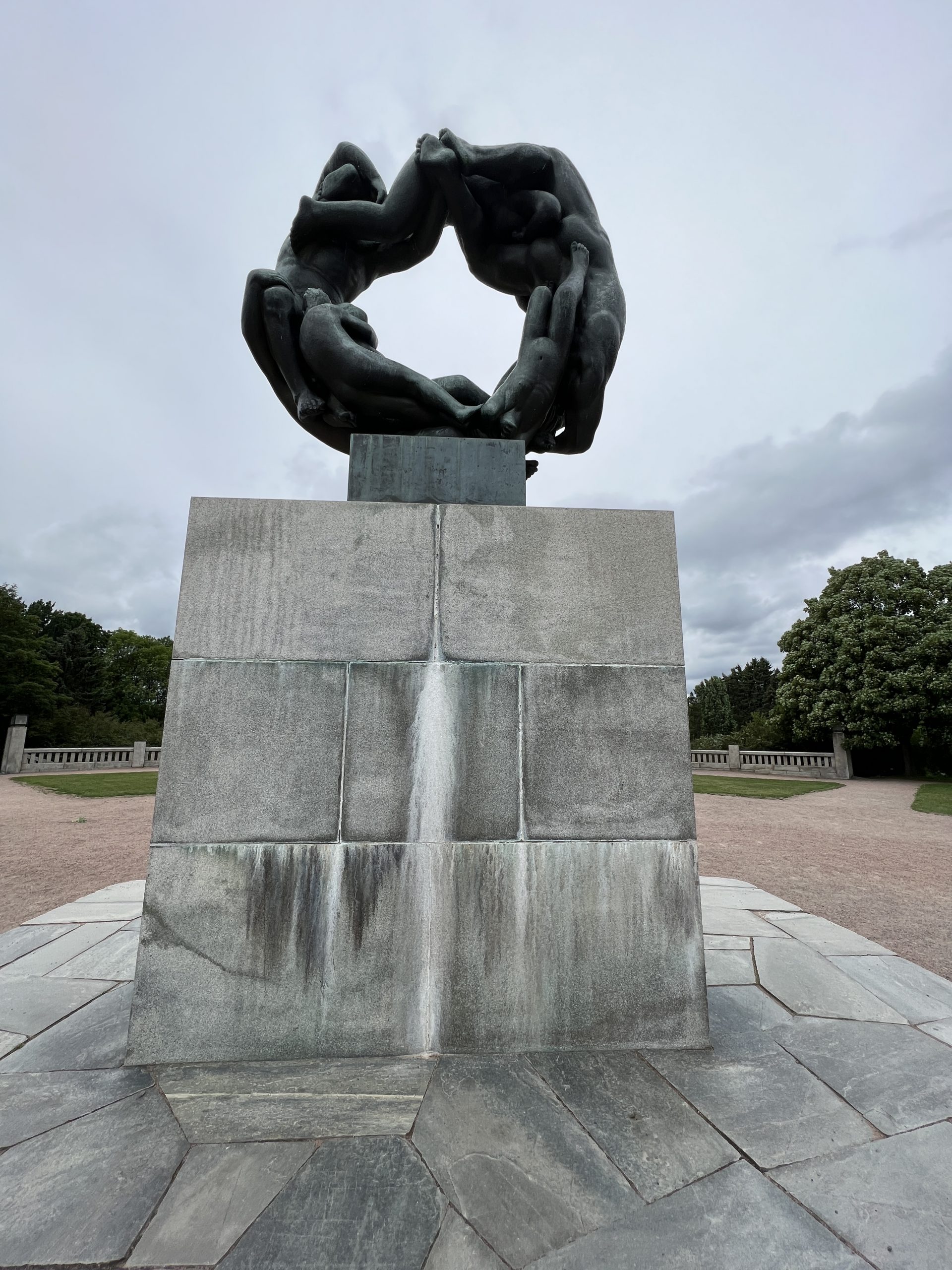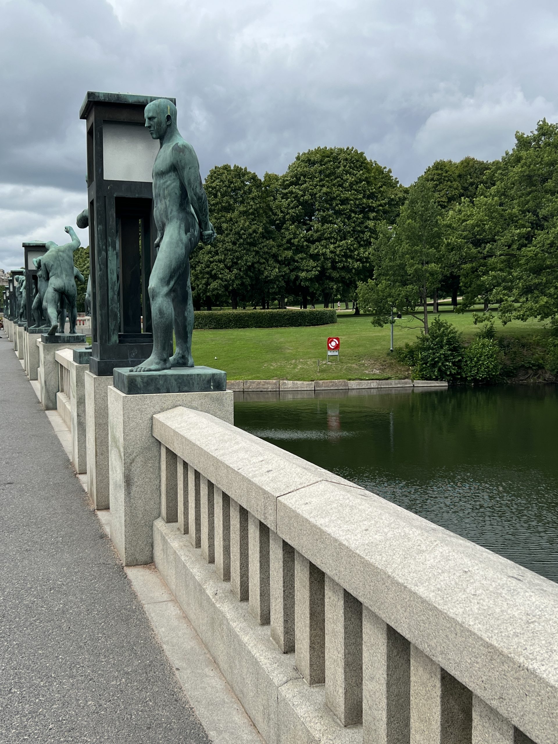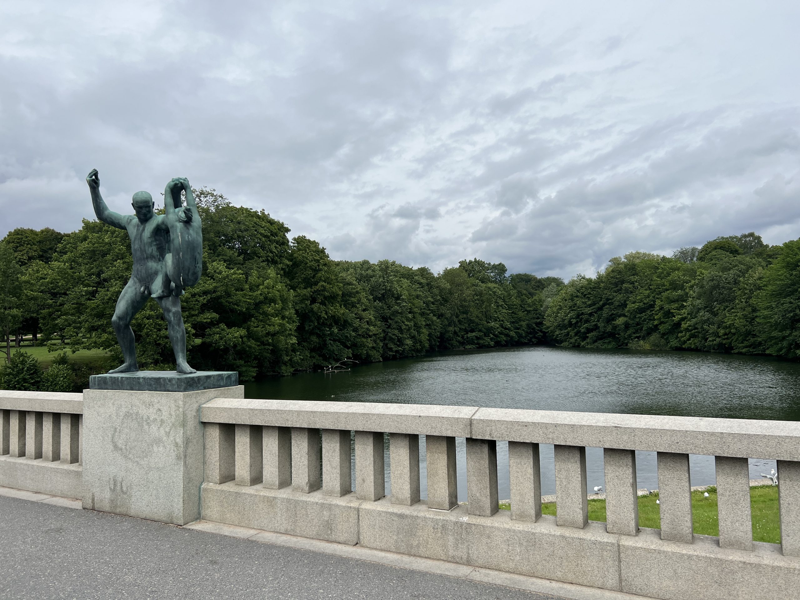 Der Skulpturenpark ist ca. 800 Meter lang und 800 Meter breit. Über 200 Figuren des Künstlers Vigeland befinden sich hier. Sie beschäftigen sich eigentlich alle mit dem Verhältnis von Männern und Frauen und Kindern. Wir gehen gemütlich spazieren und bestaunen einen Teil der Figuren, aber auch Skatebordfahrer, die versuchen über eine bestimmt 50cm hohe Kante zu springen.
