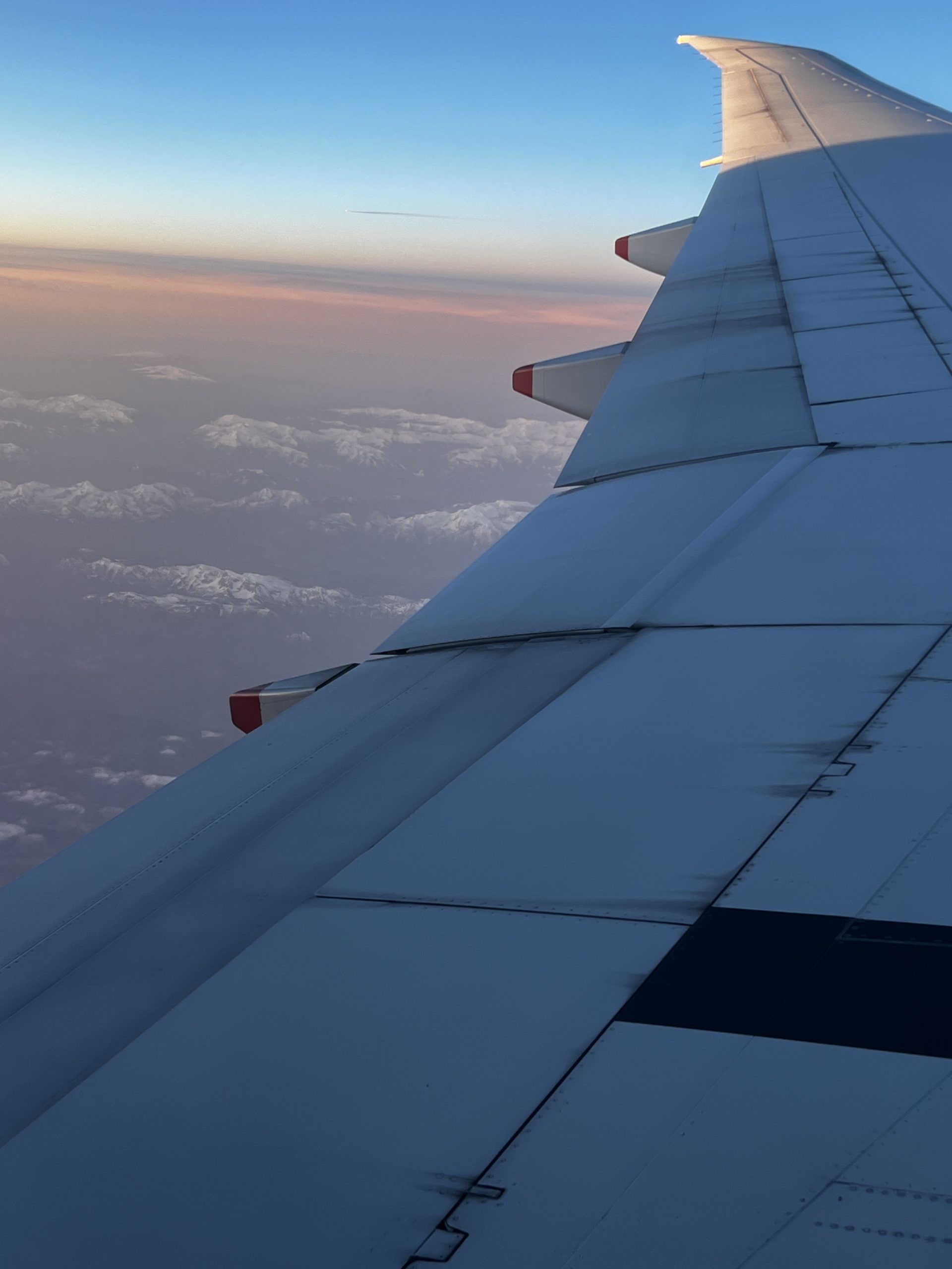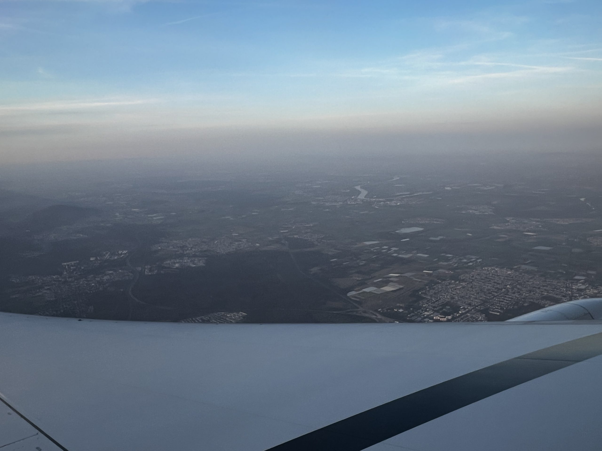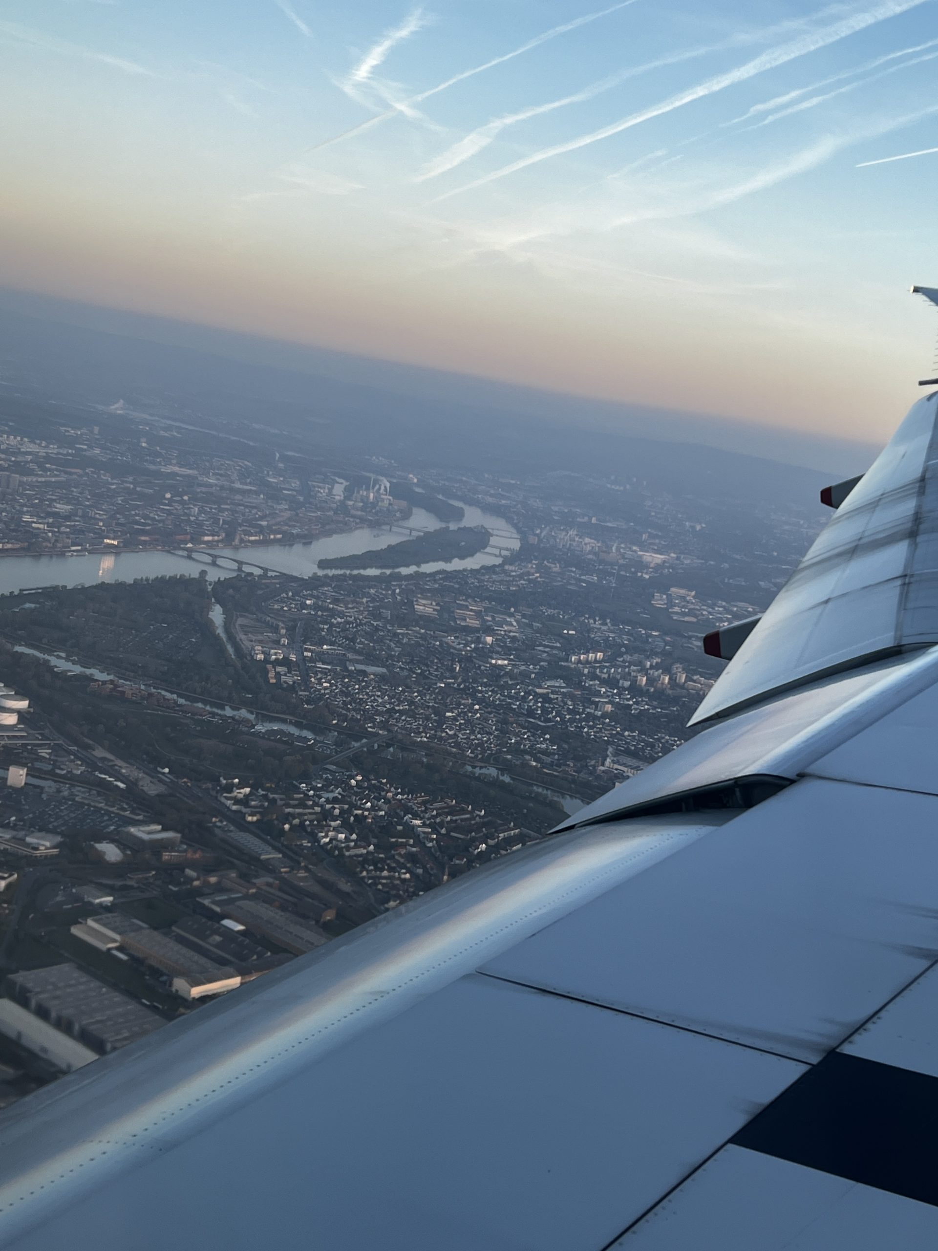 Pünktlich kurz vor 7 landen wir in Frankfurt. Als erstes fallen mir die vielen, vielen Windräder auf. Auch die schneebedeckten Spitzen der Alpen haben wir wieder gesehen.