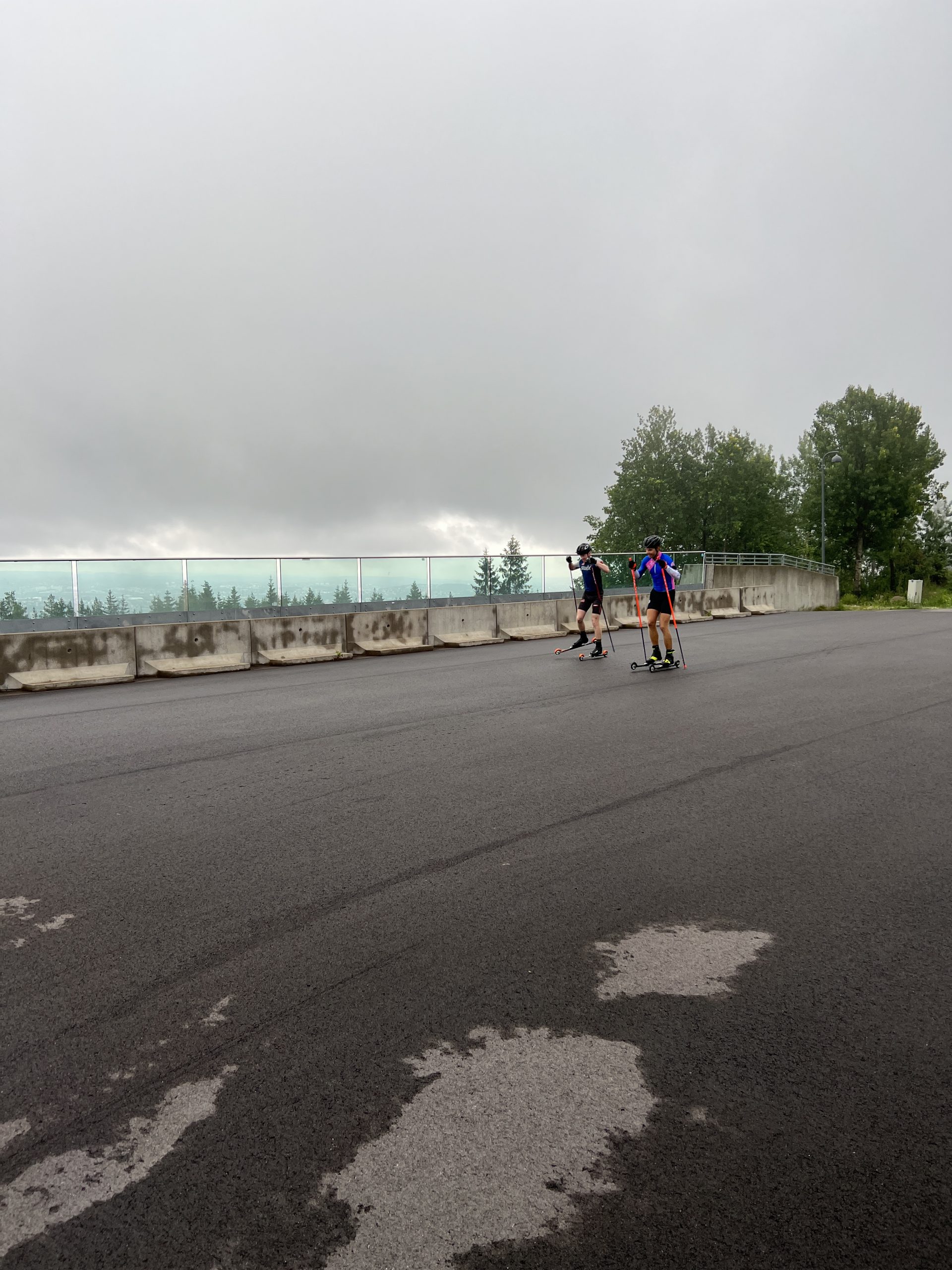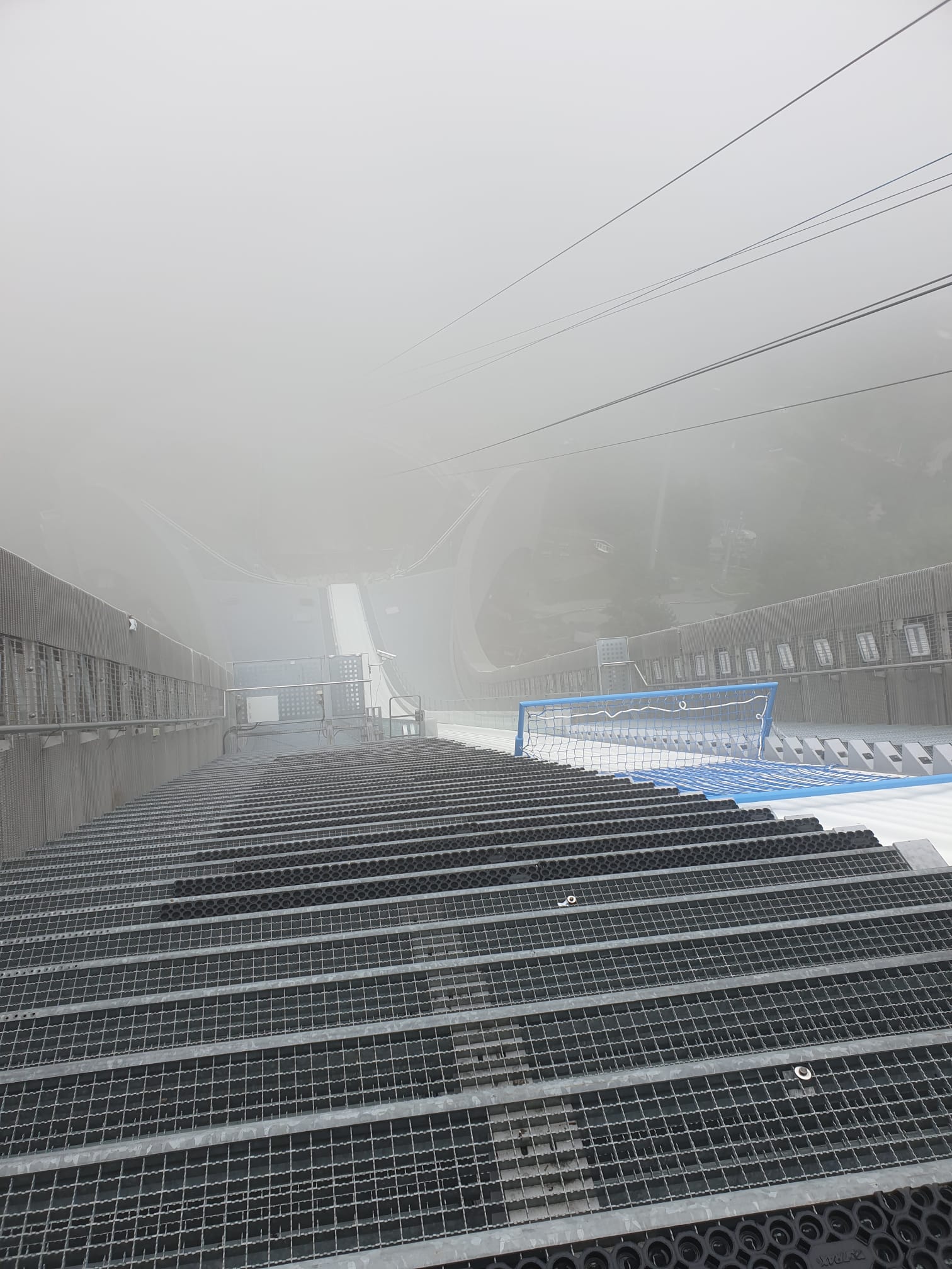 Viel länger als geplant halten wir uns hier auf. Es gibt so viel zu sehen, Biathleten, die mit Sommer-Langläufern eine Runde drehen, zum Beispiel oder Fahrradfahrer oder Läufer oder einfach nur die Schanze.