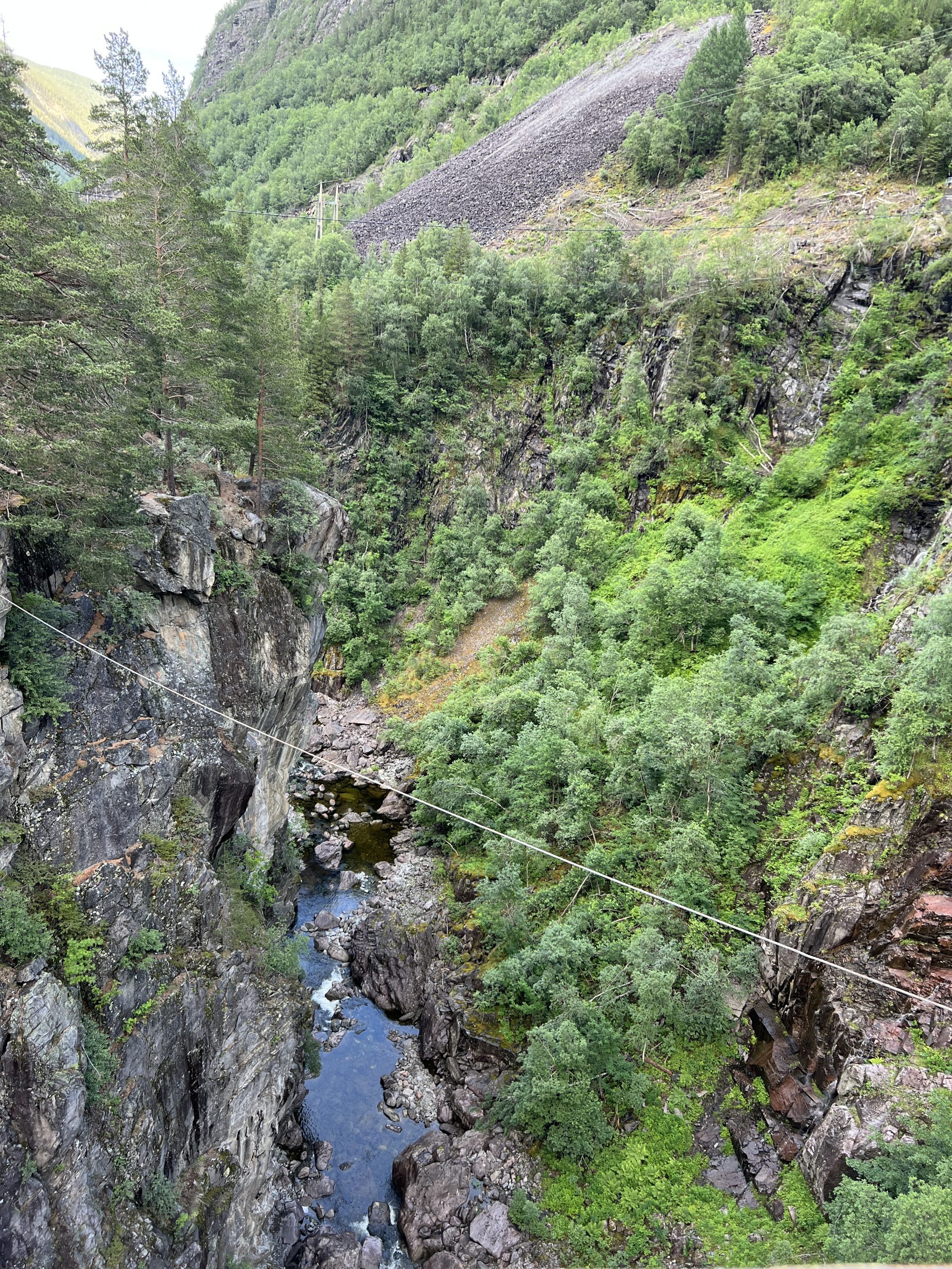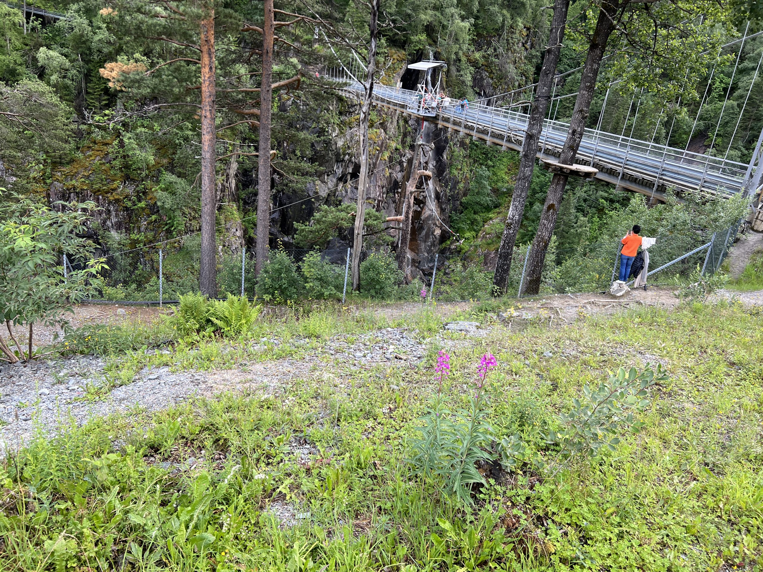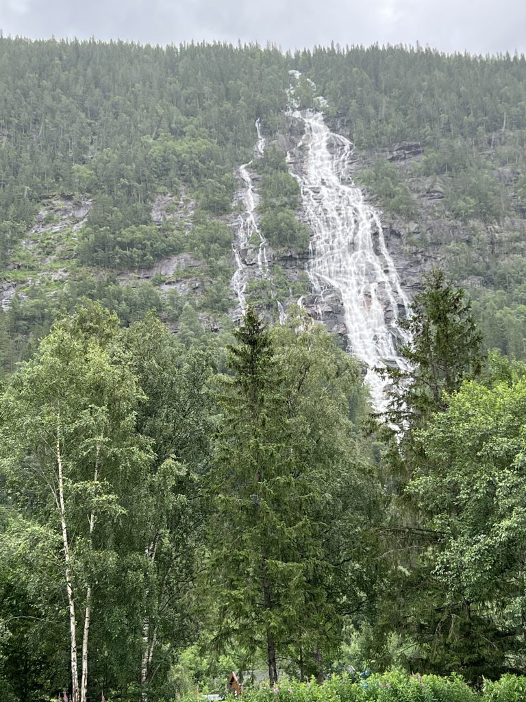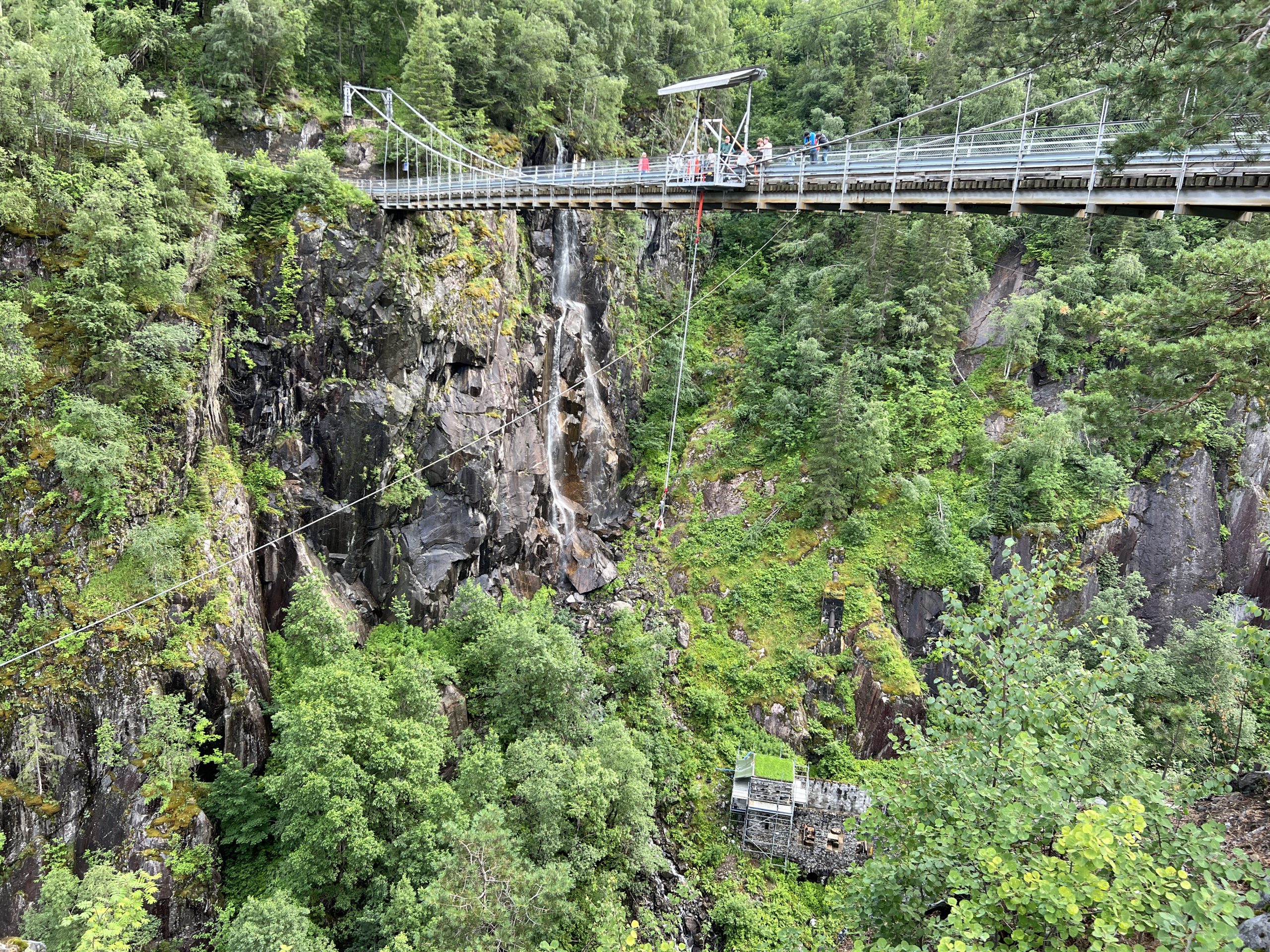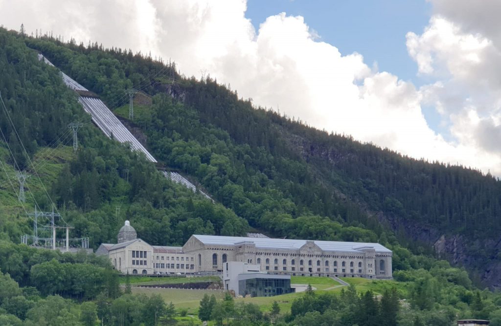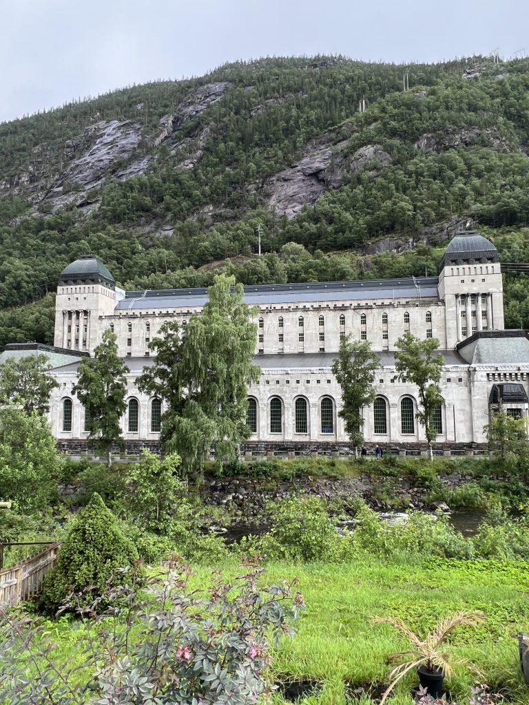 Der Schaffner hat uns erzählt, dass im zweiten Weltkrieg in einem der heute sieben Wasserkraftwerke schweres Wasser erzeugt wurde und dann beim Transport über den See das Schiff explodierte und bis heute das schwere Wasser in ca. 800 m Tiefe am See „liegt“. Auf dem Weiterweg sehen wir das dazugehörige Wasserkraftwerk. Wir sind interessiert und fahren auf einen Parkplatz in der Nähe – hauptsächlich für ein schönes Foto.