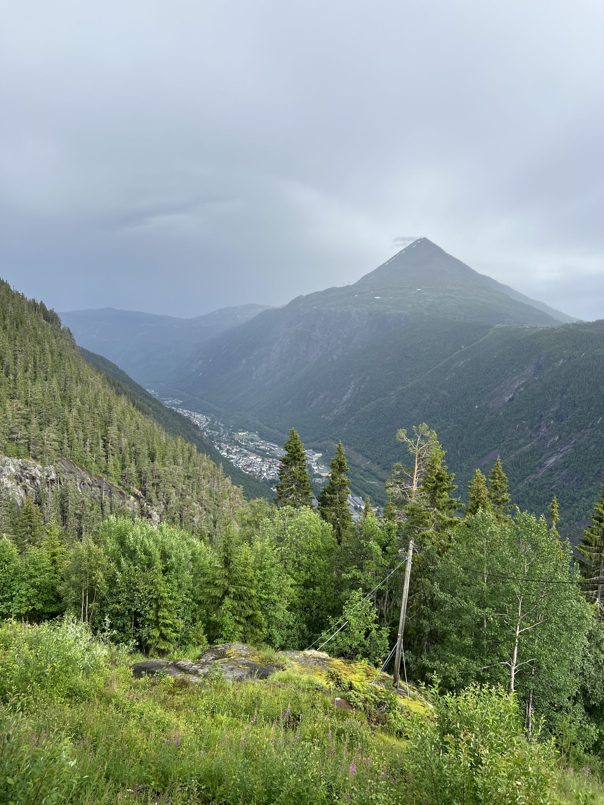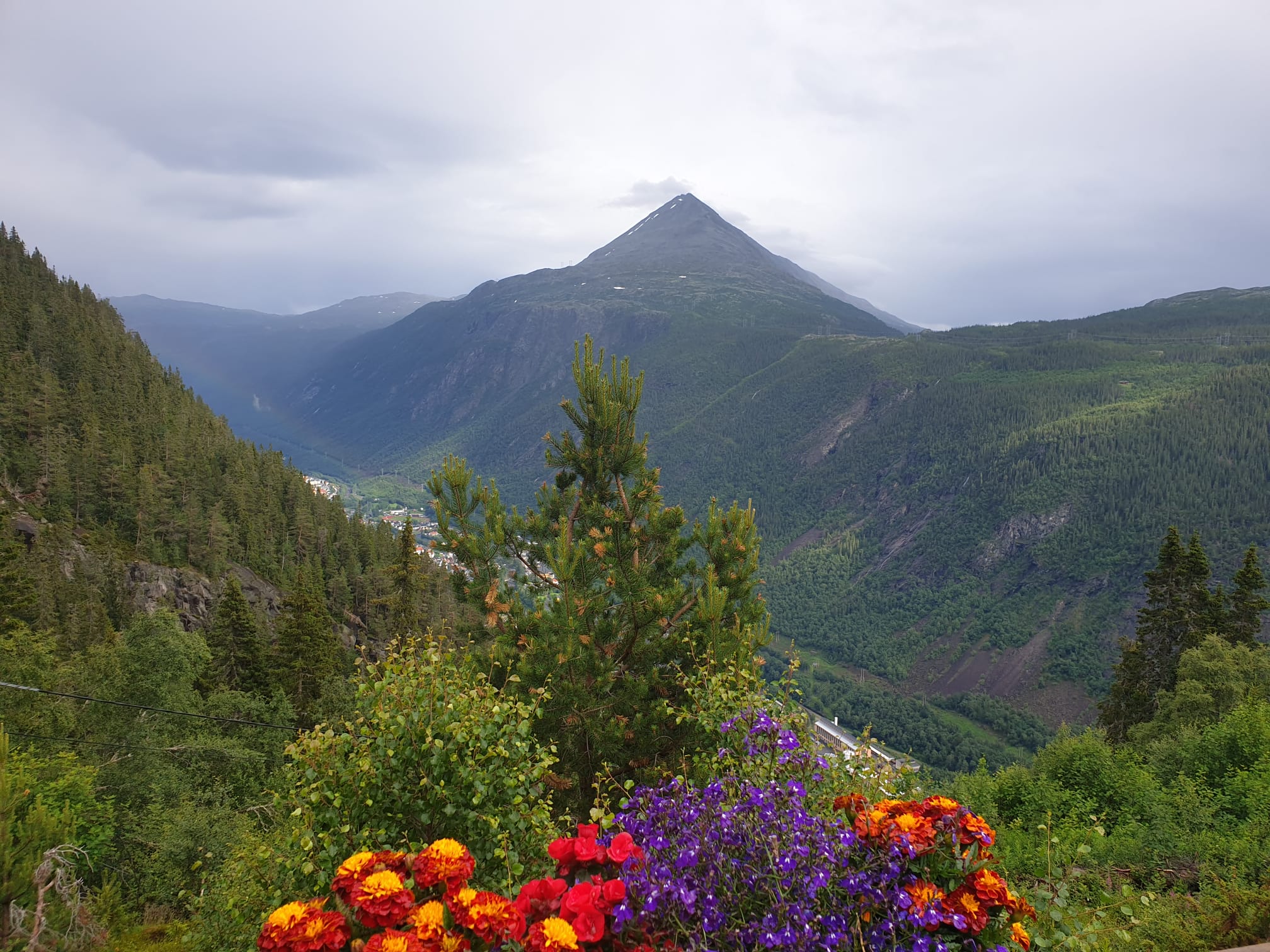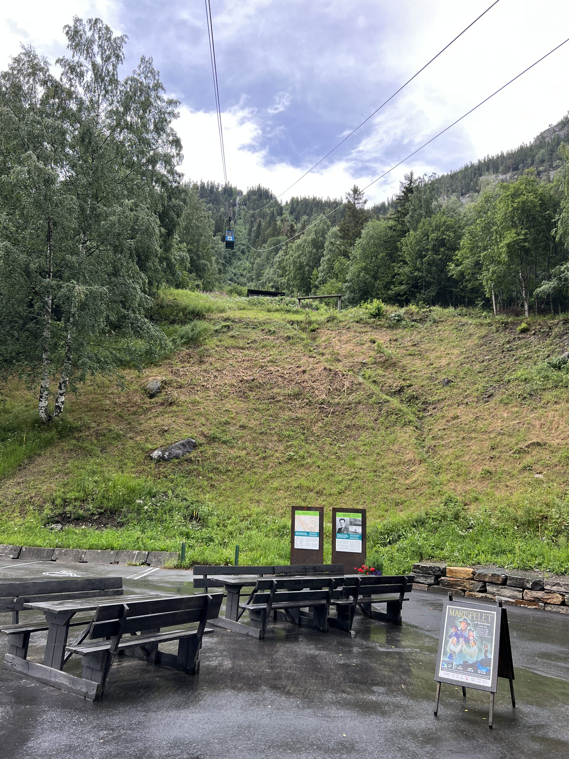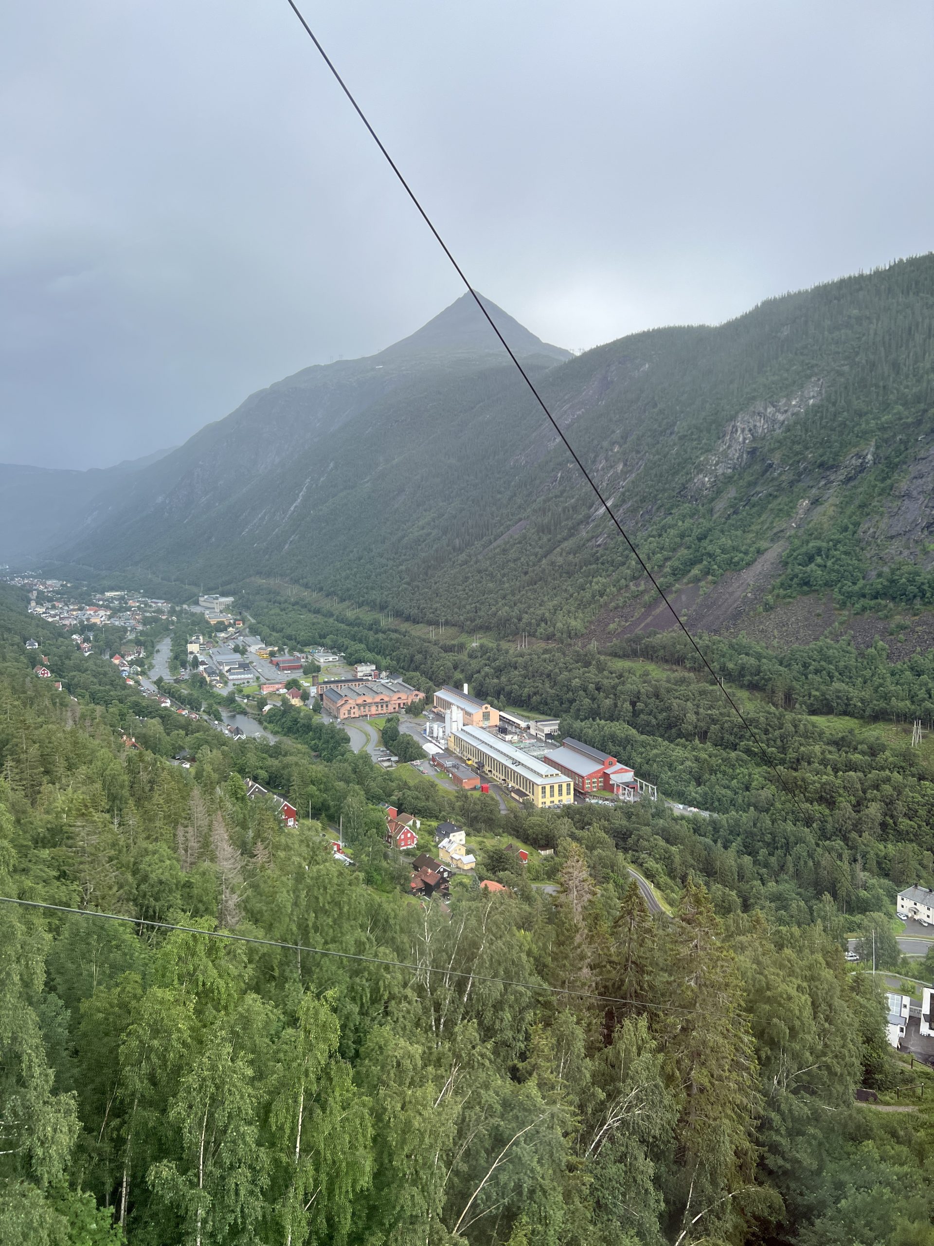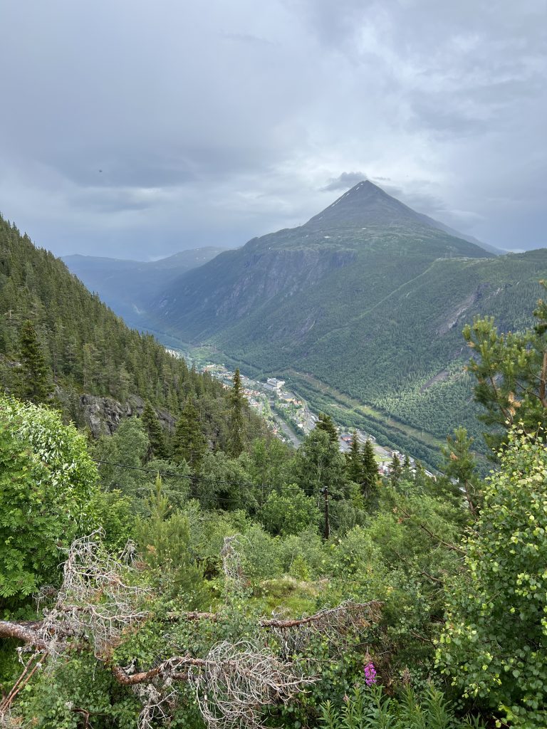 Der Schaffner hat uns erzählt, dass im zweiten Weltkrieg in einem der heute sieben Wasserkraftwerke schweres Wasser erzeugt wurde und dann beim Transport über den See das Schiff explodierte und bis heute das schwere Wasser in ca. 800 m Tiefe am See „liegt“. Auf dem Weiterweg sehen wir das dazugehörige Wasserkraftwerk. Wir sind interessiert und fahren auf einen Parkplatz in der Nähe – hauptsächlich für ein schönes Foto.