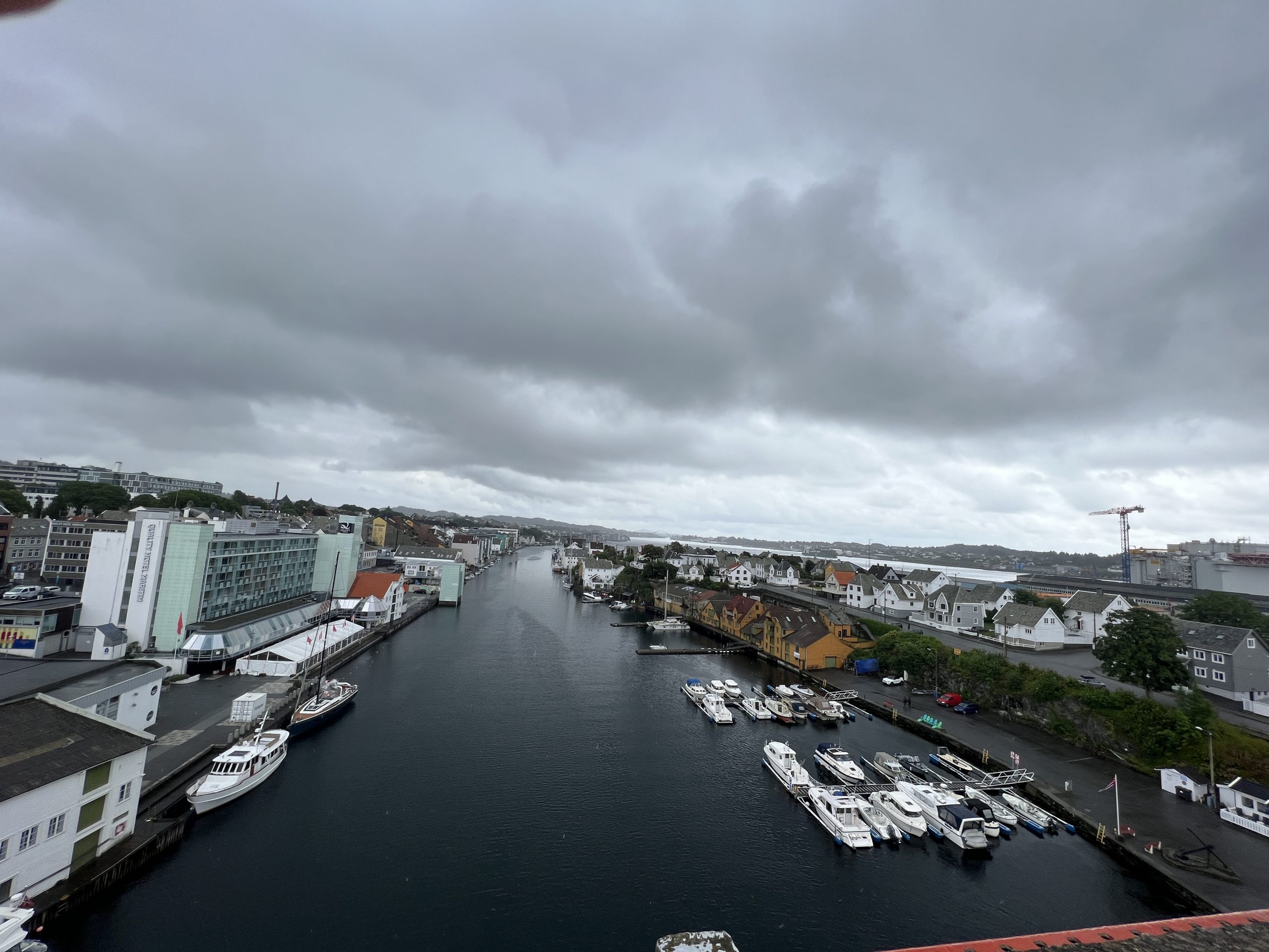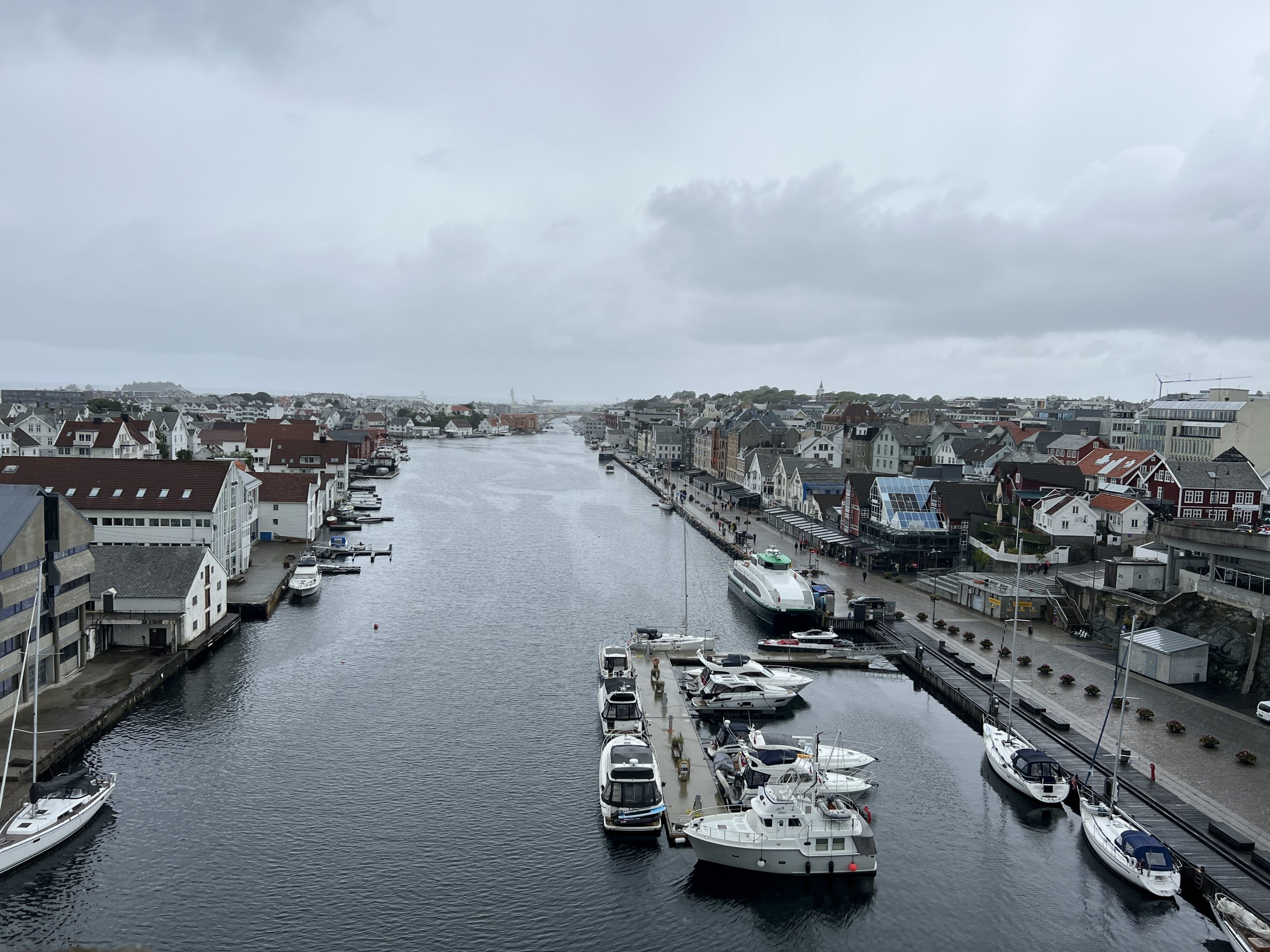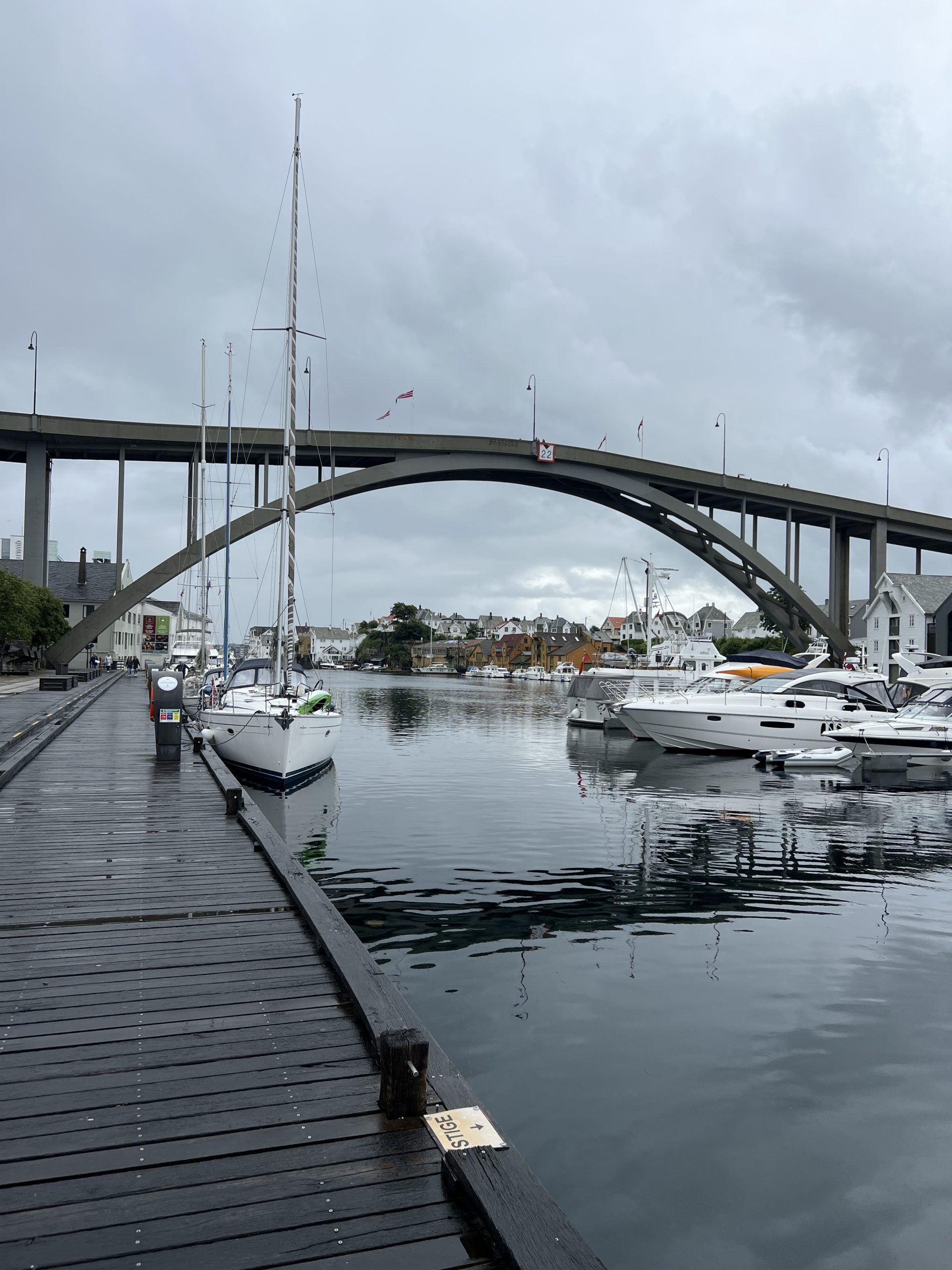 Gegen 1 erreichen wir die Hafenstadt. Außer einem Anglerbedarf gibt es hier eine sehr schöne Hafenprommenade, die angeblich längste Einkaufsstraße Norwegens und eine Brücke mit wunderbarer Aussicht.
