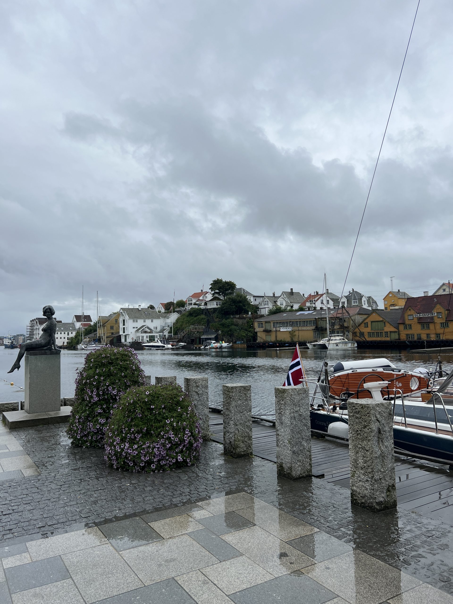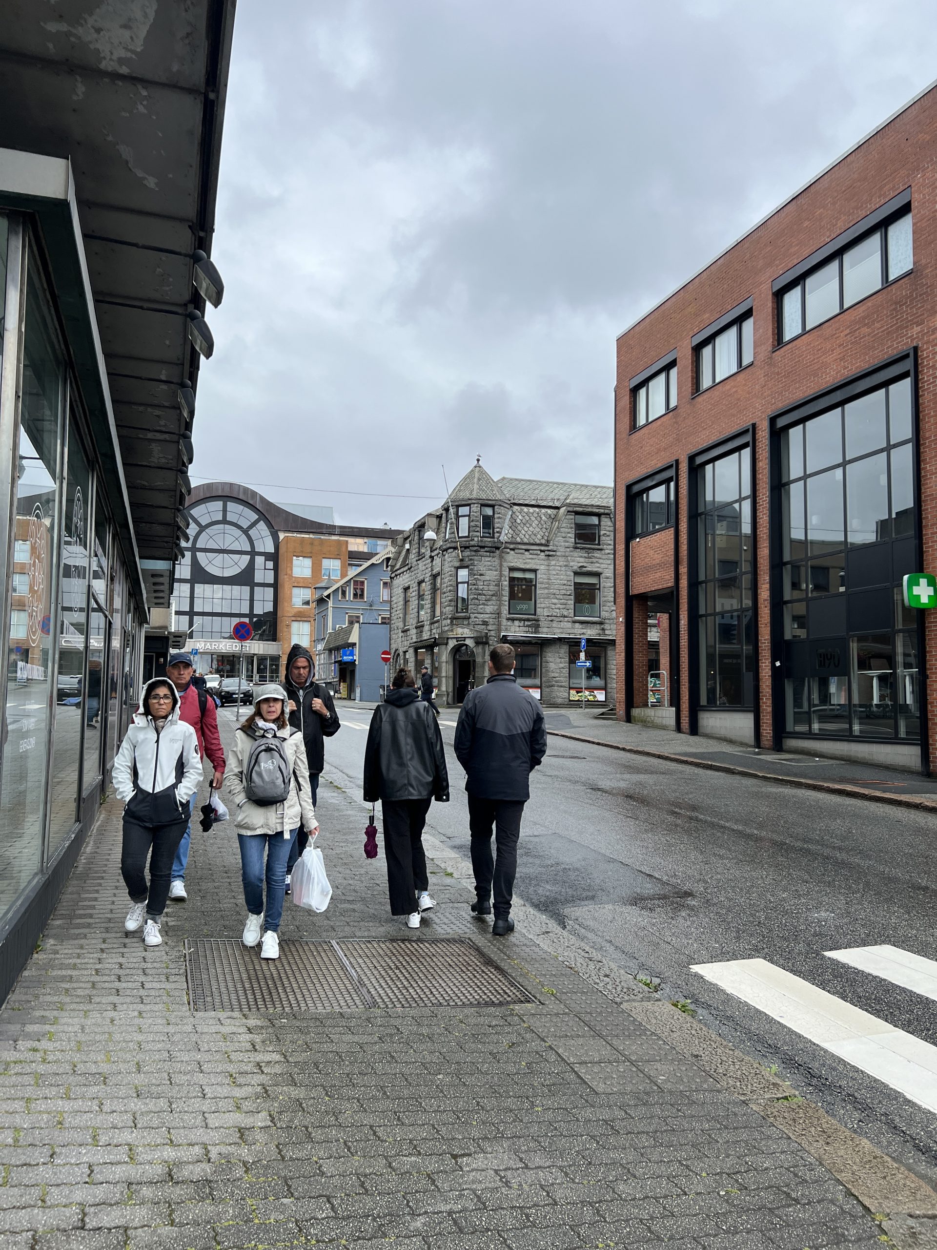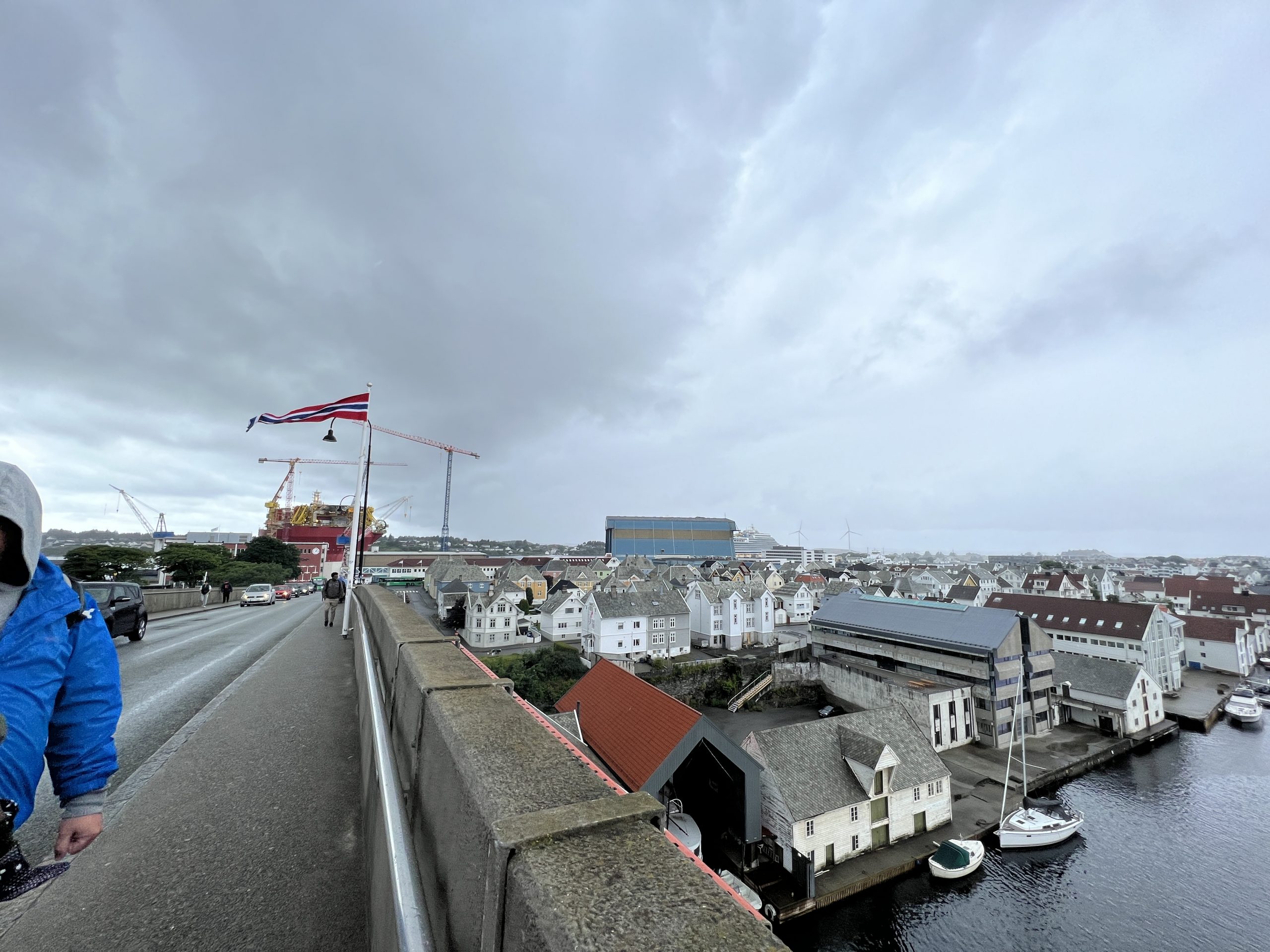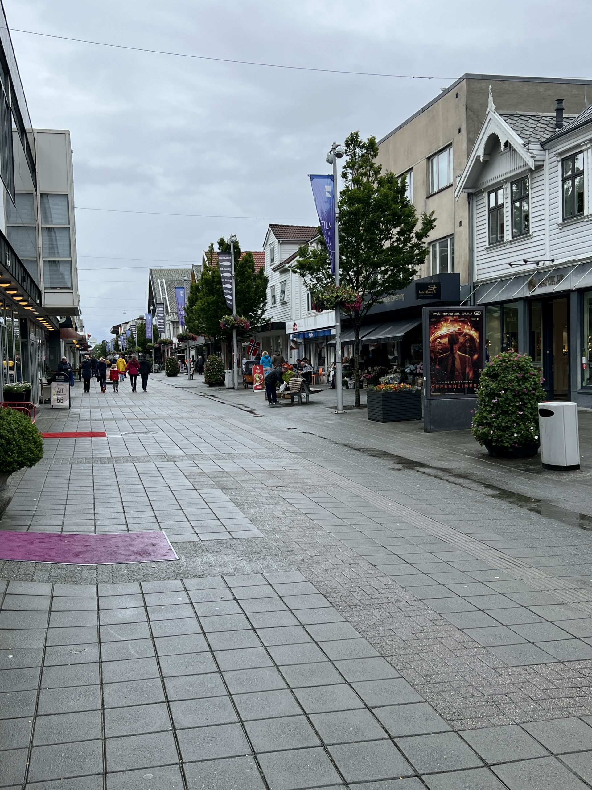 Gegen 1 erreichen wir die Hafenstadt. Außer einem Anglerbedarf gibt es hier eine sehr schöne Hafenprommenade, die angeblich längste Einkaufsstraße Norwegens und eine Brücke mit wunderbarer Aussicht.