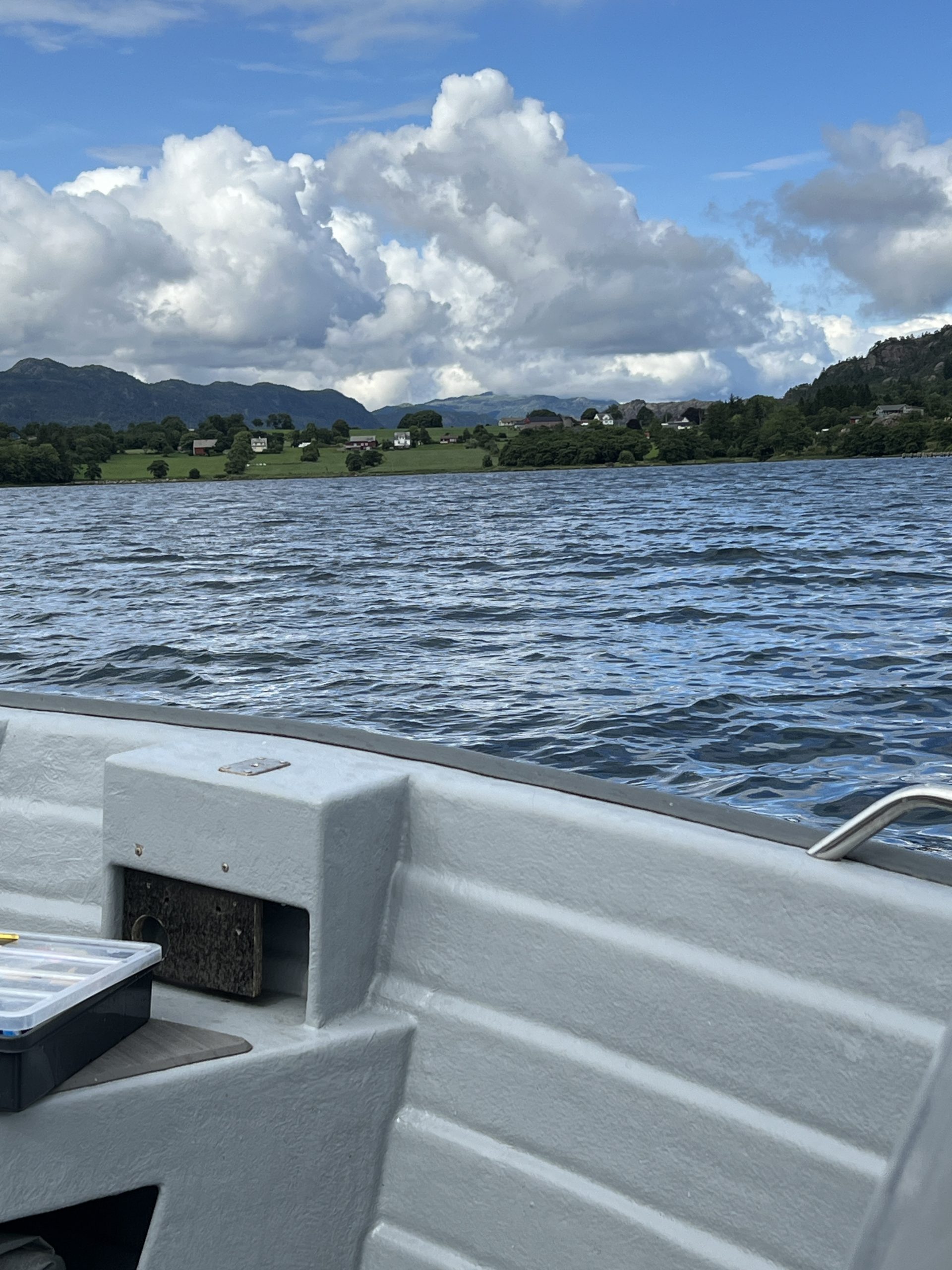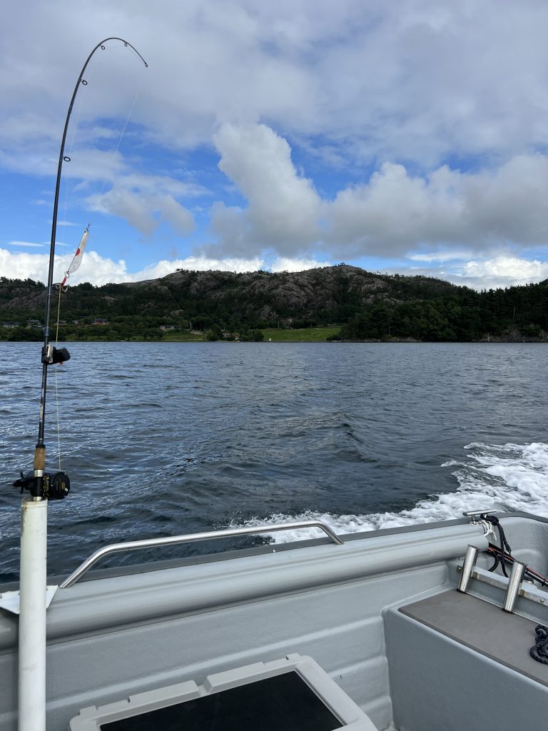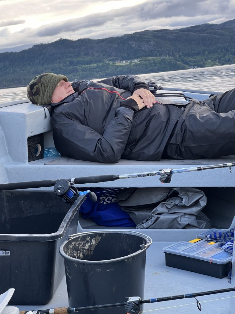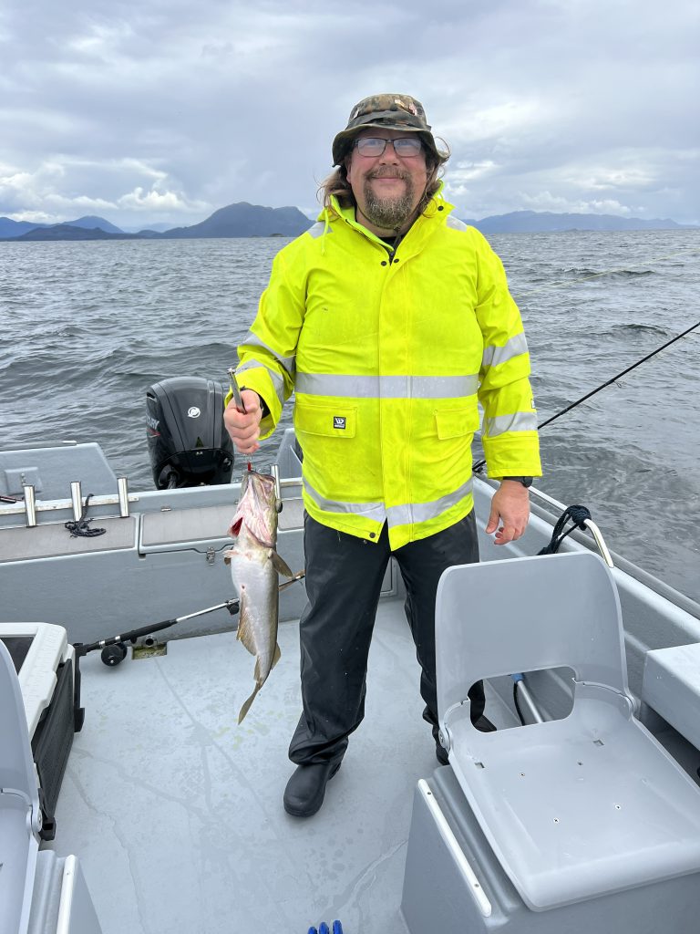 Heute trifft es Jan, sein Köder verfängt sich auf über 100 Meter Tiefe am Boden – und kein Ben dabei, der das Boot lenken könnte… Also übernehme ich das mehr oder weniger gut. Jan bekommt den Köder frei, aber irgendwie zuckt es gleich wieder. Jan zieht und zieht und zieht. Am Ende hat er einen schönen, großen Dorsch (ca. 80 cm) an Land gezogen. (Anmerkung Ben: „der Dorsch war auf keinen Fall größer, als der Leng, den er geangelt hat!“)