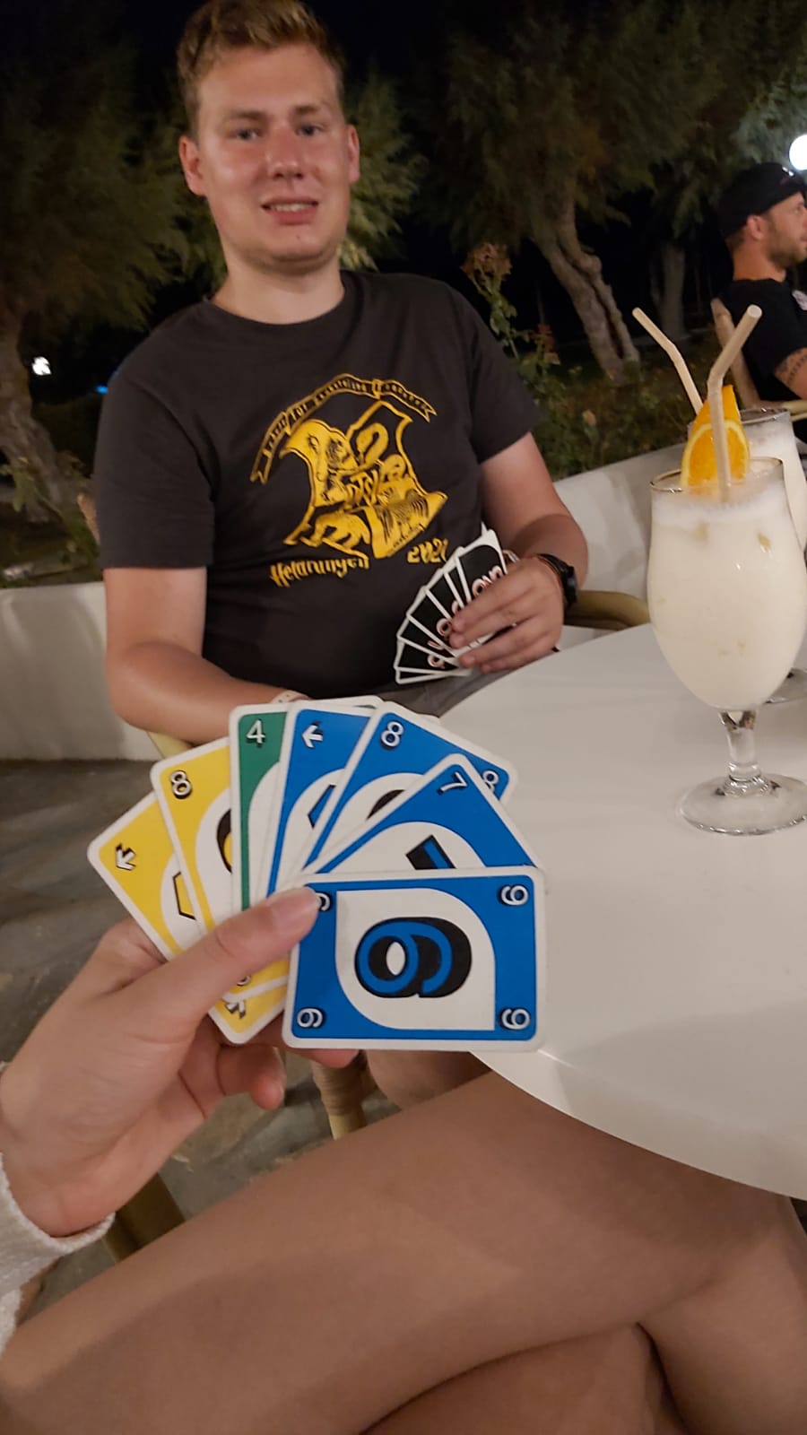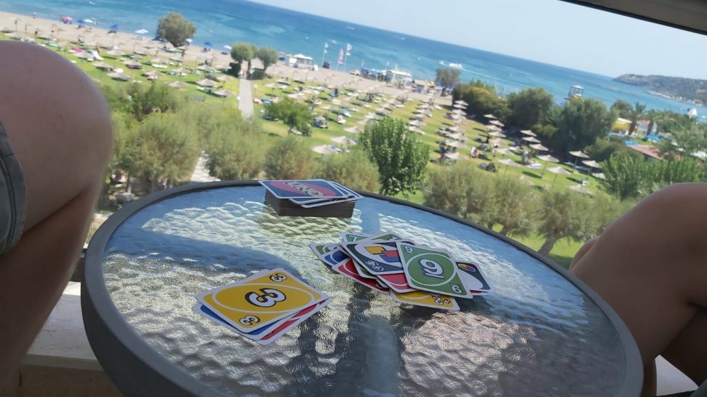 Als die Mittagssonne anfing zu brennen, gingen wir aufs Zimmer und spielten noch ein paar Runden UNO auf dem Balkon.
