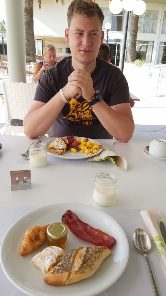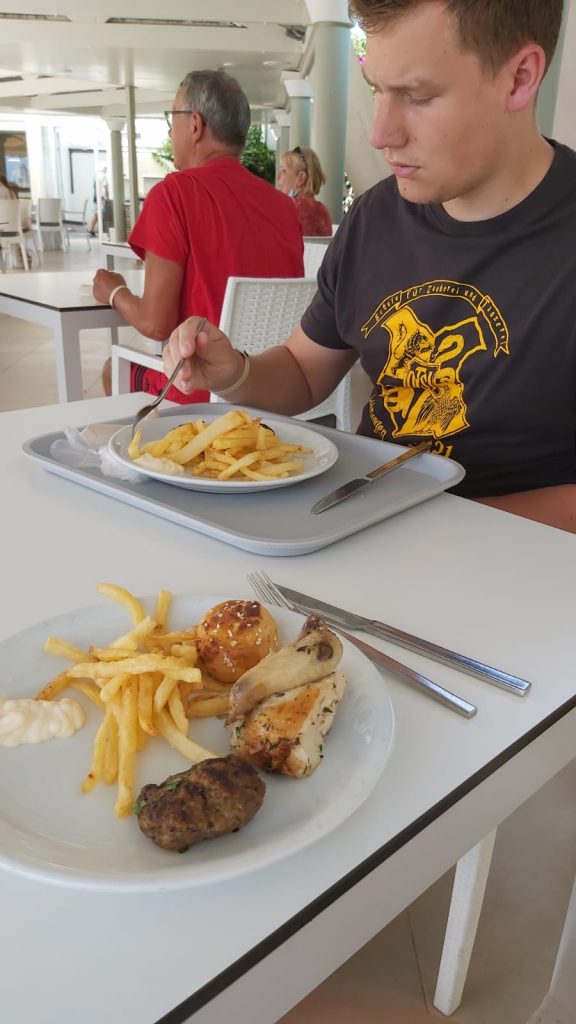 Dann war es auch schon wieder Mittagsessenzeit. Das Buffet war reich gefüllt und sehr lecker. Für Ben gab es Beefsteaks mit Pommes und für mich Beefsteak, Hähnchen, Pommes und ein griechisches Gebäck als Nachtisch.