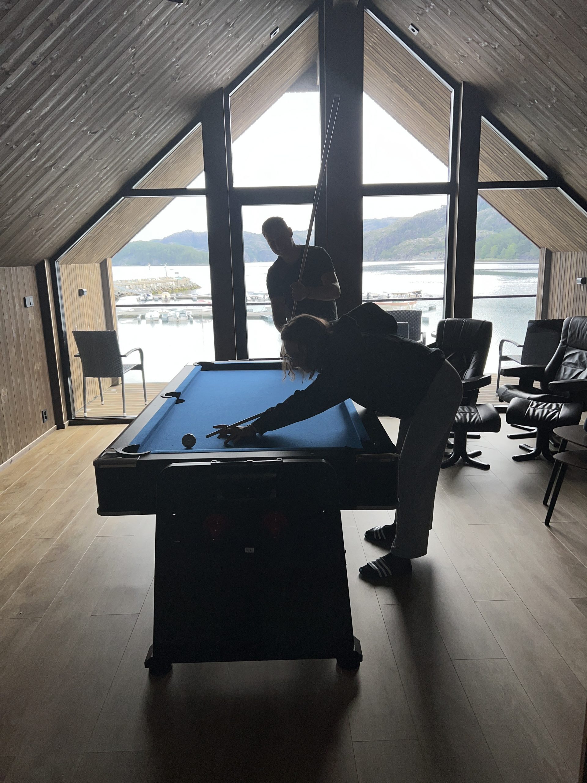 Kurz vor 9 ist das Haus leer und in Ordnung. Jan versucht uns an der Fähre anzumelden und Ben und Celina spielen eine letzte Runde Billard.