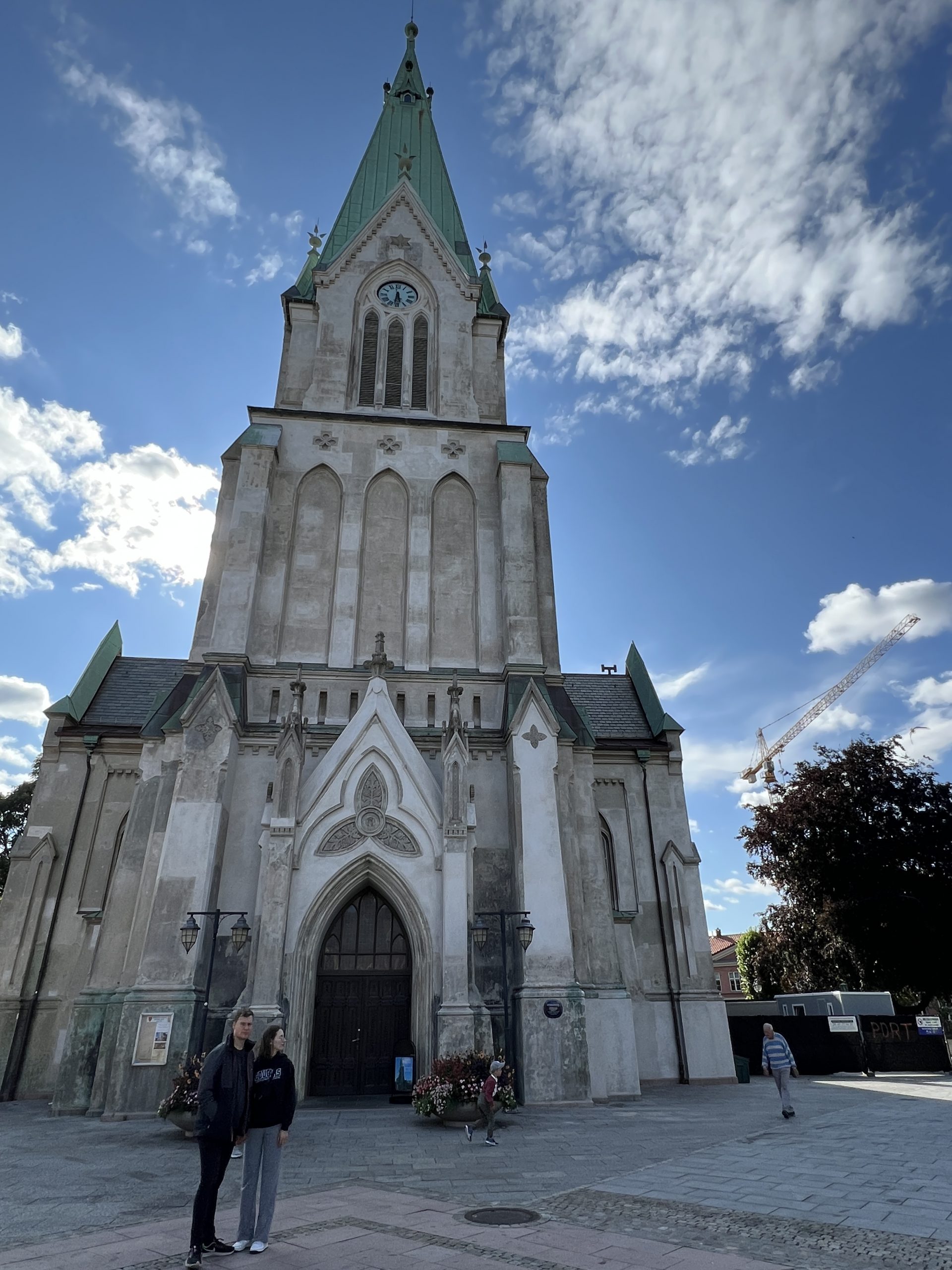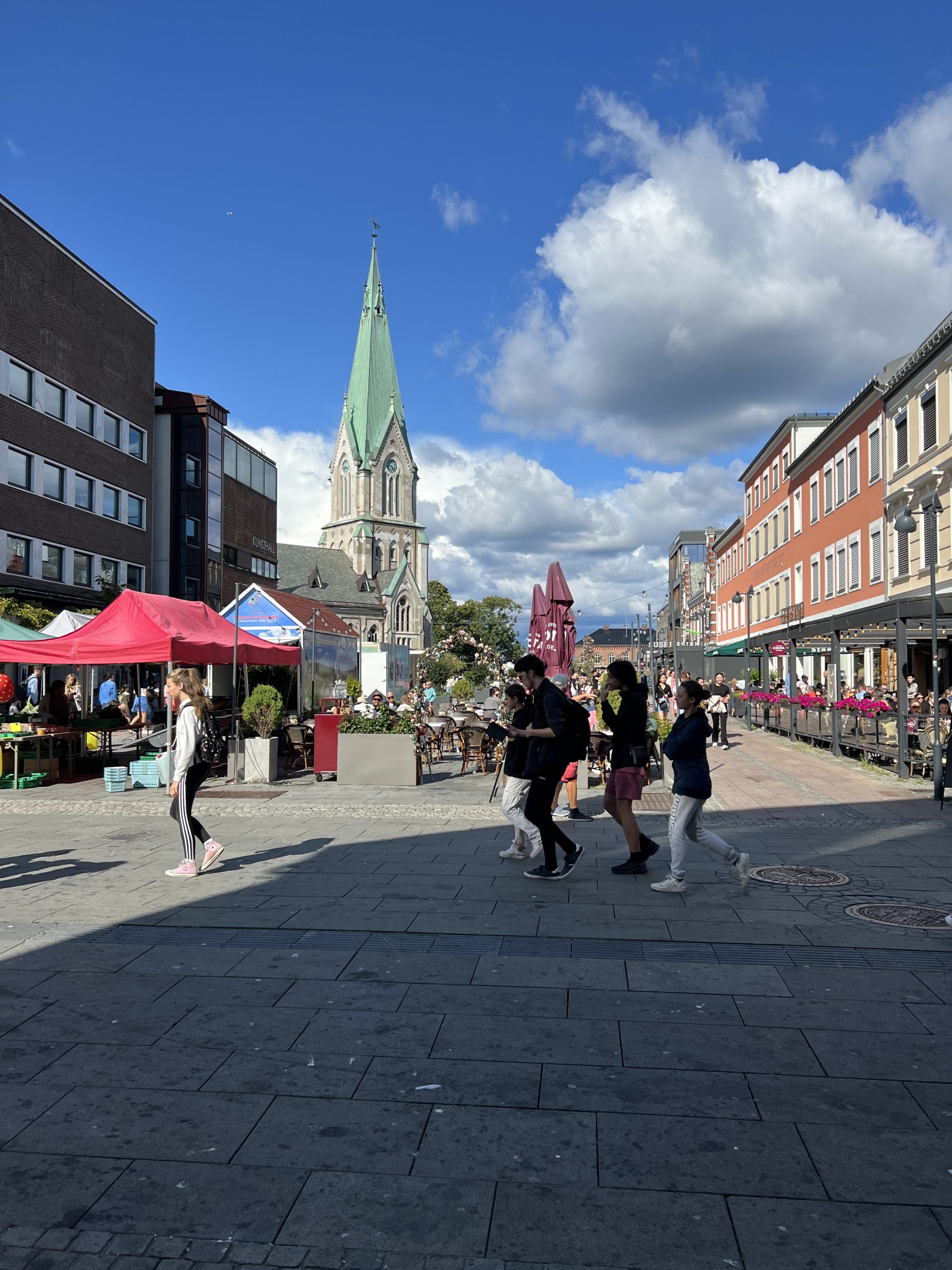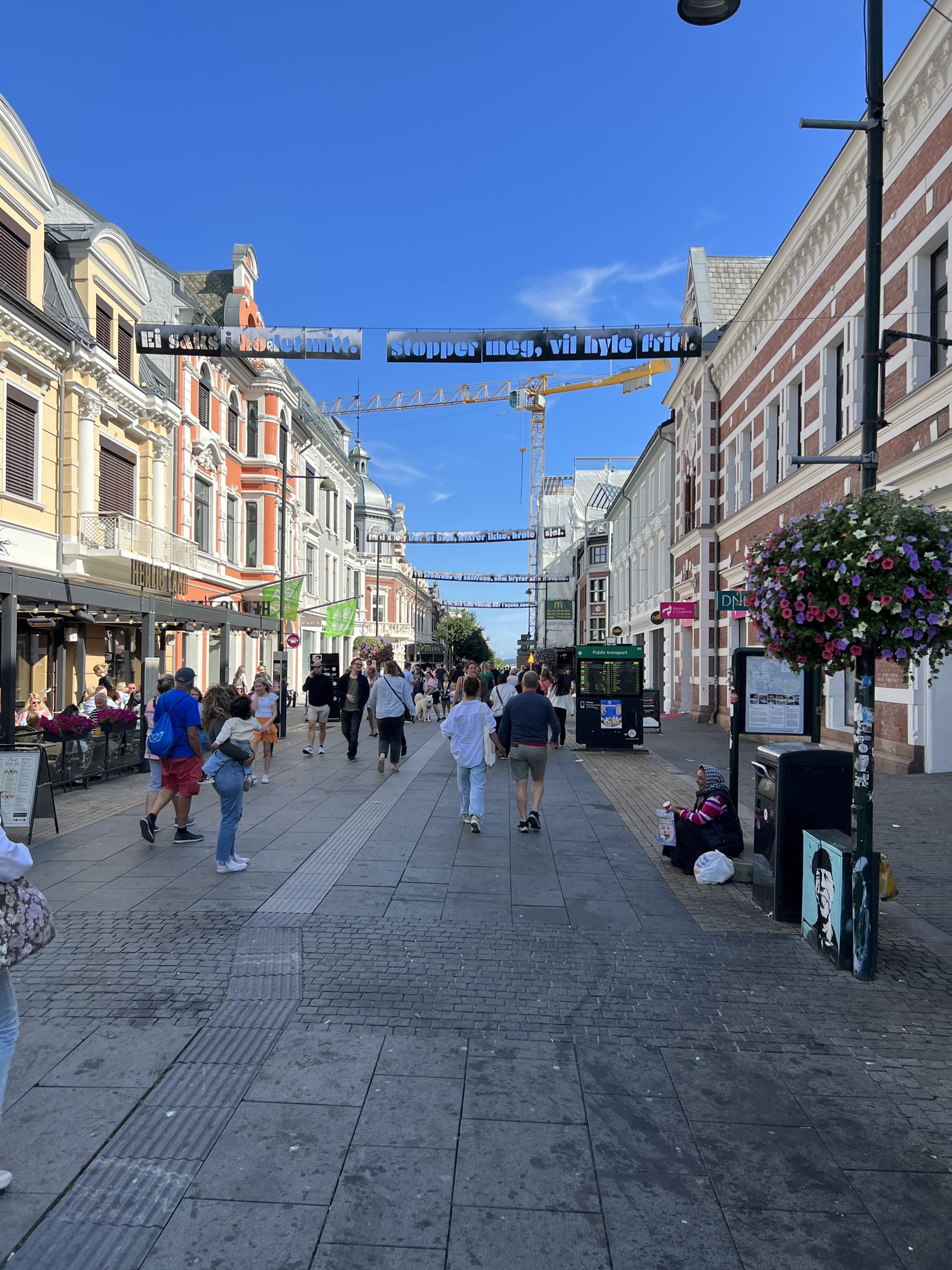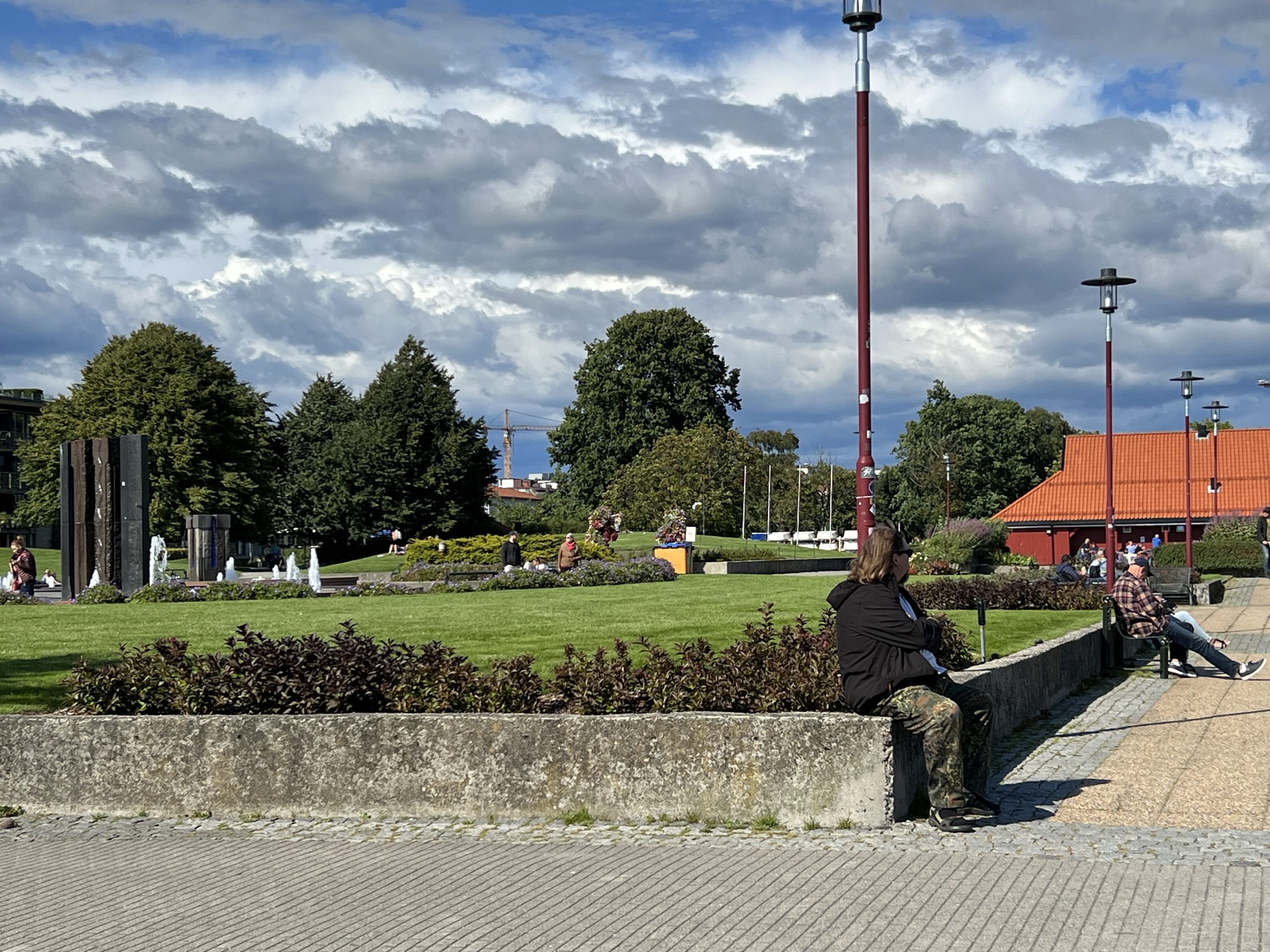 Bevor wir zur Fähre fahren, schauen wir uns das Zentrum von Kristiansand an. Es ist herrlicher Sonnenschein, ideal zum Bummeln. Überall hängen herrliche Blumenampeln. Ansonsten entsprechen die Baustile nicht so ganz unserem Geschmack. Kristiansand war im 19. Jhd mehreren Bränden zum Opfer gefallen. Danach durften keine Holzhäuser mehr gebaut werden. So bauten die Leute im aktuell modernen Stil – Klassizismus, d.h. sie belebten alte Baustile je nach finanzieller Lage, mehr oder weniger aufwendig, wieder.