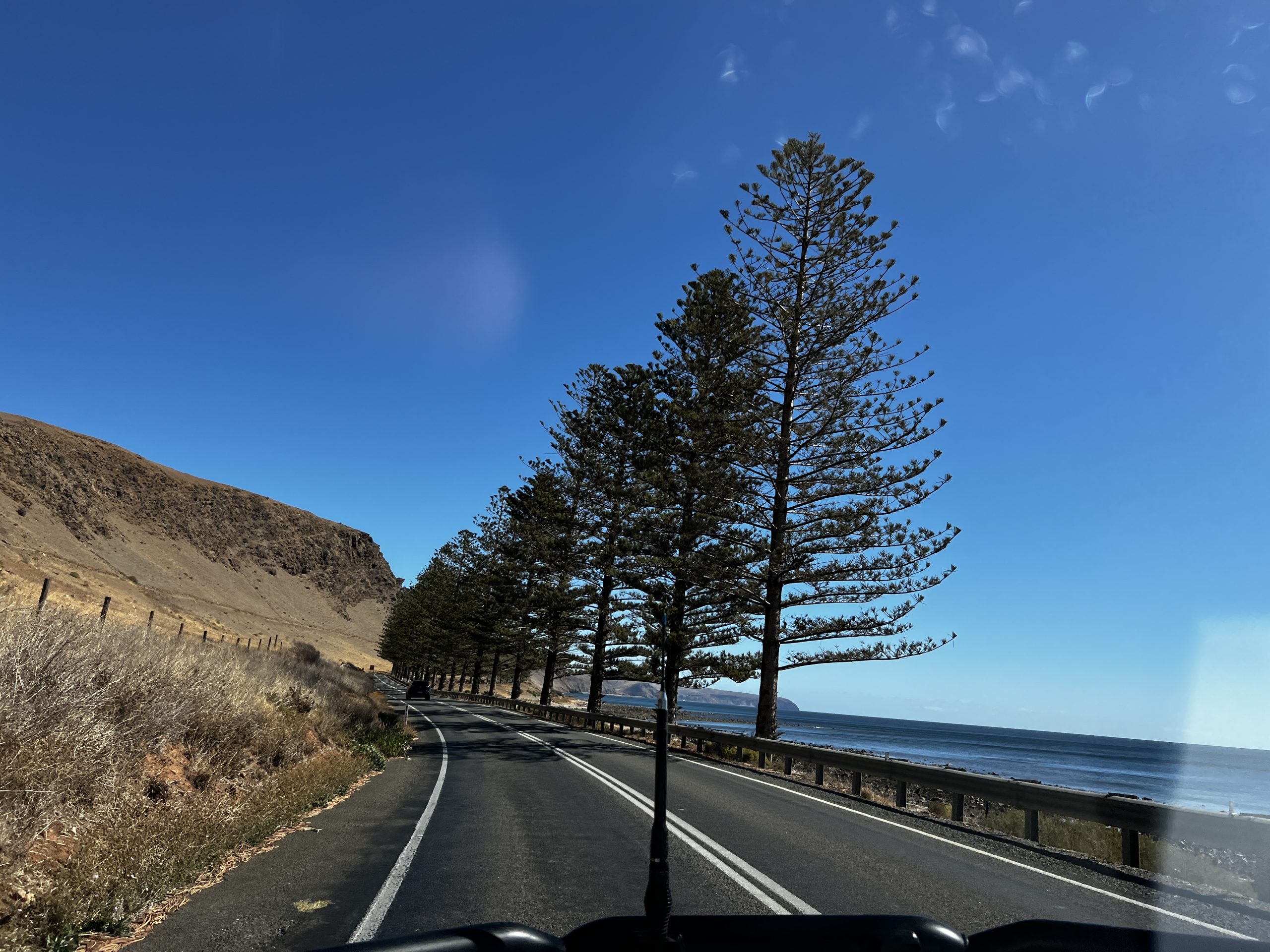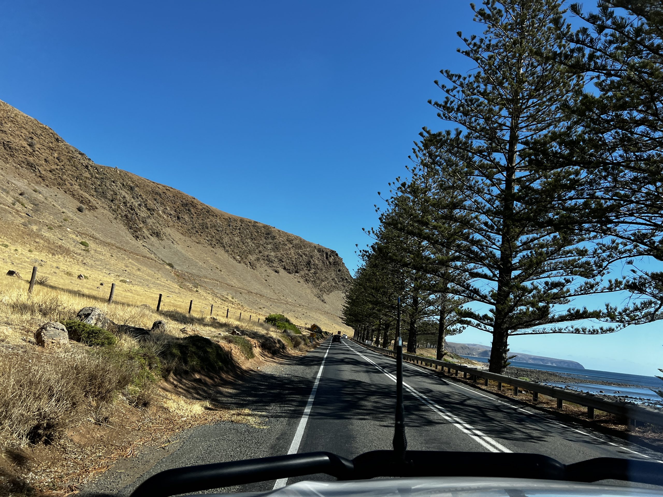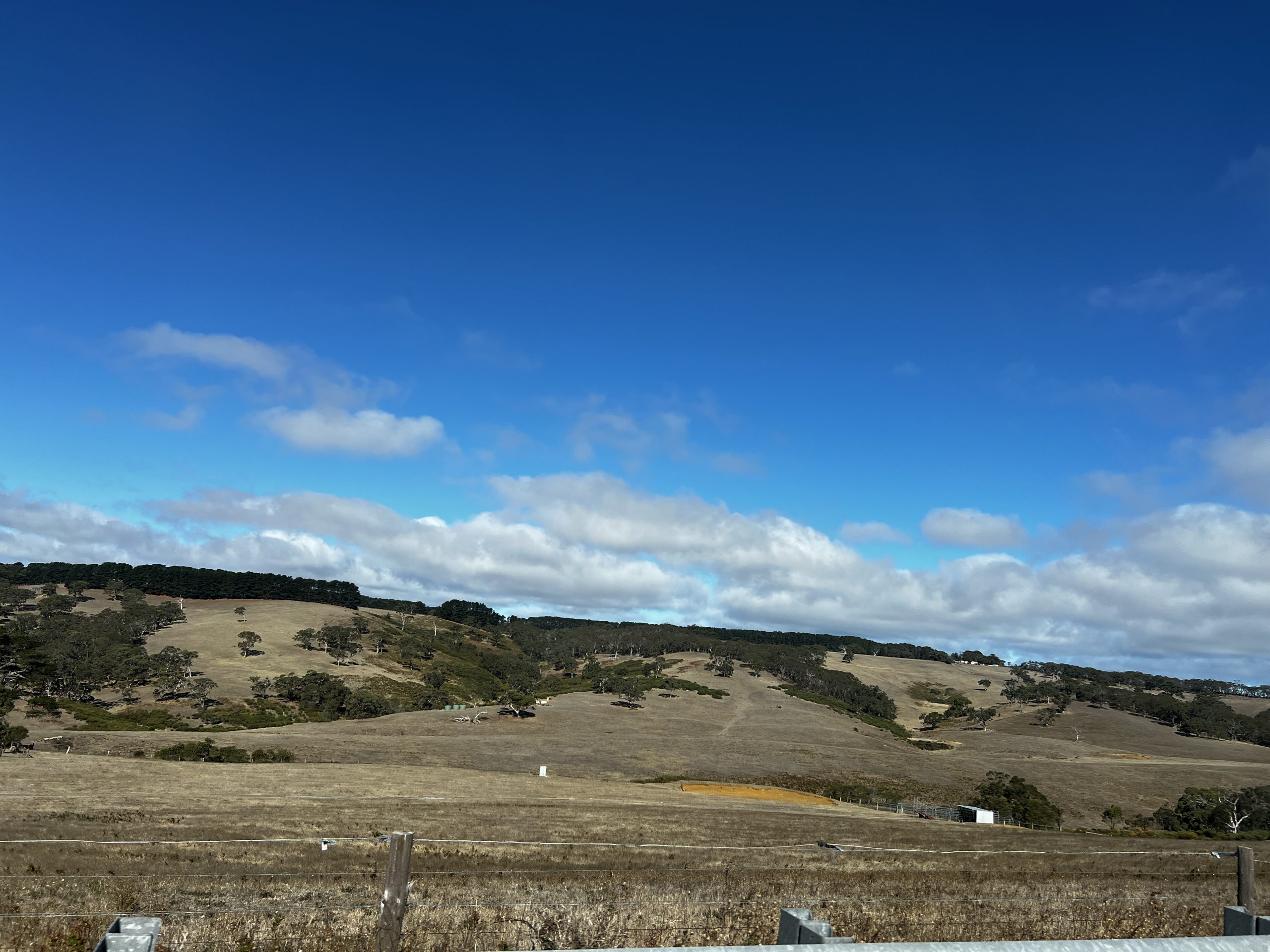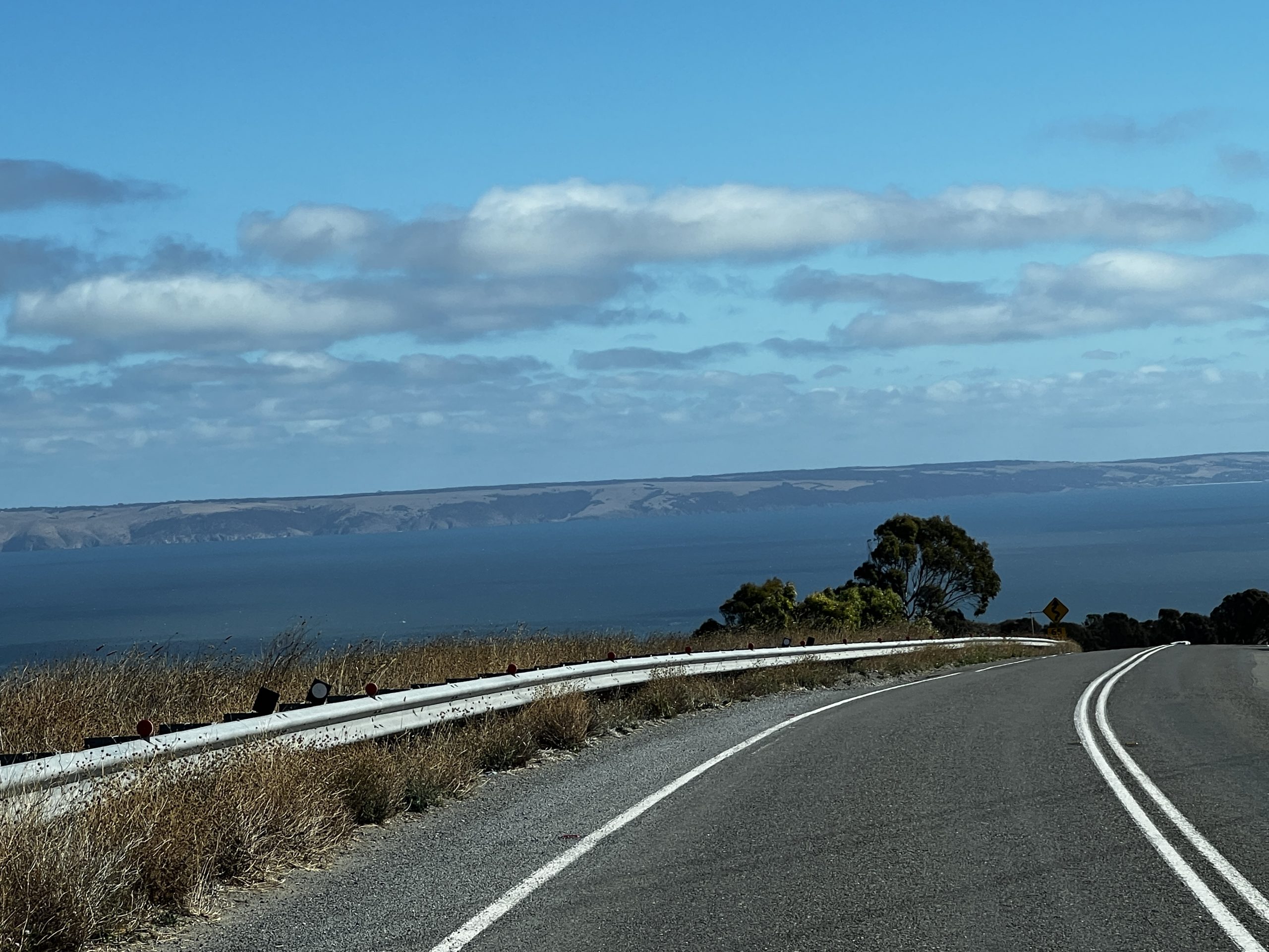 Dann fahren wir in Richtung Fährhafen für Kangaroo Island. Die Einsamkeit ist vorbei, es gibt riesige Felder, Weinplantagen, Olivenplantagen und Tierfarmen. Nach und nach wird es wieder grüner und auch bergiger.
