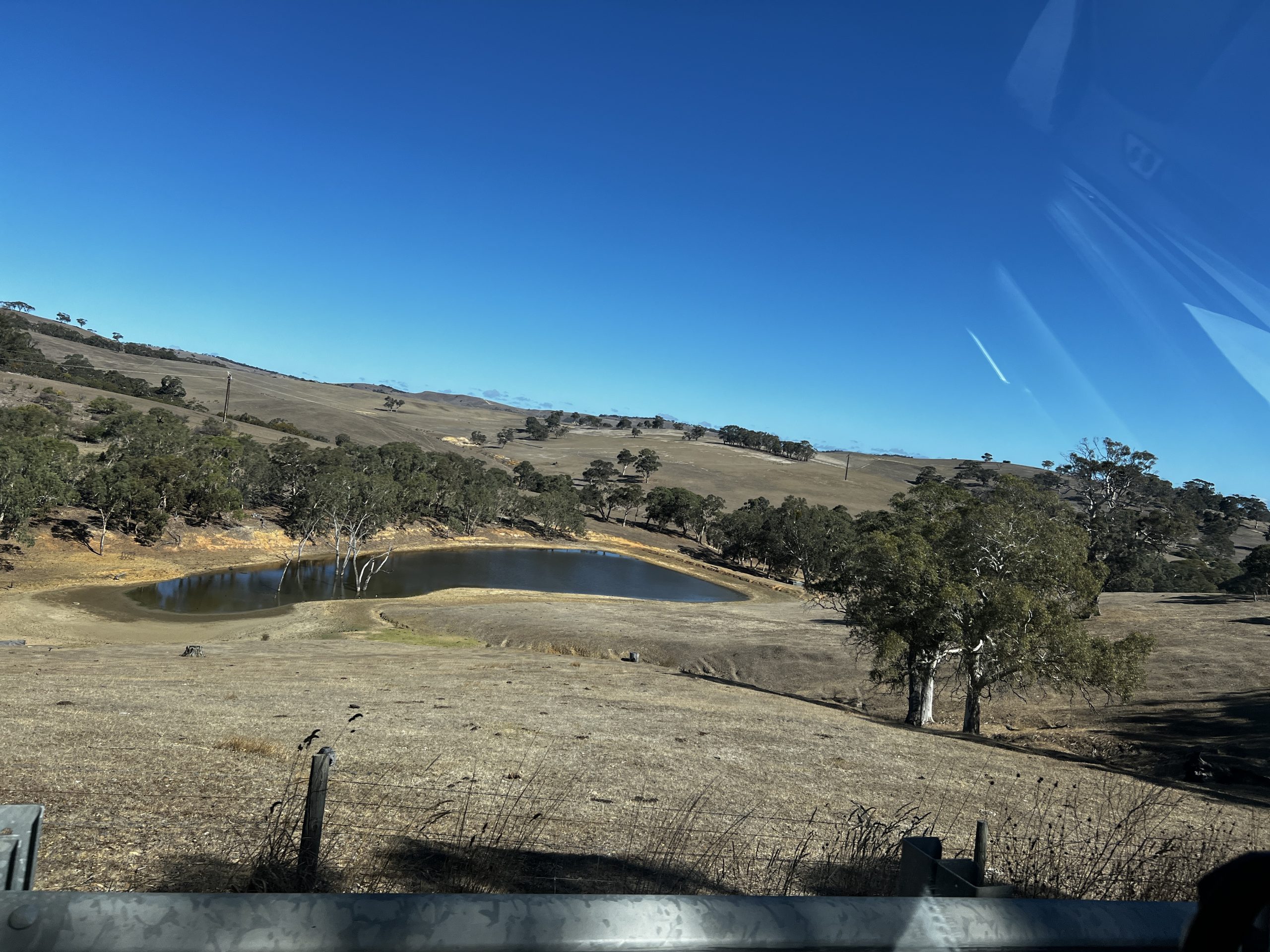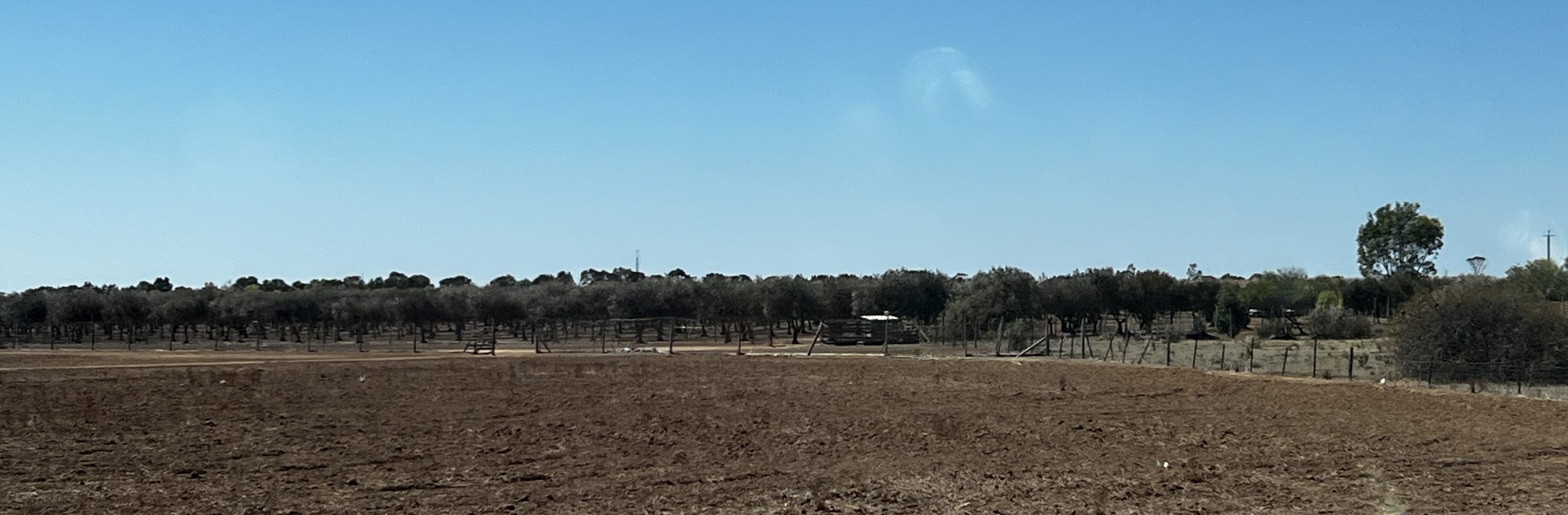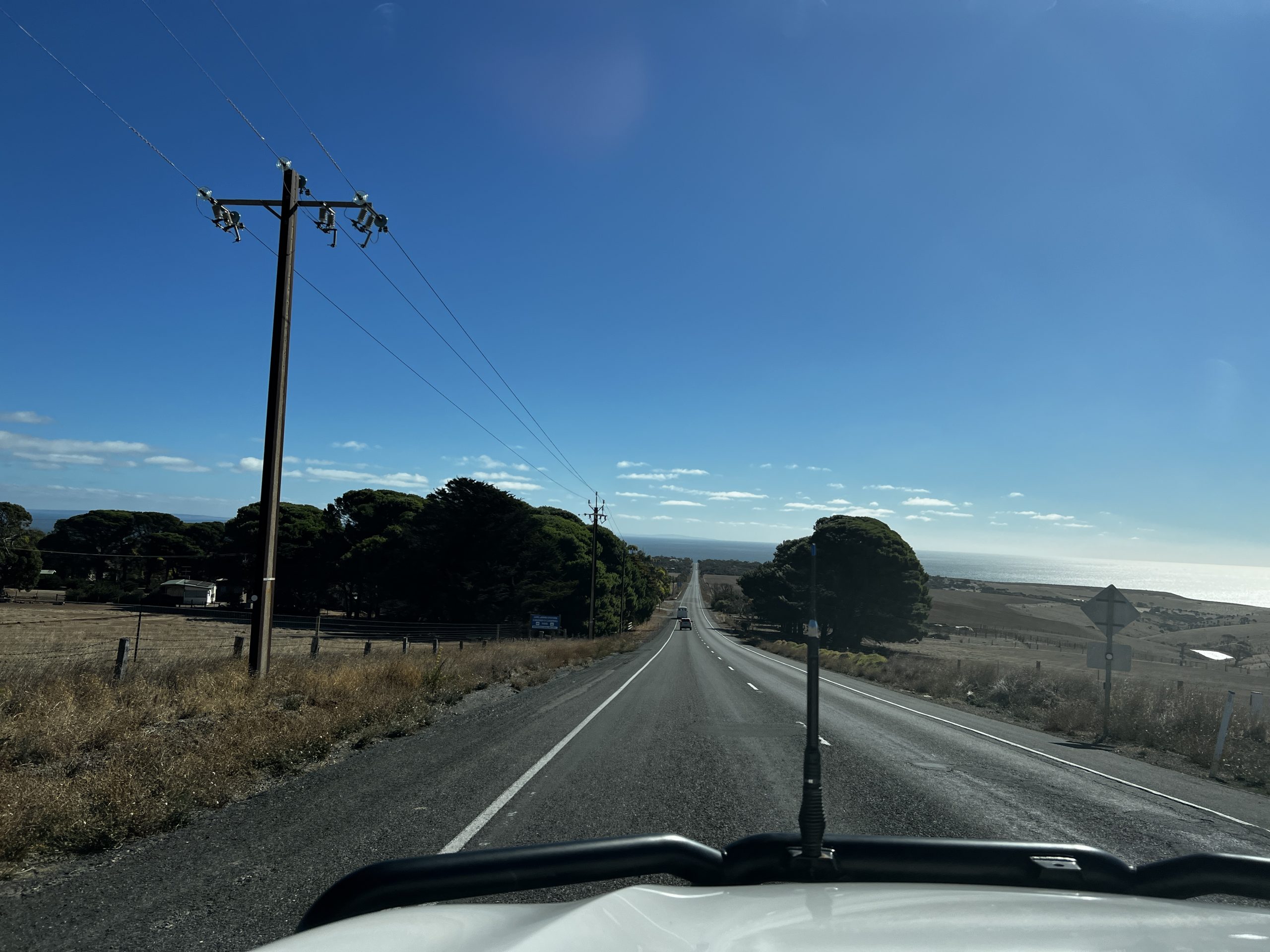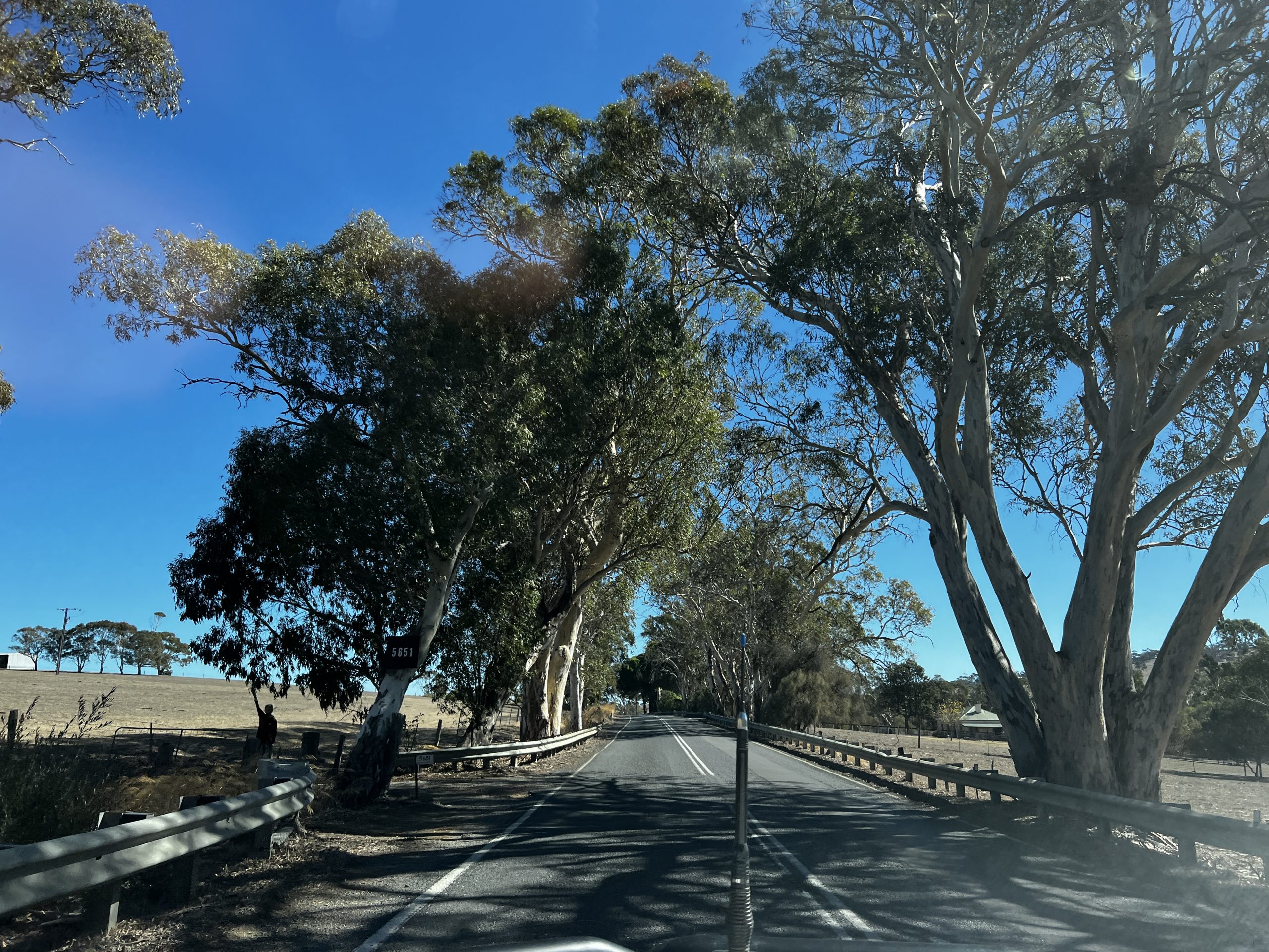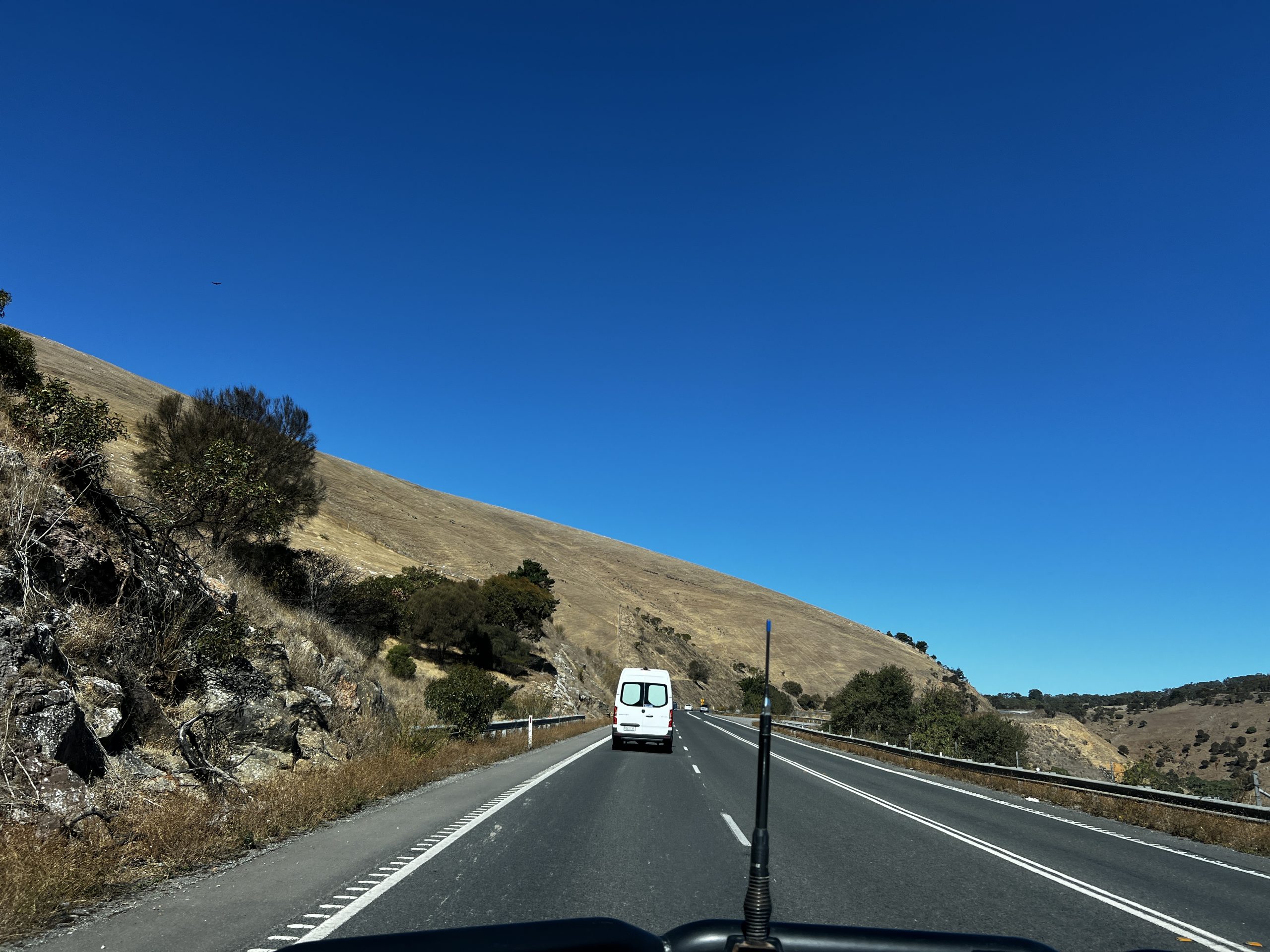 Dann fahren wir in Richtung Fährhafen für Kangaroo Island. Die Einsamkeit ist vorbei, es gibt riesige Felder, Weinplantagen, Olivenplantagen und Tierfarmen. Nach und nach wird es wieder grüner und auch bergiger.