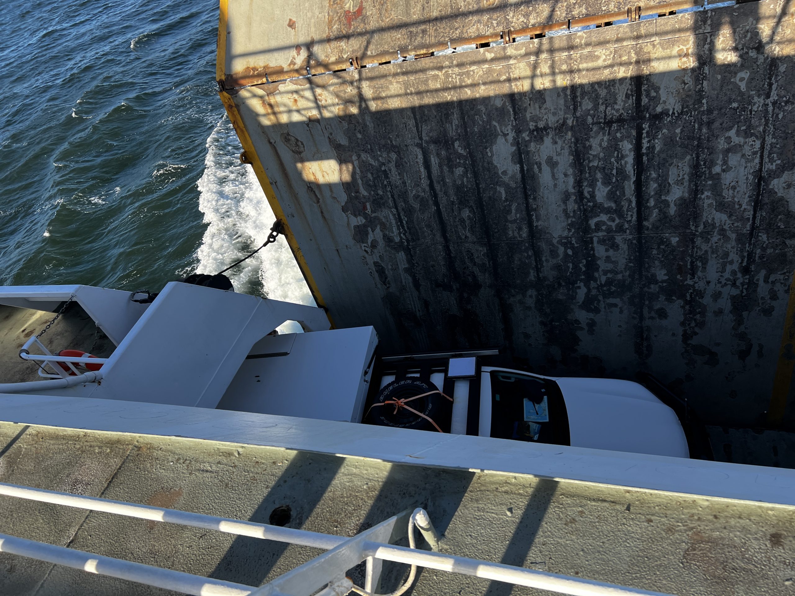 Wir haben die letzte Fähre gebucht, stellen uns aber in die Wartespur in der Hoffnung schon um 6 mit wegzukommen. Die Wartezeit überbrücken wir mit der Zubereitung und Vertilgung von Sandwiches.