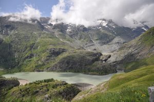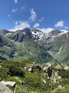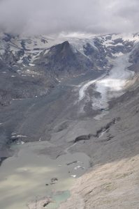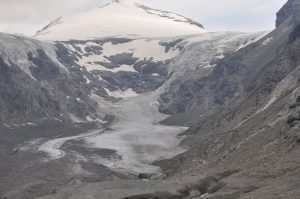 Wir erreichten nach ein paar Pausen und einigen Bildern dann den Großglockner. Wir parkten in einem Parkhaus und das Schild „Gletscherbahn“ konnten wir schon von weiten lesen. Auch den Gletscher konnten wir nun sehen. Ich habe mir das ganz anders vorgestellt, ich dachte, dass der Gletscher noch viel näher ist. Wir fuhren dann mit der Bahn nach unten. Als die Bahn 1960 errichtet wurde endete die Bahn genau da, wo der Gletscher anfing. Ca. 1850 hatte er die größte Ausdehnung und hat seither 11 km² an Fläche verloren. Wir erkundeten die felsige und vegetationslose Landschaft und hielten Ausschau nach den Murmeltieren. Es wurden einige Schilder aufgestellt, an welchen man sehen kann, in welchem Jahr der Gletscher wo war und wie er da aussah. Wir haben den Weg bis hin zum Gletscher nicht geschafft. Dieser erfordert mehr Zeit und geeigneteres Schuhwerk. Ich bin mir nicht mal 100 %-ig sicher, ob man es überhaupt bis hin schafft oder ob man dafür geübter Kletterer sein muss. Mit der Kamera schauten wir die ganze Zeit nach Murmeltieren. Wir konnten sie die ganze Zeit akustisch wahrnehmen, sind uns aber nicht sicher, ob wir sie wirklich auf einem Bild festhalten konnten. Zugegeben, hätten wir nicht ewig lang die Felswände nach den Murmeltieren abgesucht, hätten wir es wahrscheinlich auch viel weiter zum Gletscher geschafft. Aber auch wenn wir diesen nicht erreicht haben, war es dennoch eine einzigartige Erfahrung und die gesammelten Eindrücke können nicht ansatzweise auf Bildern eingefangen werden.