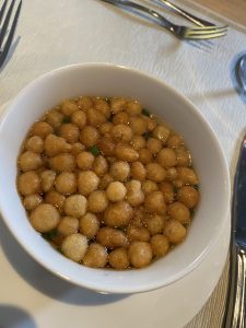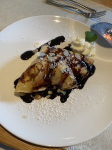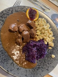 Als wir um 18:20 Uhr im Hotel ankamen, gingen wir uns umziehen und dann schnell zum Abendessen. Wir genossen heute beide zum Hauptgang Rindergulasch mit Spätzle und Rotkraut und als Dessert Palatschinken mit Eis. Im Anschluss an das Essen setzten wir uns nochmal in eine Chill-Lounge. Nach einer kurzen Verdauungsphase holten wir uns Kniffel. Dieses wollten wir eigentlich auf der Terrasse spielen, leider war es dann auch wieder sehr windig und der Himmel wurde immer dunkler, also haben wir beschlossen uns noch etwas reinzusetzen bevor wir dann ins Bett gehen.