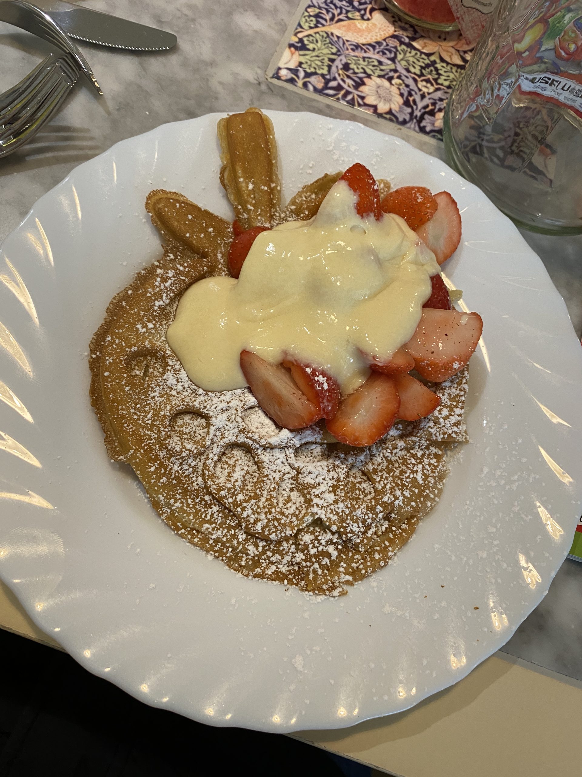 Da wir schon online die Tickets gekauft haben, mussten wir uns nicht an der Schlange anstellen und konnten direkt rein gehen. Als wir gegen halb 11 den Erlebnispark betraten, waren kaum Menschen da. Es war alles noch ziemlich leer. Olaf bekam den Gedanken der leckeren Erdbeere-Waffeln nicht mehr aus dem Kopf, nachdem wir an einem Stand im Eingang vorbei gegangen sind, also sind wir schnell nochmal zurück (wobei wir durch den ganzen Park und die Läden gehen mussten), um eine Waffel zu essen. Lucas, Olaf und ich haben eine leckere Waffel mit Erdbeeren und Sahne bzw. Vanillesoße gegessen und Tim hatte eine herzhafte Waffel, mit Rucola, Bacon und Sour Creme.