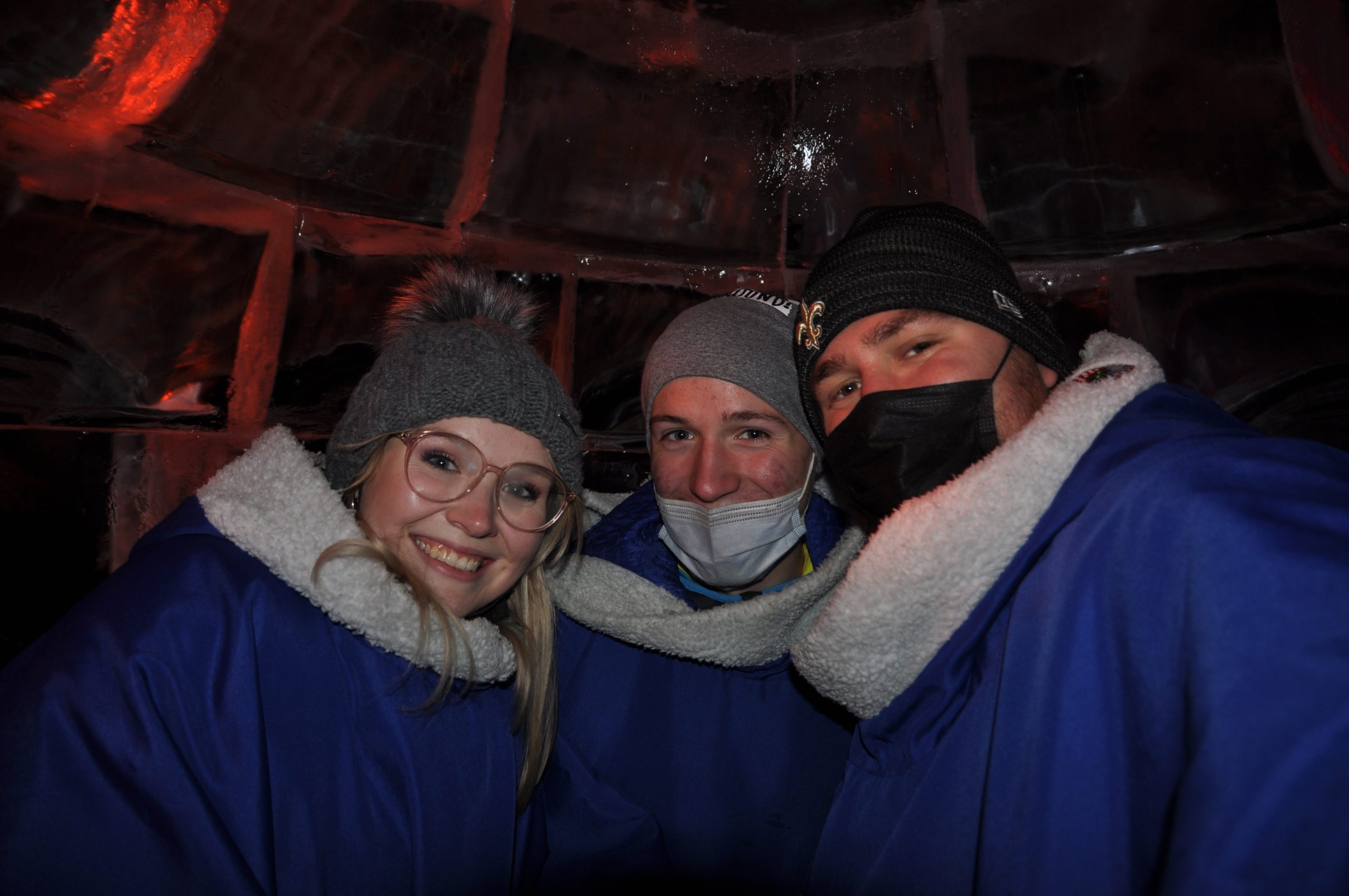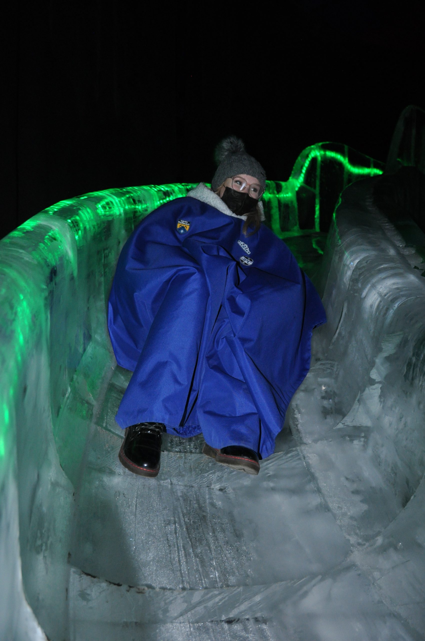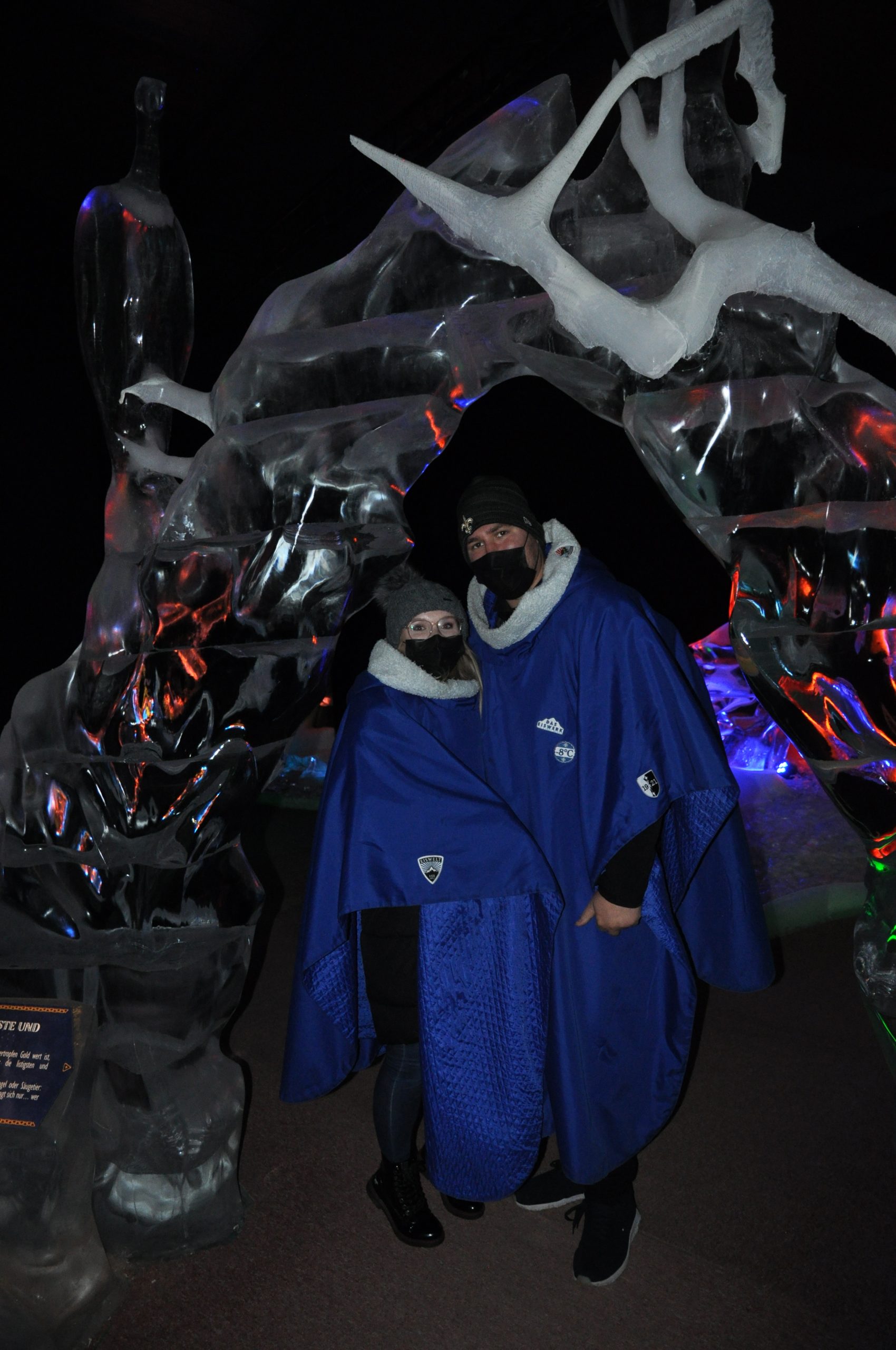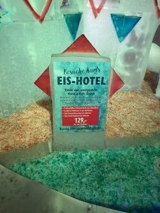 Nach einigem Suchen und einmal Fragen haben wir diese dann endlich gefunden. Im Eingangsbereich hingen wunderschöne blaue Ponchos bereit, welche wir uns überzogen und nach einem hin und her und hoher Überredungskunst, hat sich auch Tim einen Poncho angezogen. Wir liefen durch einen Gang, an dem, an den Wänden verschiedene Bilder von Eiskunstwerken hingen. Mir wurde erst beim Herauslaufen bewusst, dass diese alle schon mal bei Karls ausgestellt wurden. In diesem Gang waren die Temperaturen sehr angenehm und ich zweifelte kurz daran, ob Tim vielleicht doch Recht haben könnte und wir diese Ponchos nicht unbedingt bräuchten. Wir gingen dann durch zwei große Türen und schnell wurde mir bewusst, dass es die richtige Entscheidung war die Umhänge an zu haben. In dieser Eiswelt waren -8°. Wir konnten beeindruckende Kunstwerke bestaunen und konnten auch einige Eindrücke mit der Kamera festhalten. Es gab sogar eine Rutsche aus Eis. Lucas und ich konnten es uns natürlich nicht nehmen lassen mit dieser zu rutschen. Mithilfe eines leckeren Erdbeer-Glühweins konnten wir uns etwas die Hände wärmen. Man hat die Möglichkeit eine Nacht in Karls Eis-Hotel zu übernachten. Direkt in der Eiswelt befindet sich das „Zimmer“. Man würde dann zwei dicke Schlafsäcke, ein paar dicke Felle und einen Picknick-Korb bekommen und kann dann die Nacht bei -8° in einem Eisbett verbringen.