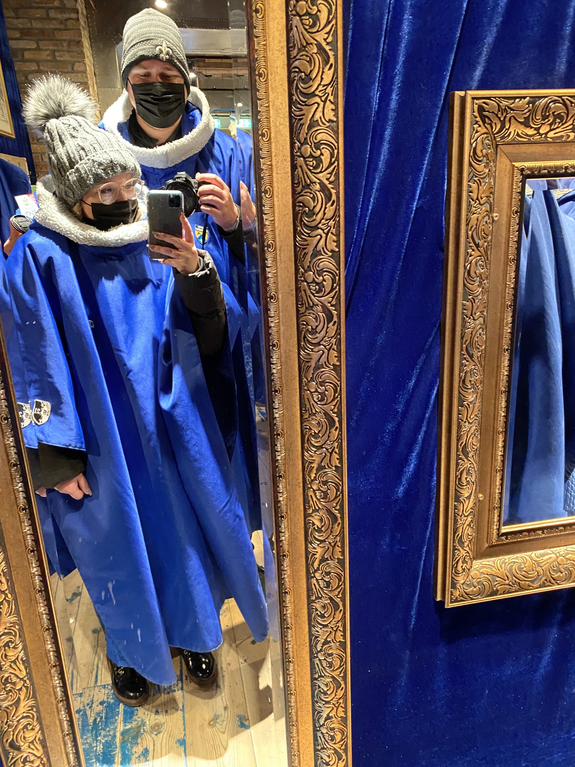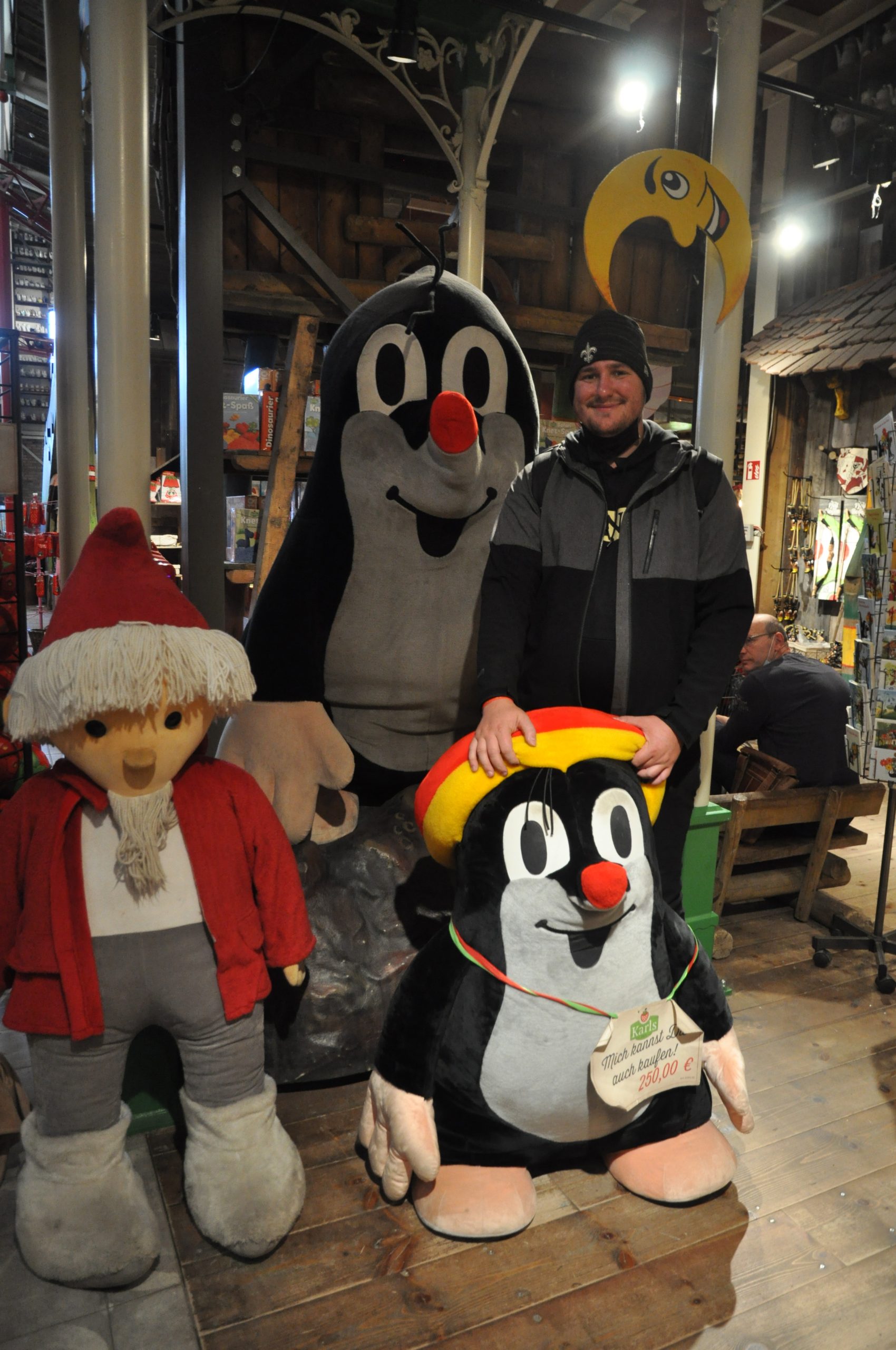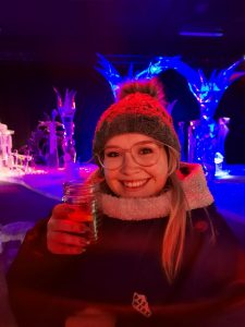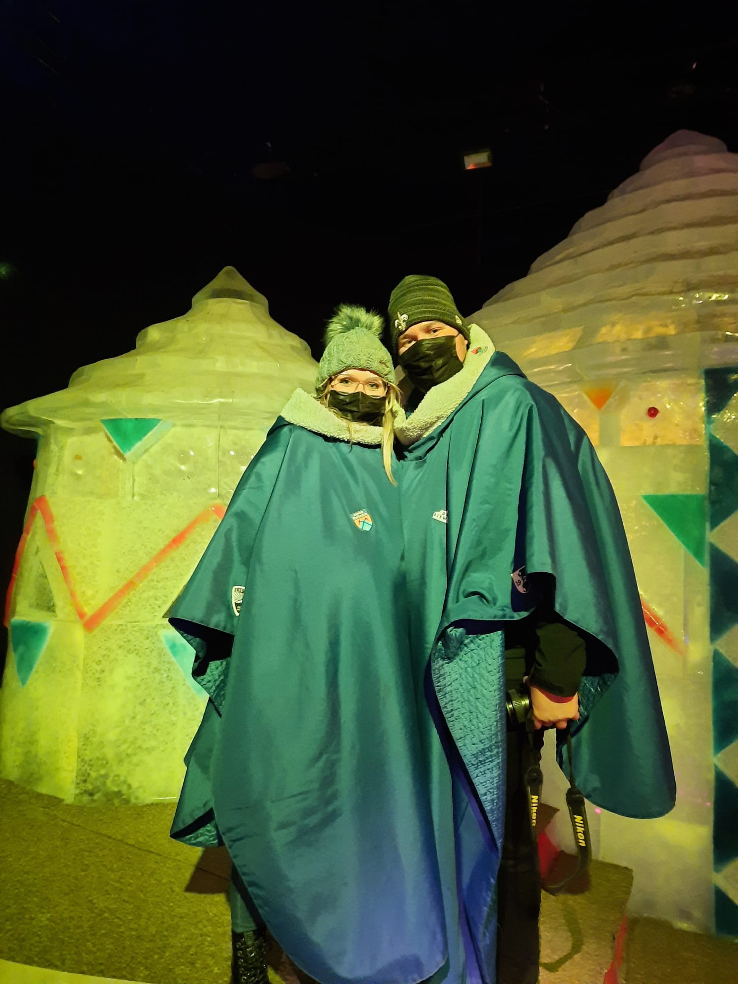 Nach einigem Suchen und einmal Fragen haben wir diese dann endlich gefunden. Im Eingangsbereich hingen wunderschöne blaue Ponchos bereit, welche wir uns überzogen und nach einem hin und her und hoher Überredungskunst, hat sich auch Tim einen Poncho angezogen. Wir liefen durch einen Gang, an dem, an den Wänden verschiedene Bilder von Eiskunstwerken hingen. Mir wurde erst beim Herauslaufen bewusst, dass diese alle schon mal bei Karls ausgestellt wurden. In diesem Gang waren die Temperaturen sehr angenehm und ich zweifelte kurz daran, ob Tim vielleicht doch Recht haben könnte und wir diese Ponchos nicht unbedingt bräuchten. Wir gingen dann durch zwei große Türen und schnell wurde mir bewusst, dass es die richtige Entscheidung war die Umhänge an zu haben. In dieser Eiswelt waren -8°. Wir konnten beeindruckende Kunstwerke bestaunen und konnten auch einige Eindrücke mit der Kamera festhalten. Es gab sogar eine Rutsche aus Eis. Lucas und ich konnten es uns natürlich nicht nehmen lassen mit dieser zu rutschen. Mithilfe eines leckeren Erdbeer-Glühweins konnten wir uns etwas die Hände wärmen. Man hat die Möglichkeit eine Nacht in Karls Eis-Hotel zu übernachten. Direkt in der Eiswelt befindet sich das „Zimmer“. Man würde dann zwei dicke Schlafsäcke, ein paar dicke Felle und einen Picknick-Korb bekommen und kann dann die Nacht bei -8° in einem Eisbett verbringen.