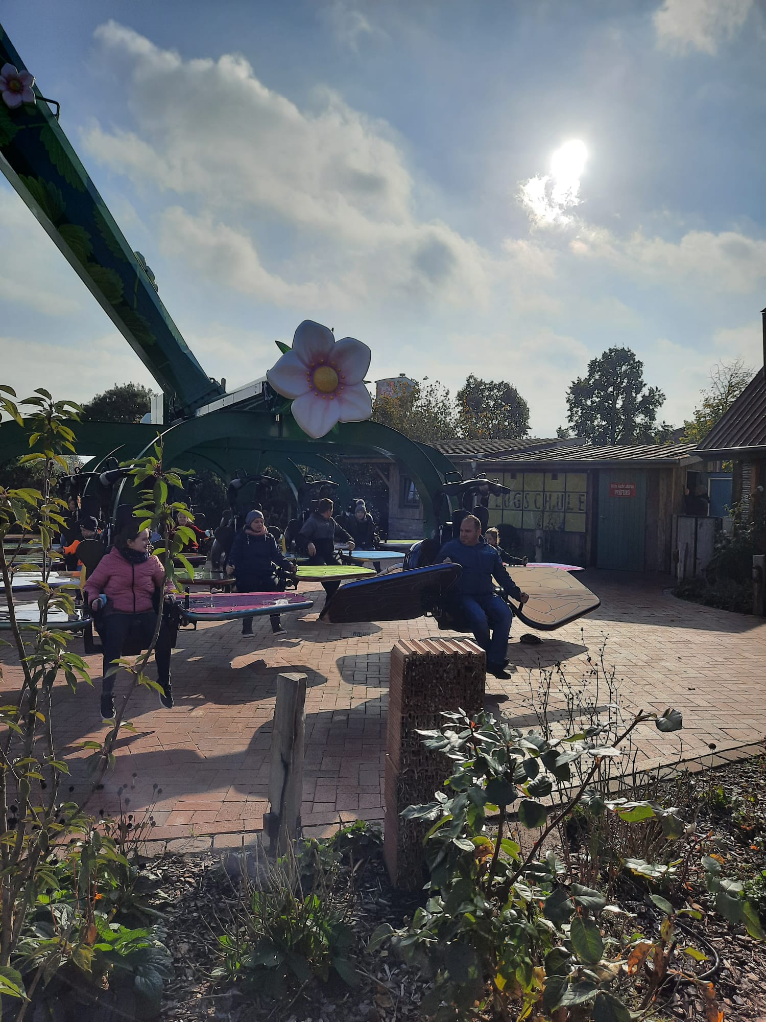 Nach dem Waffeln essen ging es für uns wieder zurück in den Park, wo Tim und ich ein Fahrgeschäft mit Bienen gefahren sind. Dieses hat sich im Kreis gedreht, ist nach oben und unten gefahren und mittels bewegen der Flügel war es möglich sich noch zu überschlagen. Tim hat sich ganze vier mal überschlagen und ich stellte fest, dass es dafür, dass es eine Kinderattraktion ist ganz schön schnell und hoch ist.