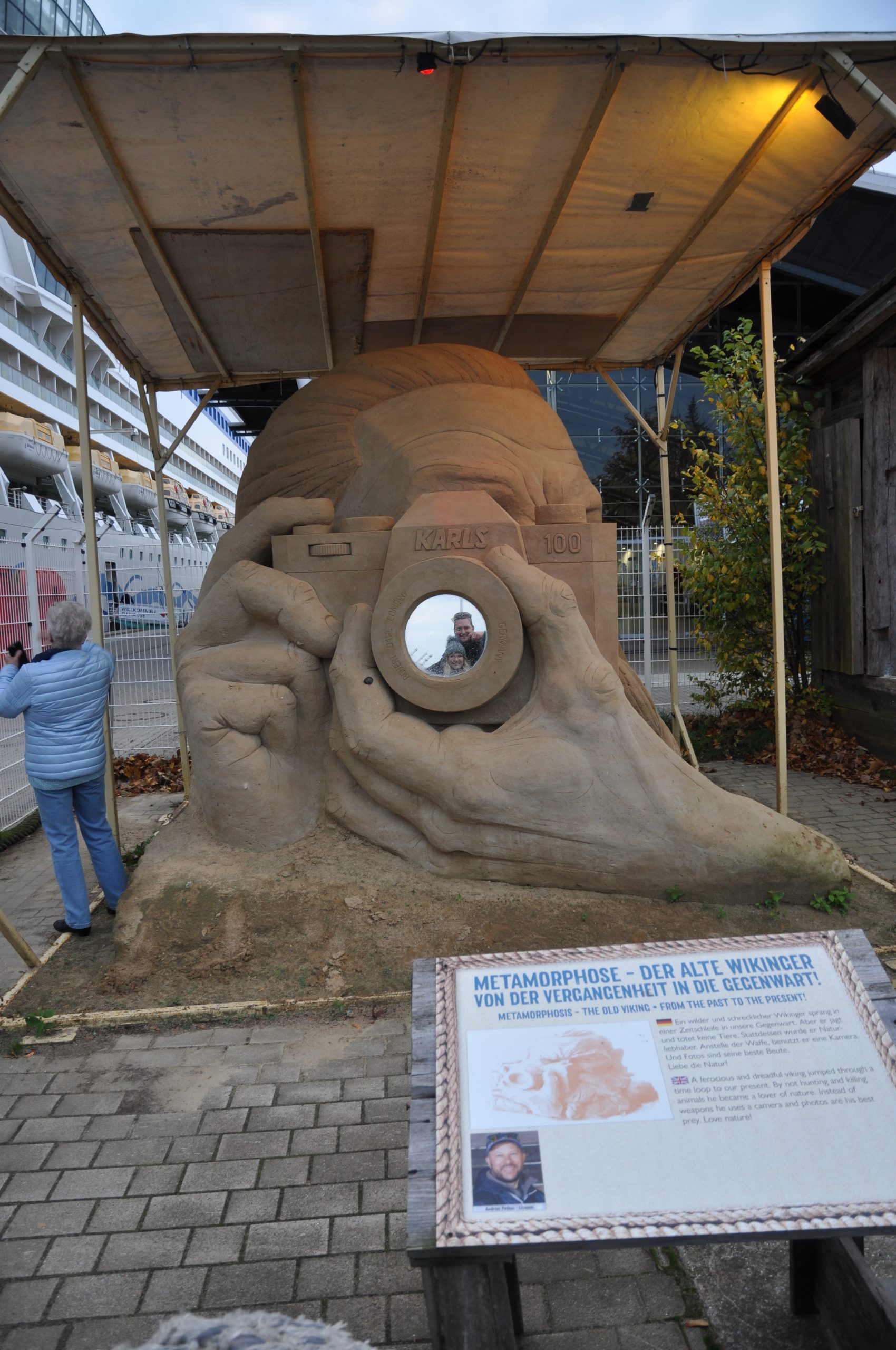 Weil wir zu den Eiswelten nochmal einen Gegensatz wollten, gingen wir zum Pier 7 und konnten dort die „Sandwelten“ Erstaunen. Auch die Skulpturen aus Sand waren beeindruckend, aber leider waren es nur sehr wenige. Faszinierender war in diesem Moment die AIDA. Das Kreuzfahrtschiff lag hatte heute von 8:00-18:00 Uhr im Hafen von Warnemünde. Um besser sehen zu können, wenn diese ausläuft sind wir etwas vor gelaufen und haben uns in der Nähe des Leuchtturmes einen schönen Platz gesucht. Es hat etwas einzigartiges zu sehen, wie so ein Kreuzfahrtschiff in See sticht.