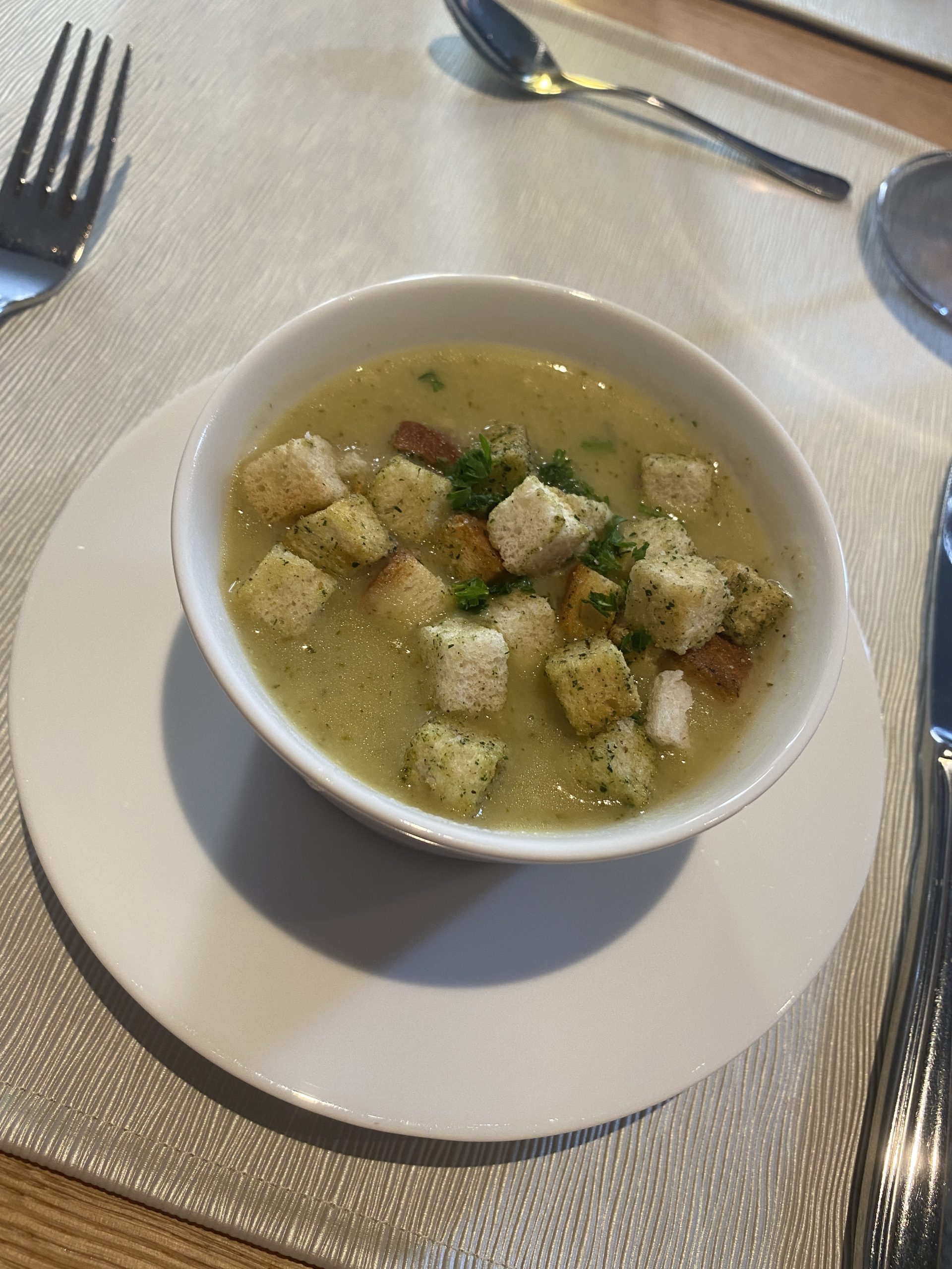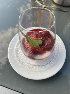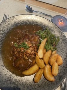 Mit dem Blick auf Waidring stellten wir fest, dass dort das Wetter nicht so schön ist und dunkle Wolken den Himmel schmücken. Gerade am Hotel eingeparkt begann ein Starkregen. Wir haben kurz gewartet und hofften, dass es gleich weniger werden würde. Dem war leider nicht so. Durch den Regen, rein ins Hotel begrüßte uns der Kellner. Er versicherte uns, dass es in spätestens einer halben Stunde aufhören wird. Dem war auch so. Kurz vor um sechs, schlüpften wir dann nochmal in unsere Badesachen und gingen noch einmal in den Badeteich. Das Wasser war sehr angenehm und wir hätten es wahrscheinlich noch Stunden darin ausgehalten. Nachdem wir noch ein paar Bahnen geschwommen sind, gingen wir nach oben, um uns für das Abendessen fertig zu machen. Um sieben nahmen wir den Platz an unserem Tisch ein und konnten mit dem Essen beginnen. Die Suppe war heute eine Zucchinicremesuppe mit Croutons. Unser Hauptgericht, ein Zwiebelrostbraten mit Bohnen, Wedges und Röstzwiebeln, war zum hineinlegen. Aber auch die Topfencreme mit Erdbeeren als Dessert war sehr lecker. Dieses konnten wir auf der Terrasse zu uns nehmen.