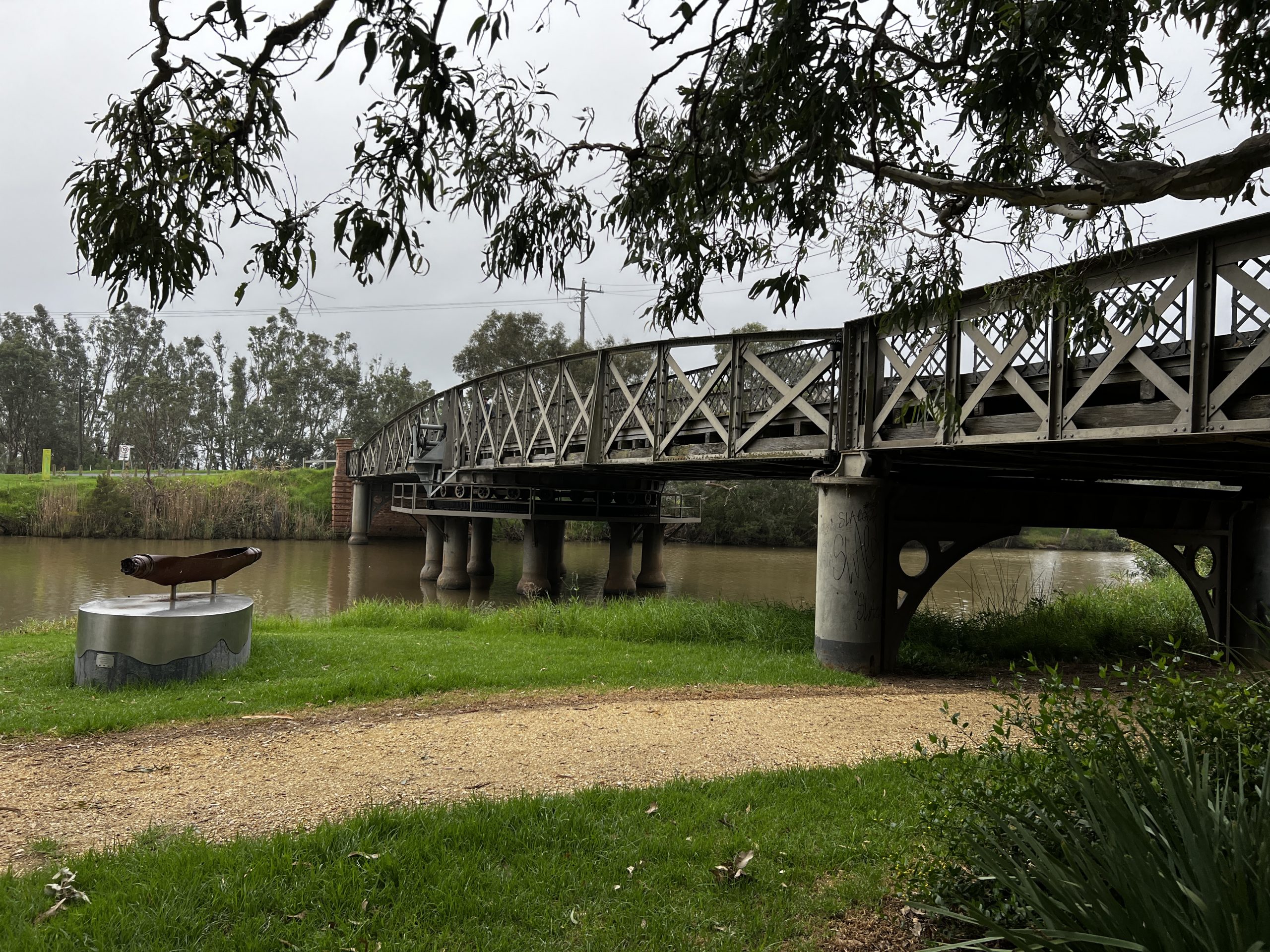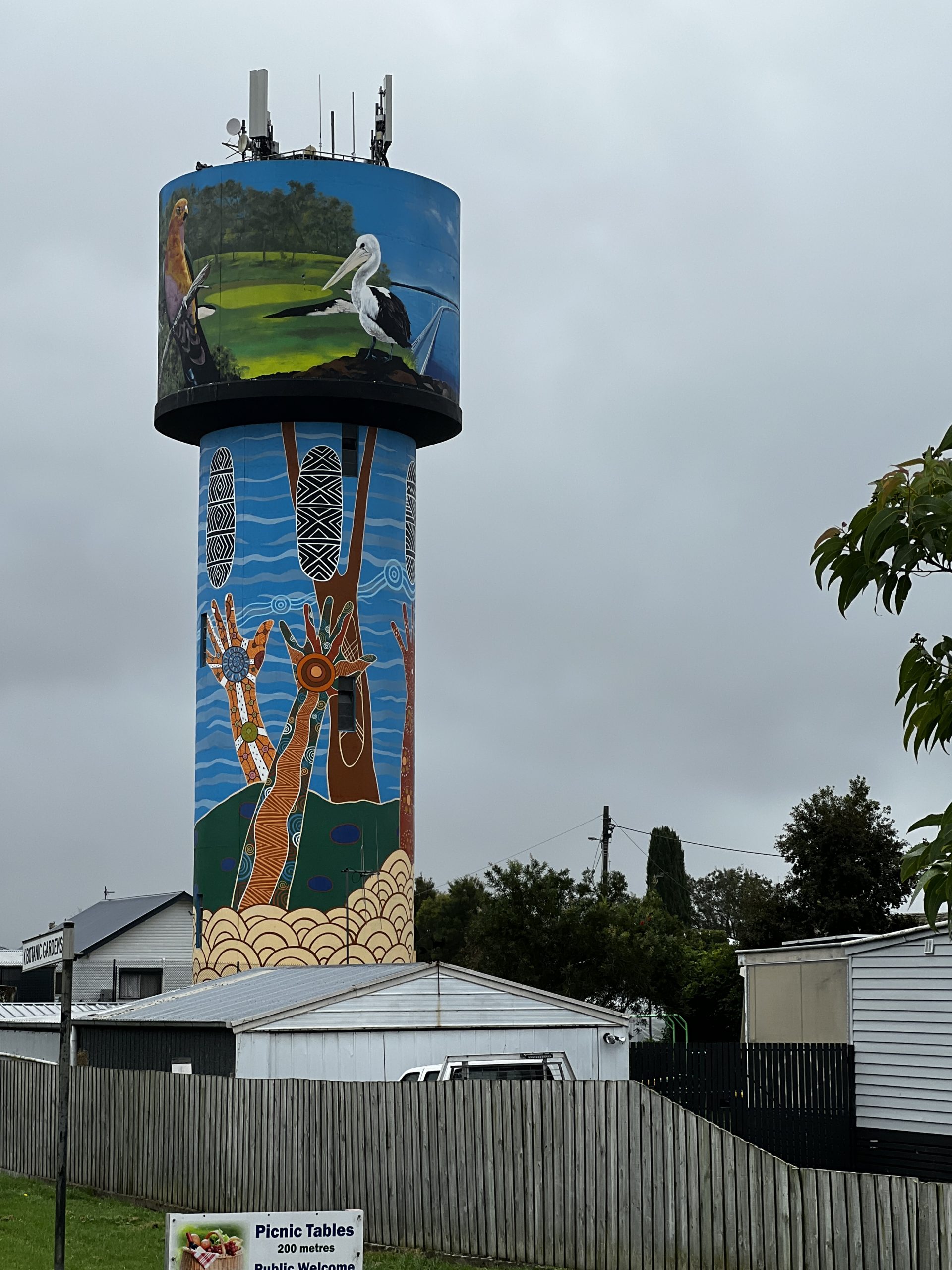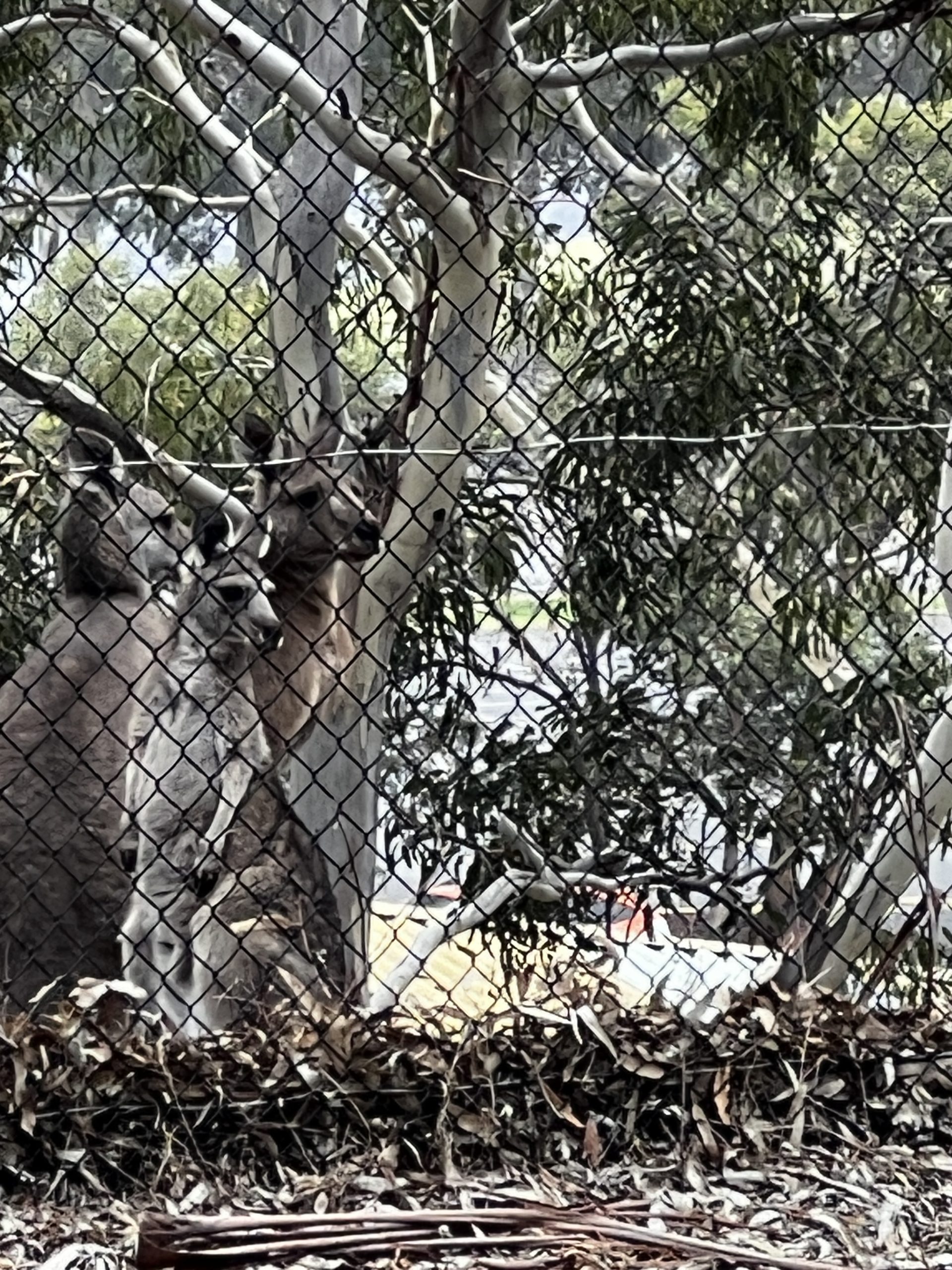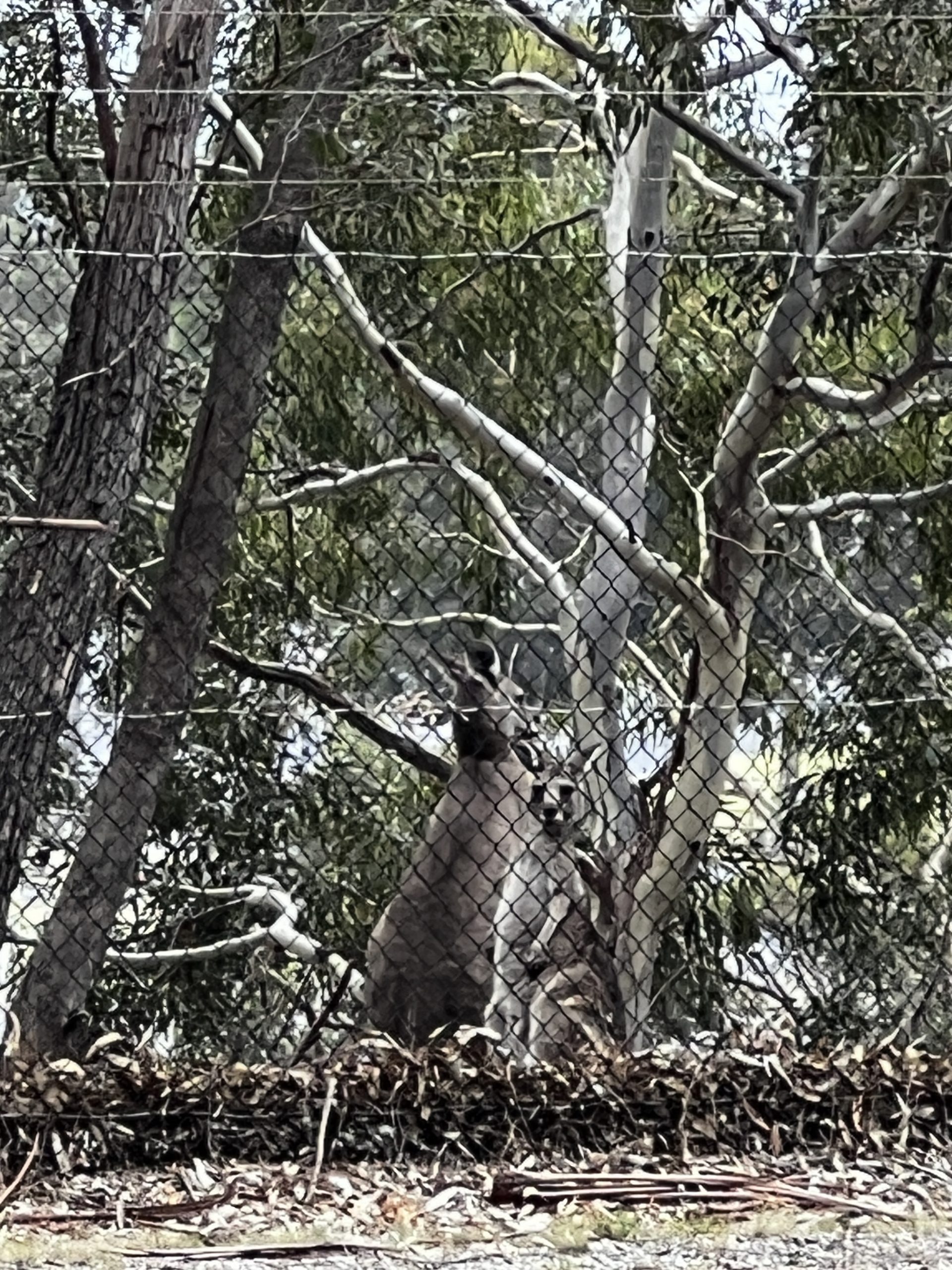 Eigentlich wollten wir in Moe das Kohlekraftwerk näher anschauen, aber es ist kein Rankommen. Es gibt einen riesigen Lookout, mit Grillplätzen, Bänken und Toiletten. Aber er wirkt, wie seit Jahren verlassen und die Bäume rings herum sind inzwischen so groß, dass sie jede Aussicht versperren. Nur ein paar Kängurus schauen interessiert.