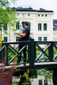 Uns gefiel die Parkanlage sehr gut. Überall schöne Blumen, Teiche mit Springbrunnen und niedliche Brücken. An einer der Brücken schossen wir ein paar Bilder. Gerade als wir damit fertig waren, schwamm auf dem Teich eine kleine Entenfamilie an uns vorbei. Mama Ente und zwei Babyenten. Ella war total fasziniert von den Tieren und freute sich. Wir beobachten eine Weile die Enten und als sie weiter schwammen, gingen wir auch weiter.