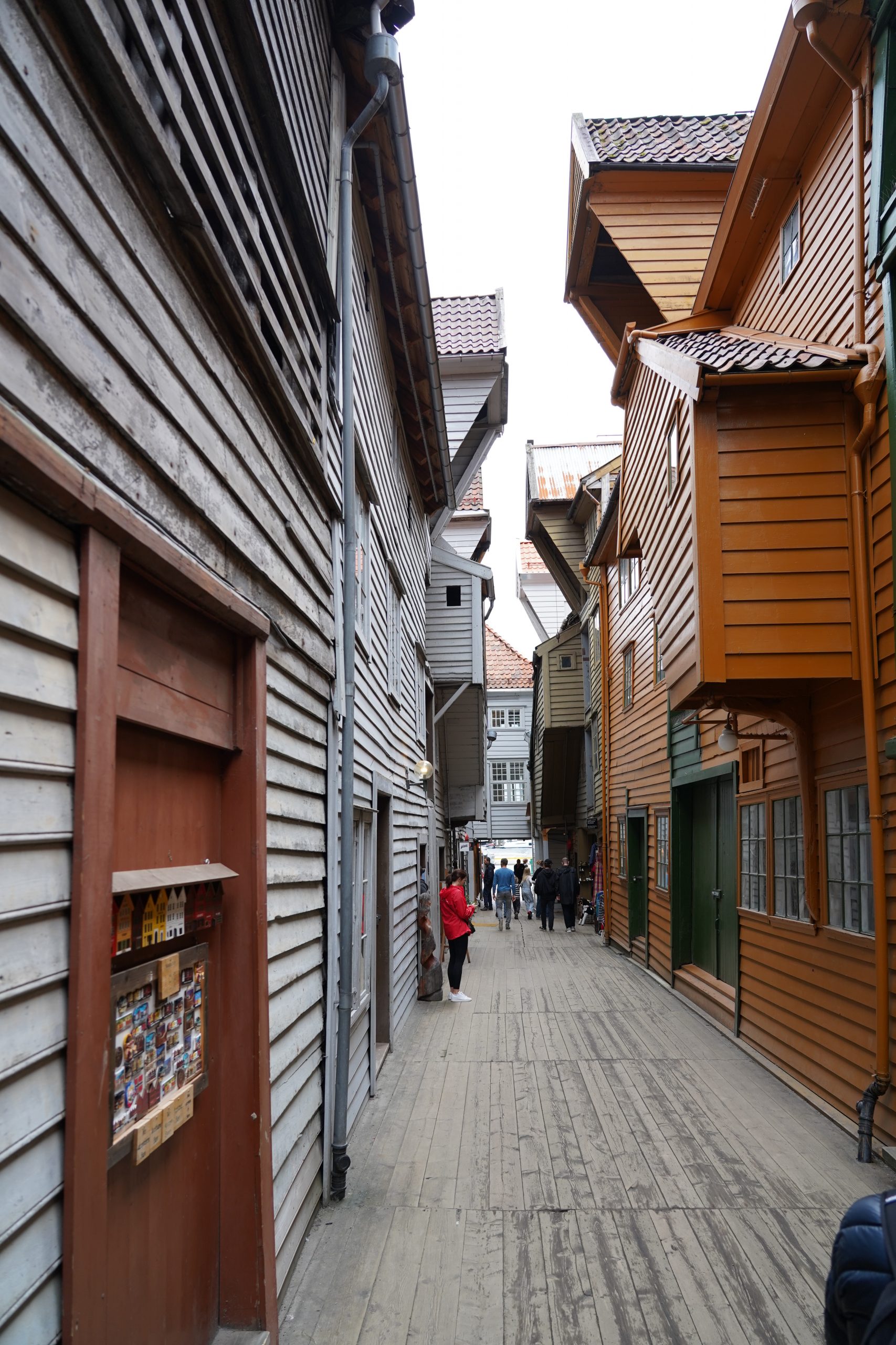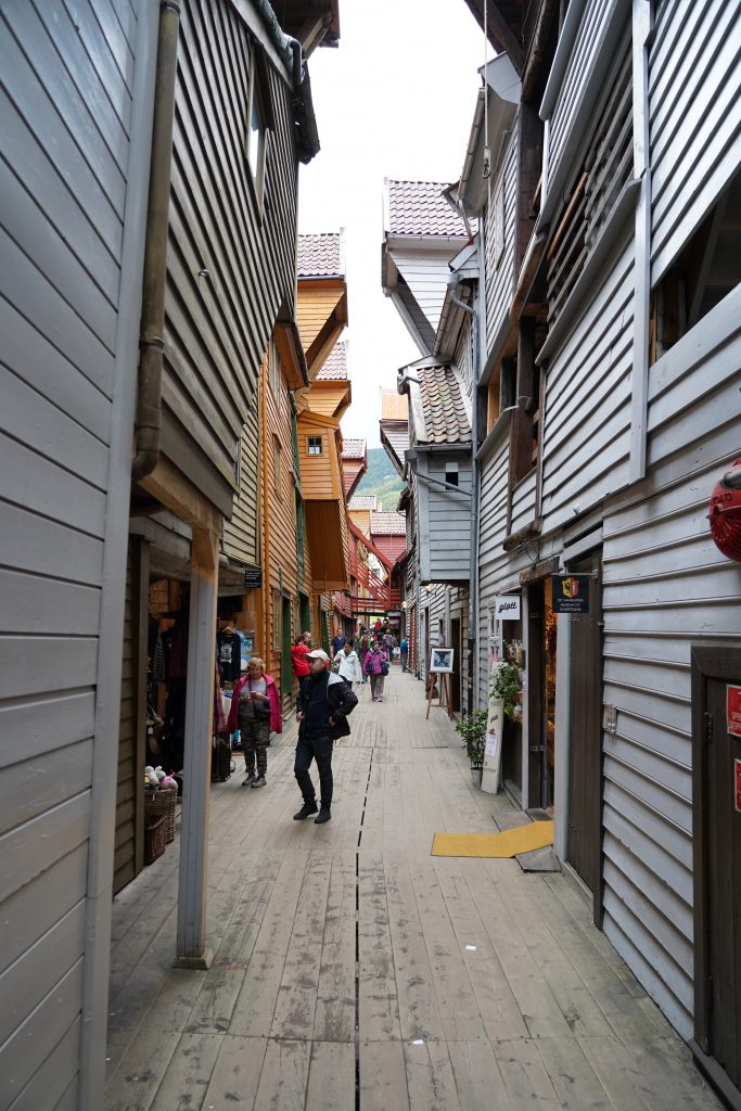 Wir kamen jetzt direkt an „Bryggen“ vorbei und schlenderten durch die Gassen. Eine dieser Gassen erinnerte uns an die Winkelgasse von Harry Potter.