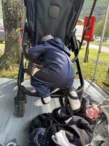 Wir überlegten kurz, ob wir drinnen frühstücken wollen, da es etwas nieselte. Zum Glück hörte es aber wieder auf. Ich zog Ella ihren Anzug und ihren Regenhut an.