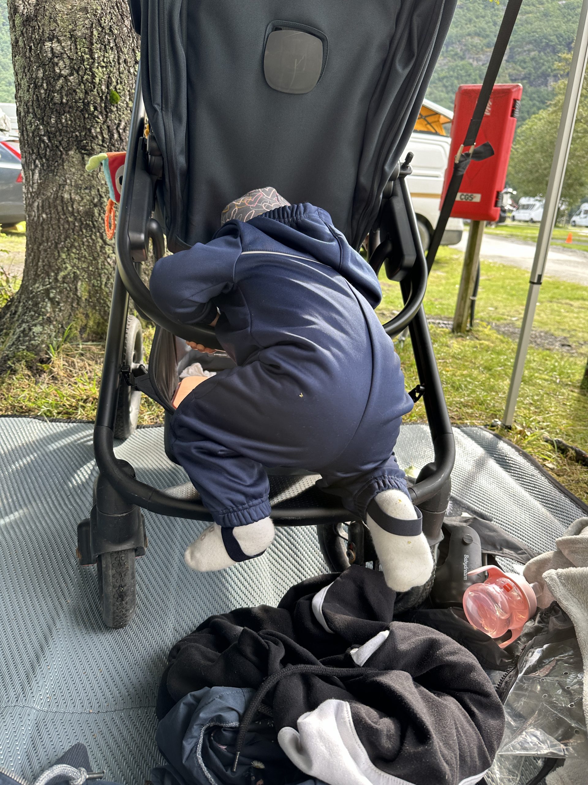 Richtig einkaufen mussten wir auch noch. Auf dem Weg zum Campingplatz kamen wir bei „Joker“ vorbei. Dem wohl einzigem Supermarkt in Geiranger. In diesem Supermarkt gab es von allem etwas. Angelzeug, Campingzubehör, Drogerieartikel und sogar auch Lebensmittel. Am Ende des Einkaufs war unser Korb so voll, dass wir ins Grübeln kamen, wie wir alles zum Wohnwagen transportieren könnten. Zum Glück hatten wir den Kinderwagen dabei. Da die Einkäufe allerdings im Körbchen unten drin keinen Platz mehr hatten, nahm ich Ella auf den Arm und die Einkäufe nahmen ihren Platz ein.