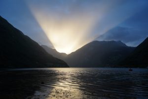 Als wir am Aussichtspunkt Ørnesvingen vorbeikamen, machten wir Halt. Wir genossen eine wunderschöne Aussicht auf Geiranger und dessen Fjord. Nach einem Fußweg von 100 Metern und nochmals 200 Metern, ergaben sich ebenfalls noch wunderschöne Aussichten auf den Fjord. Ella blickte gespannt umher, während Tim sie sicher über den steinigen Weg trug.
