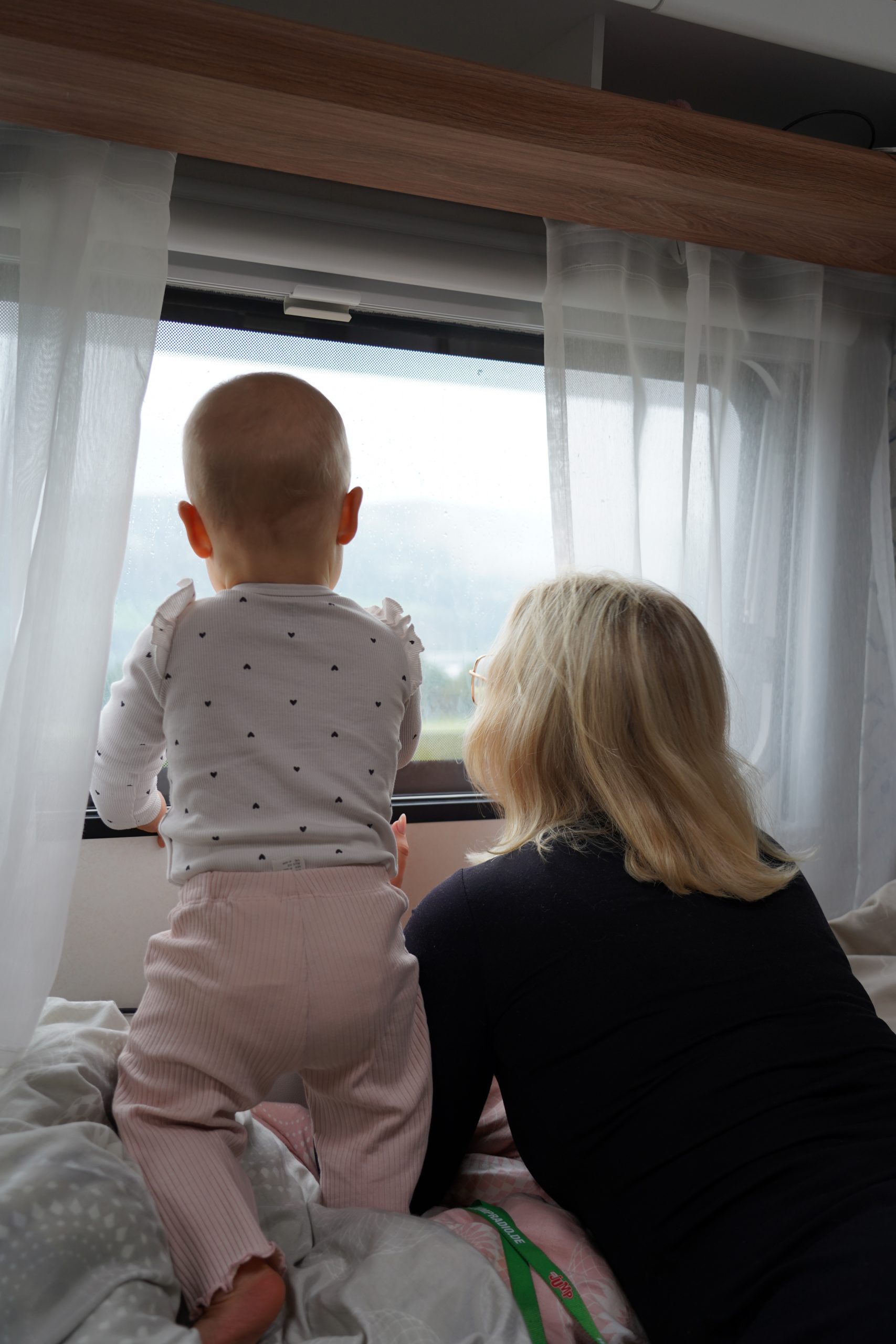 Bevor wir uns auf den Weg zur Schanze machten, gab es Mittagessen und Ella konnte etwas spielen. Sie liebt es aus dem Fenster bei unserem Bett zu schauen.